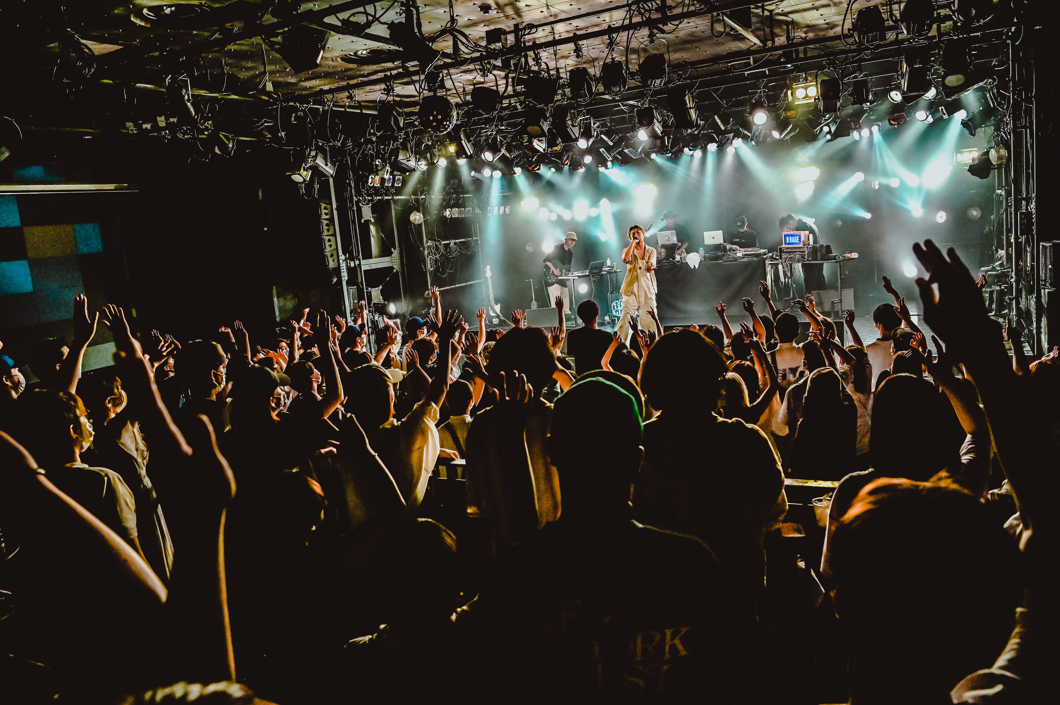 「揺れろ〜や!」と空音が会場を煽った「Young」では、カラフルな照明の演出で盛り上がりは最高潮に。どんどん一体感を増してゆく。年内にリリース予定だという新作アルバムからの先行シングル「B RAGE」では、ステージが暗転したまま叫ばれ、少しダークな雰囲気に。ステージはうっすらとブルーのライトが灯り、高速ラップと鋭いサウンドでグングンと畳みかけ、その迫力にオーディエンスはのめり込んでゆく。