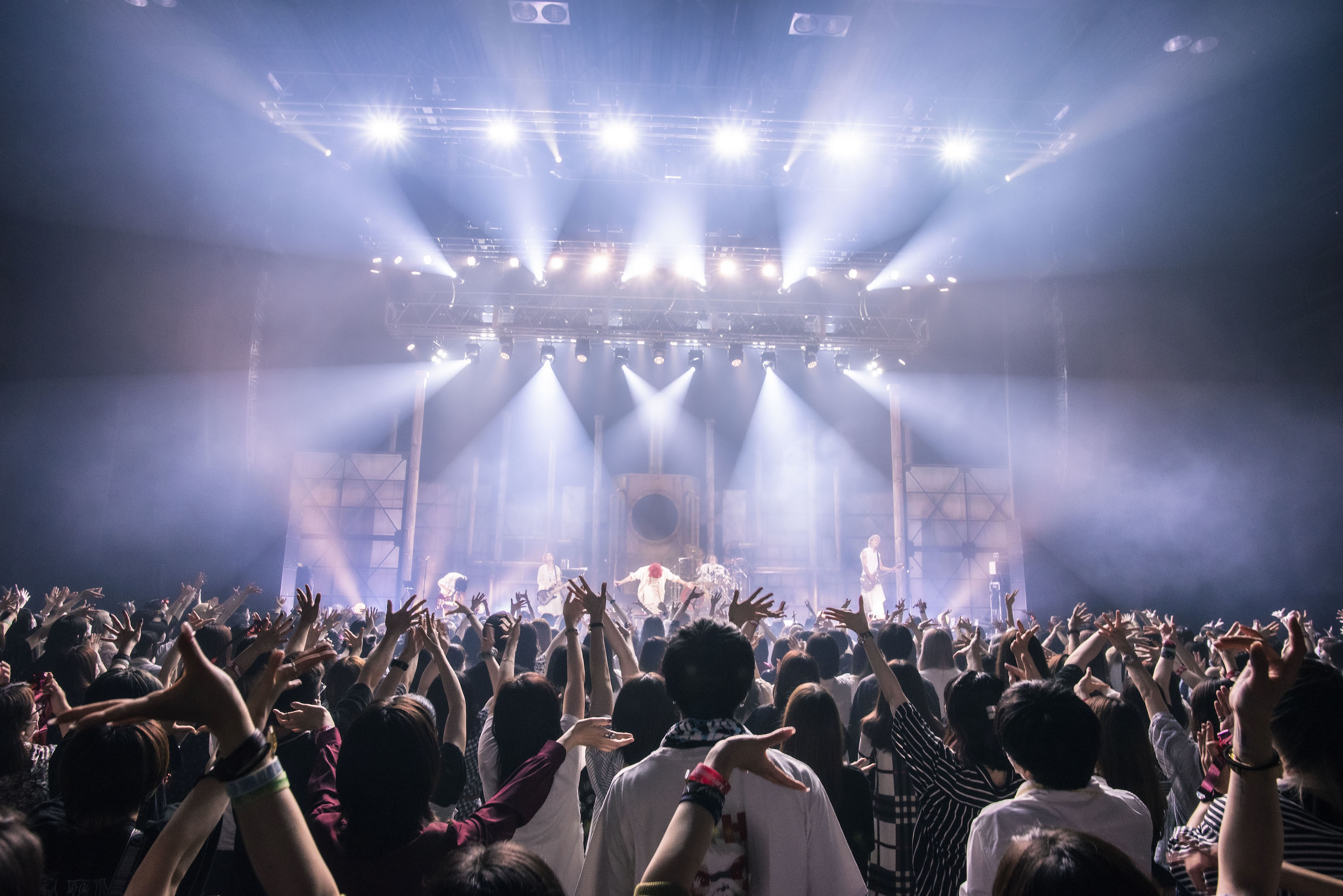 「彩」ではTohya(Dr)のドラムの前にメンバーが集結し、瑠伊(Ba)のベースラインが巨大なうねりとなって会場を飲み込む。海(Gt)のガナり立てるようなシャウトに合わせてジャンプした客席に、フロア全体が大きく揺れていた。「OBLATE SCREEM」では海とYuh(Gt)がギターをエレアコに持ち替え、水の中のような幻想的なライティングの下アコースティックなアレンジを披露した。