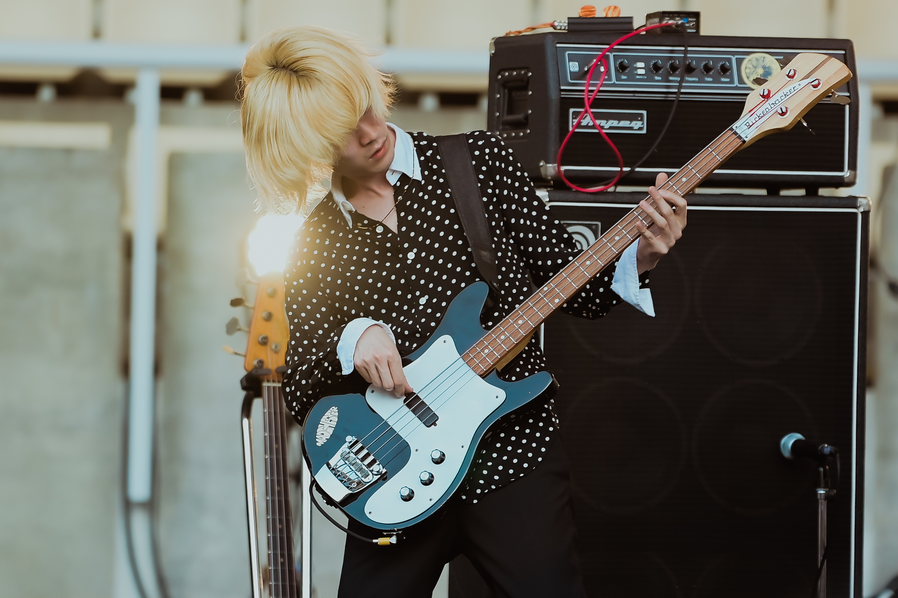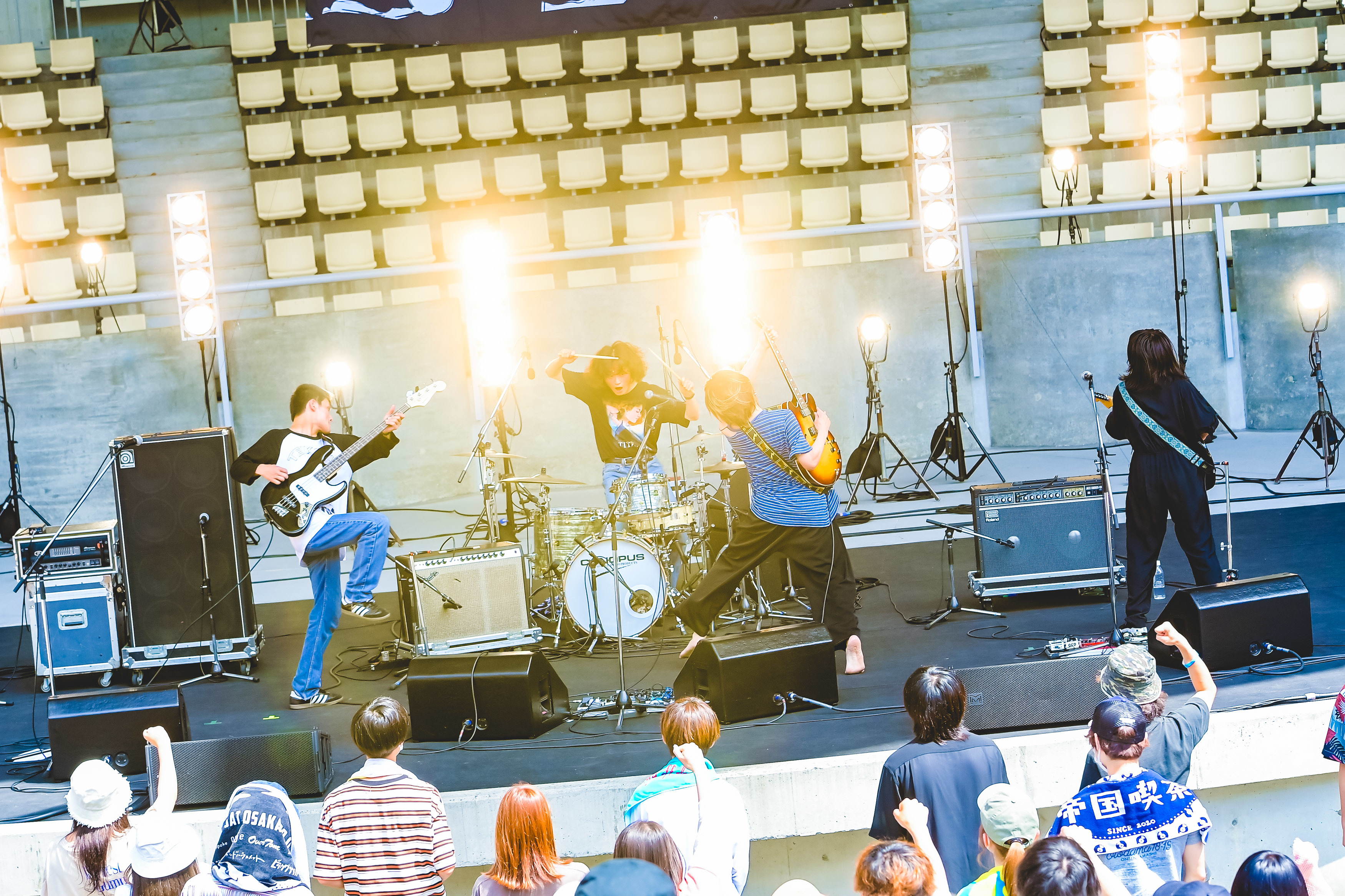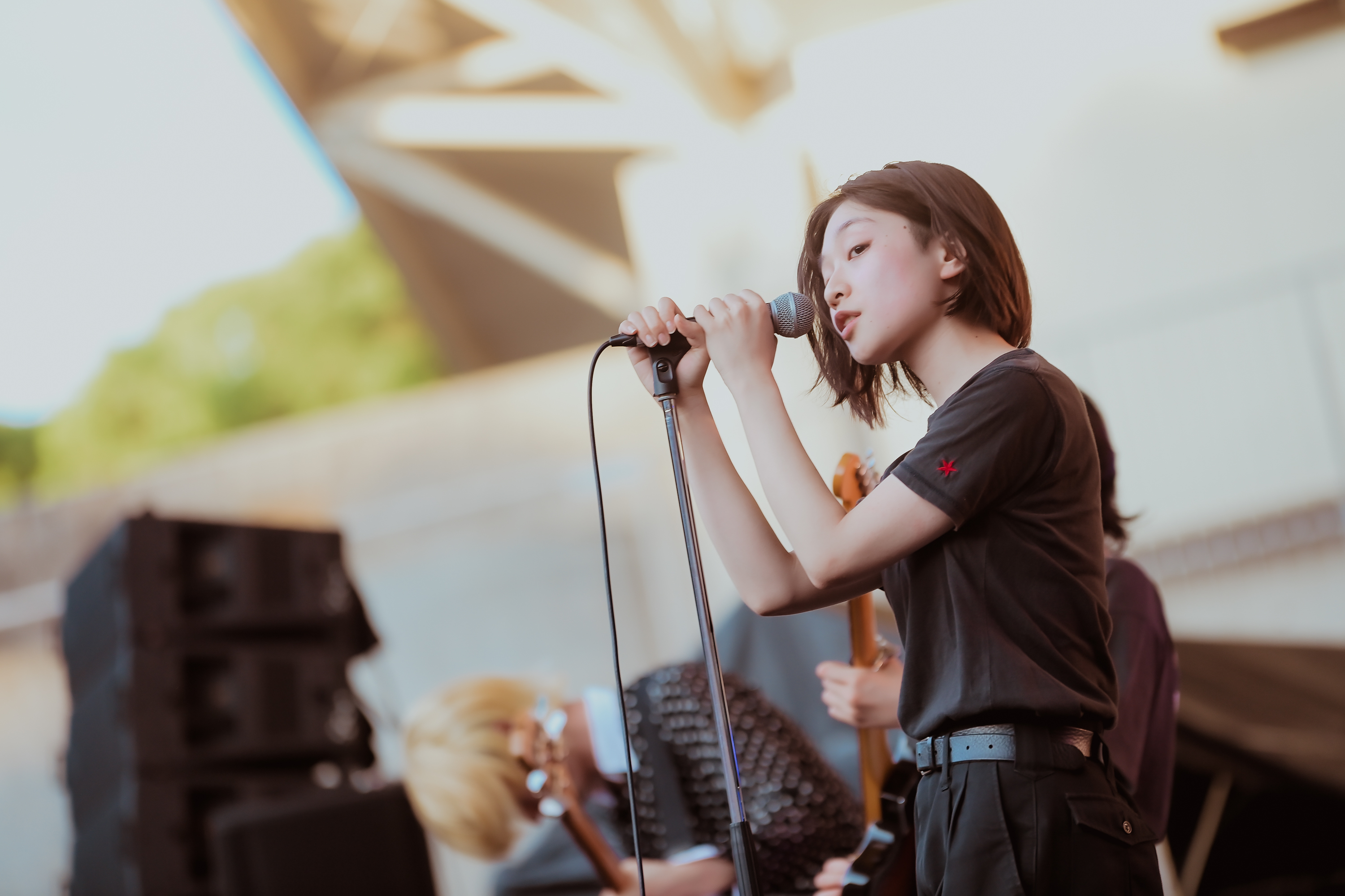そのまま速いカウントから「燦然と輝くとは」という1分11秒のすごい速いナンバーへと突入する。彼らのライブの醍醐味は、ゆっくり緩やかにスタートしながら、気が付くと確実に速度が上がっており、最後はものすごい速さでフィニッシュするところ。この日も、その鉄板の流れでラストナンバー「春風往来」を叩きつけた。杉浦がギターを背中で背負ってハンドマイクで歌う姿には、狂気や色気があり、ぞくっとさせられるが、この陽に照らされた真昼間の野外でも、その魅力は充分に伝わっただろう。満点の野外ライブデビューだった。