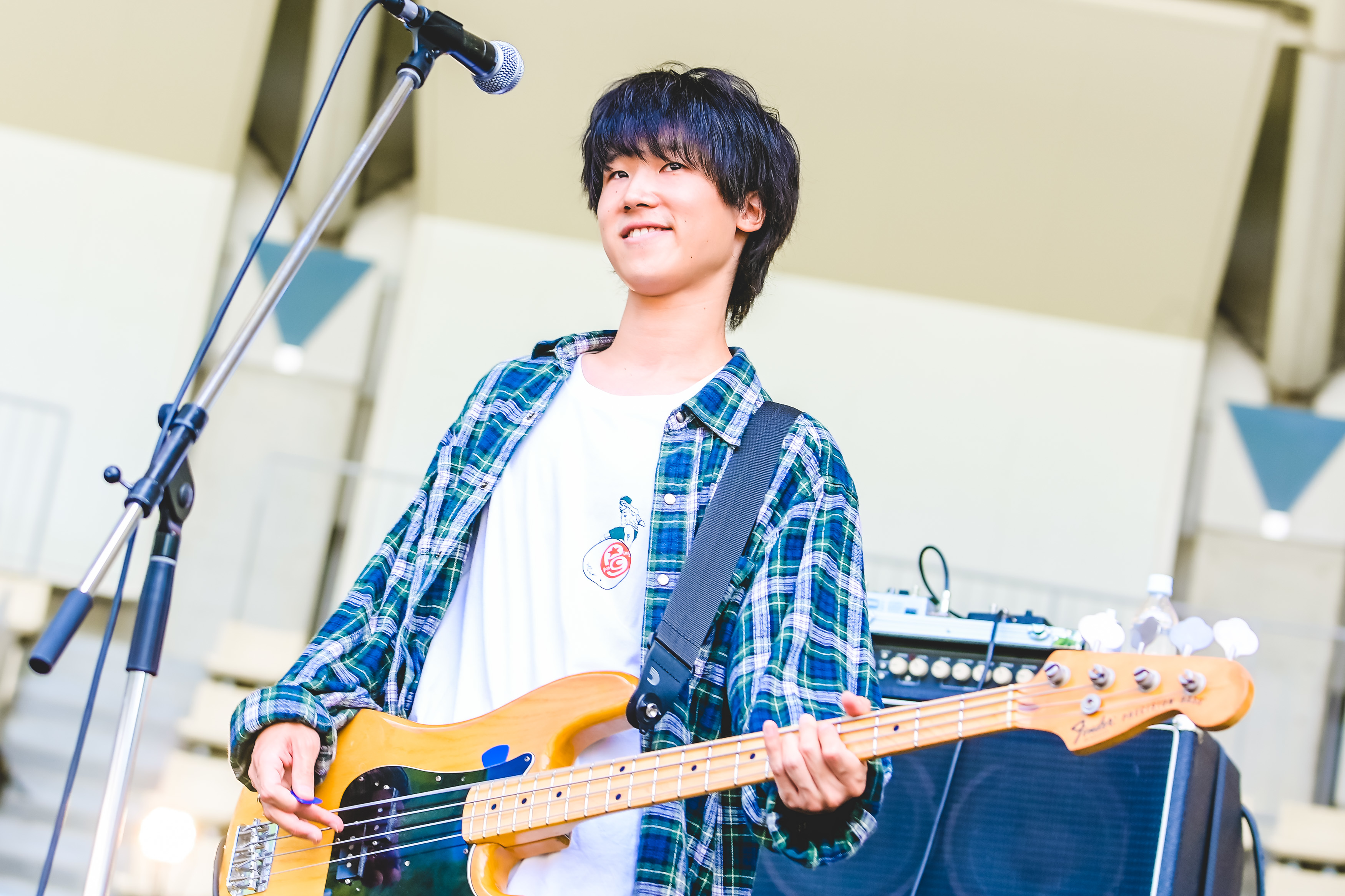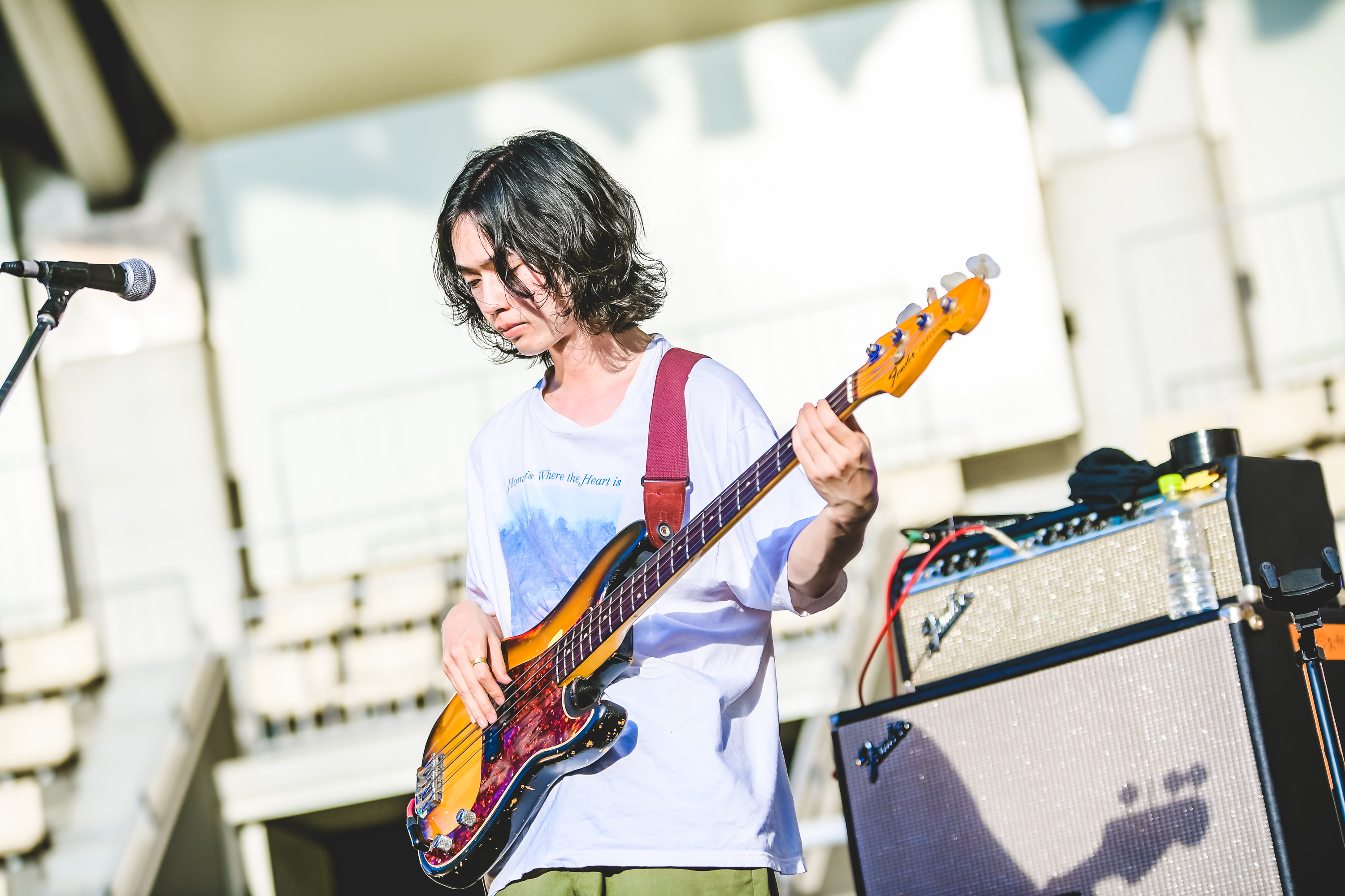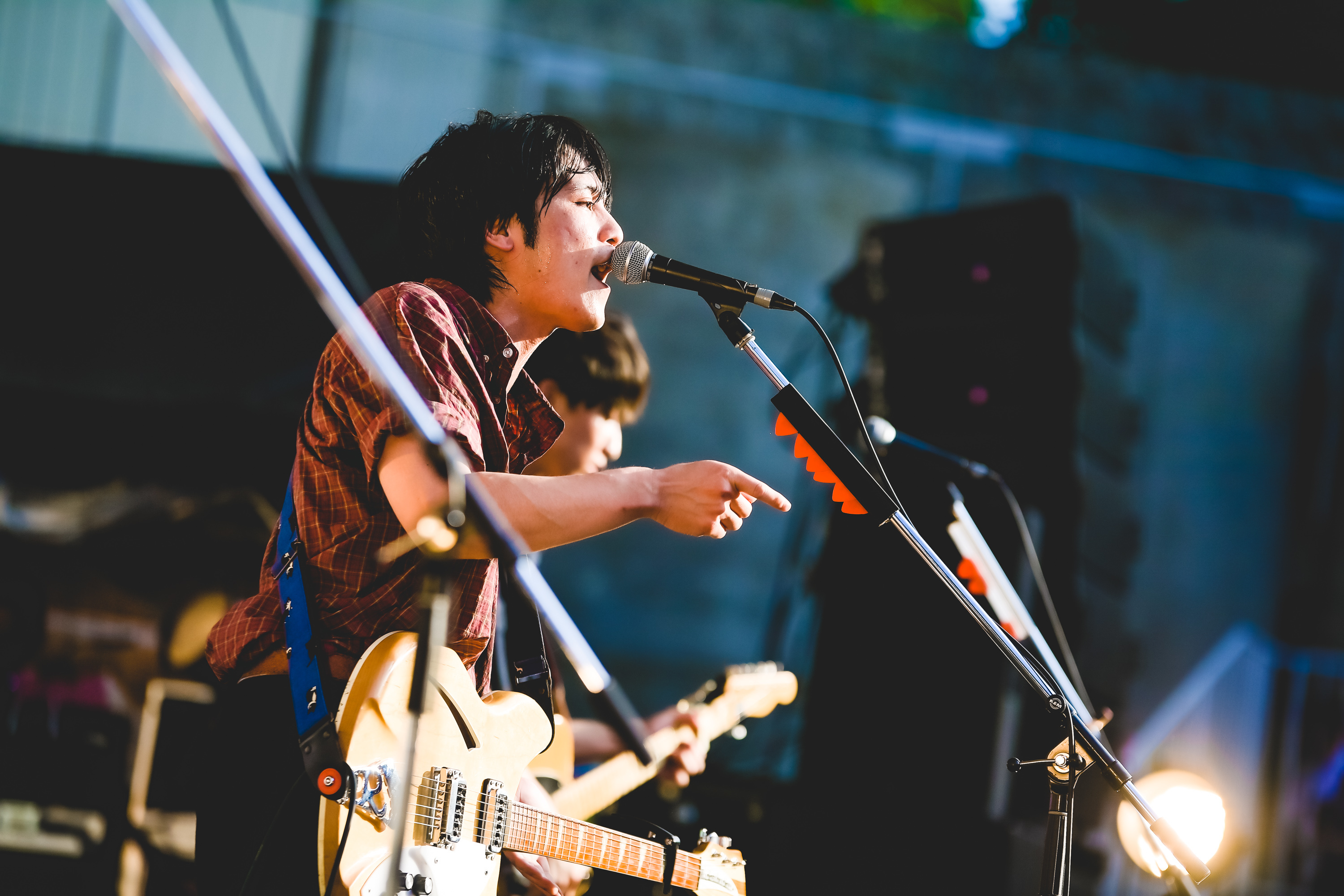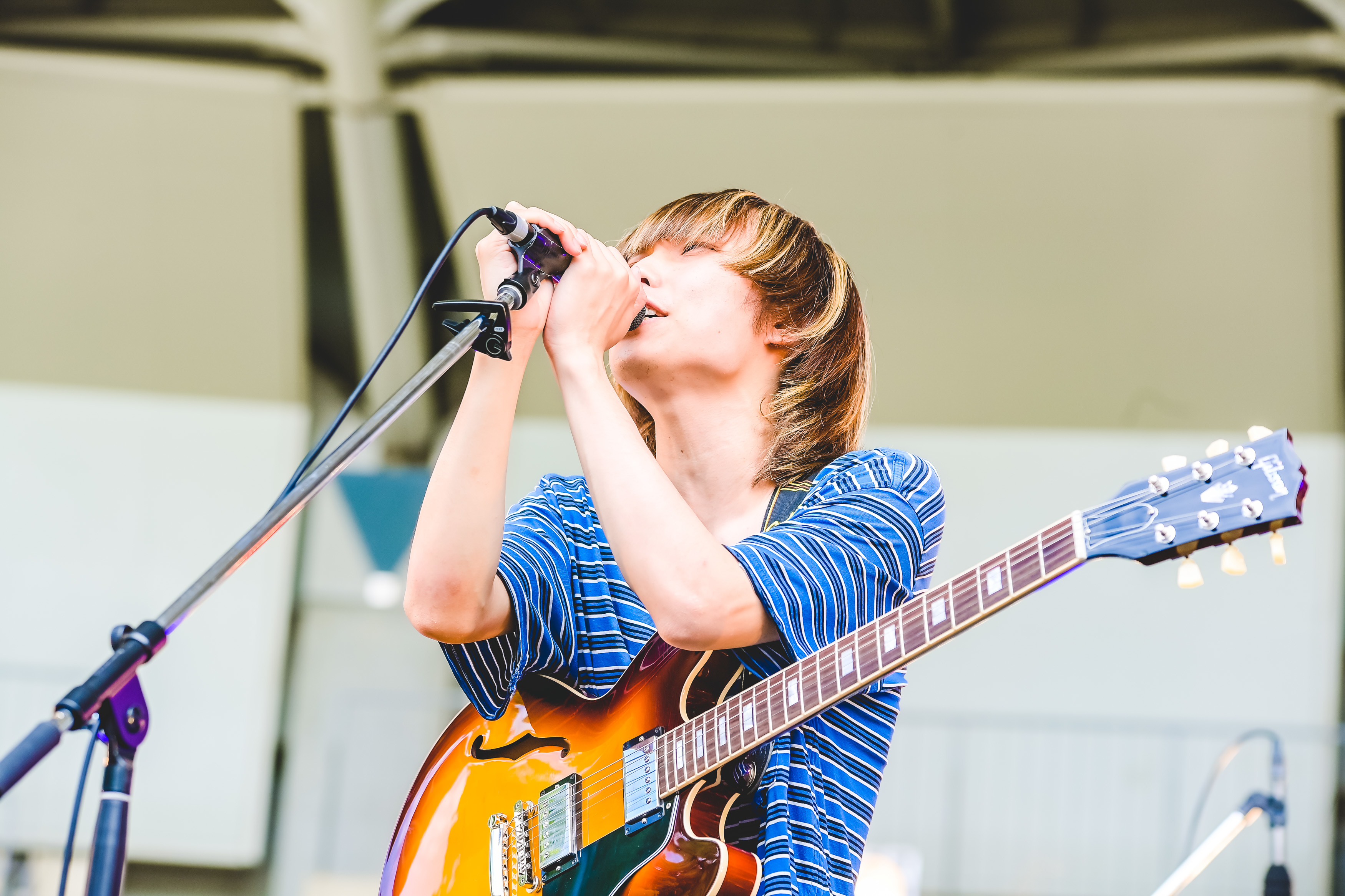 1曲目「貴方日和」と緩やかに始まり、そのままメドレーの様に「心の窓辺」へと繋がれる。よく見るとボーカルの杉浦祐輝(Vo.Gt)は裸足で歌っていた。だから何だという話だが、そんなちょっとした事からも、先程のApes同様、彼からも何事にも動じない慌てない威風堂々さを感じる。去年8月、大学のサークル活動以外での初ライブを経験した杉浦。その初ライブから観ているが、とても舞台度胸があり、何よりも声が伸びやかに響きまくる。青空に吸い込まれるなんて、よく常套句の様にライブレポートで書かれるが、そんなもんを通り越して、もはや杉浦の歌声は青空に突き刺さっていた。