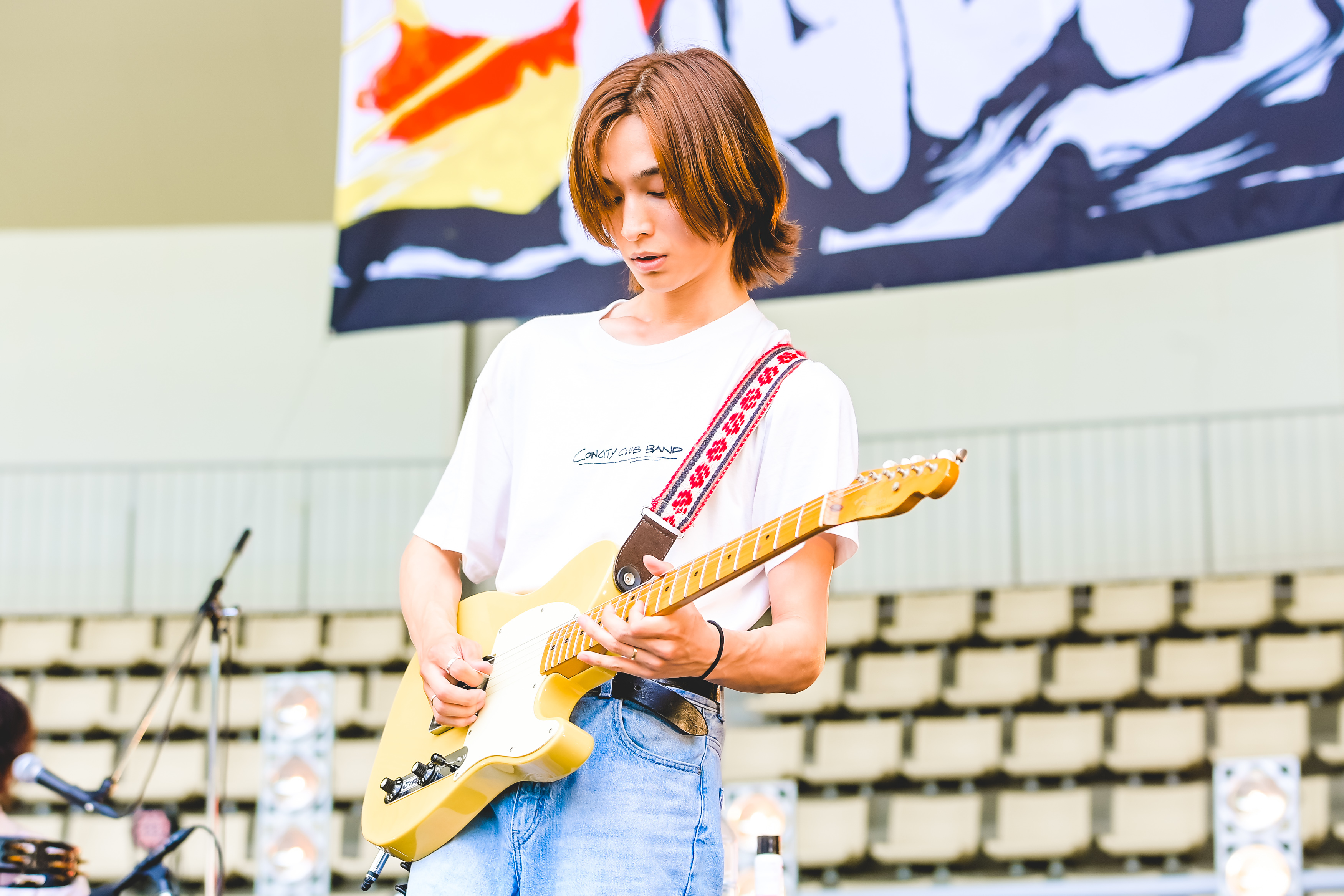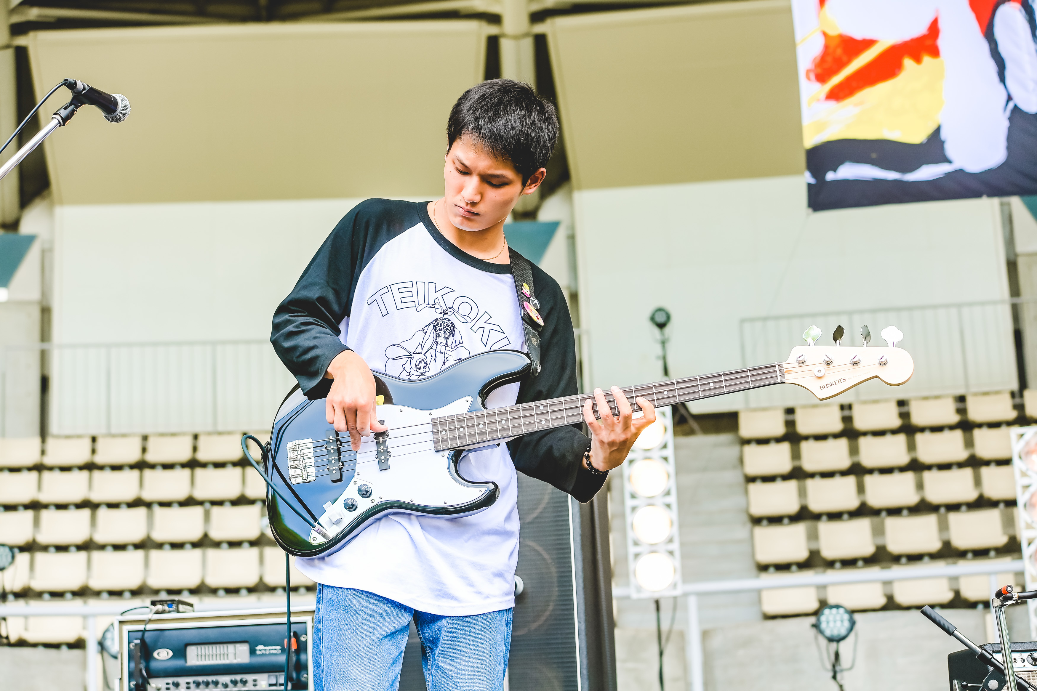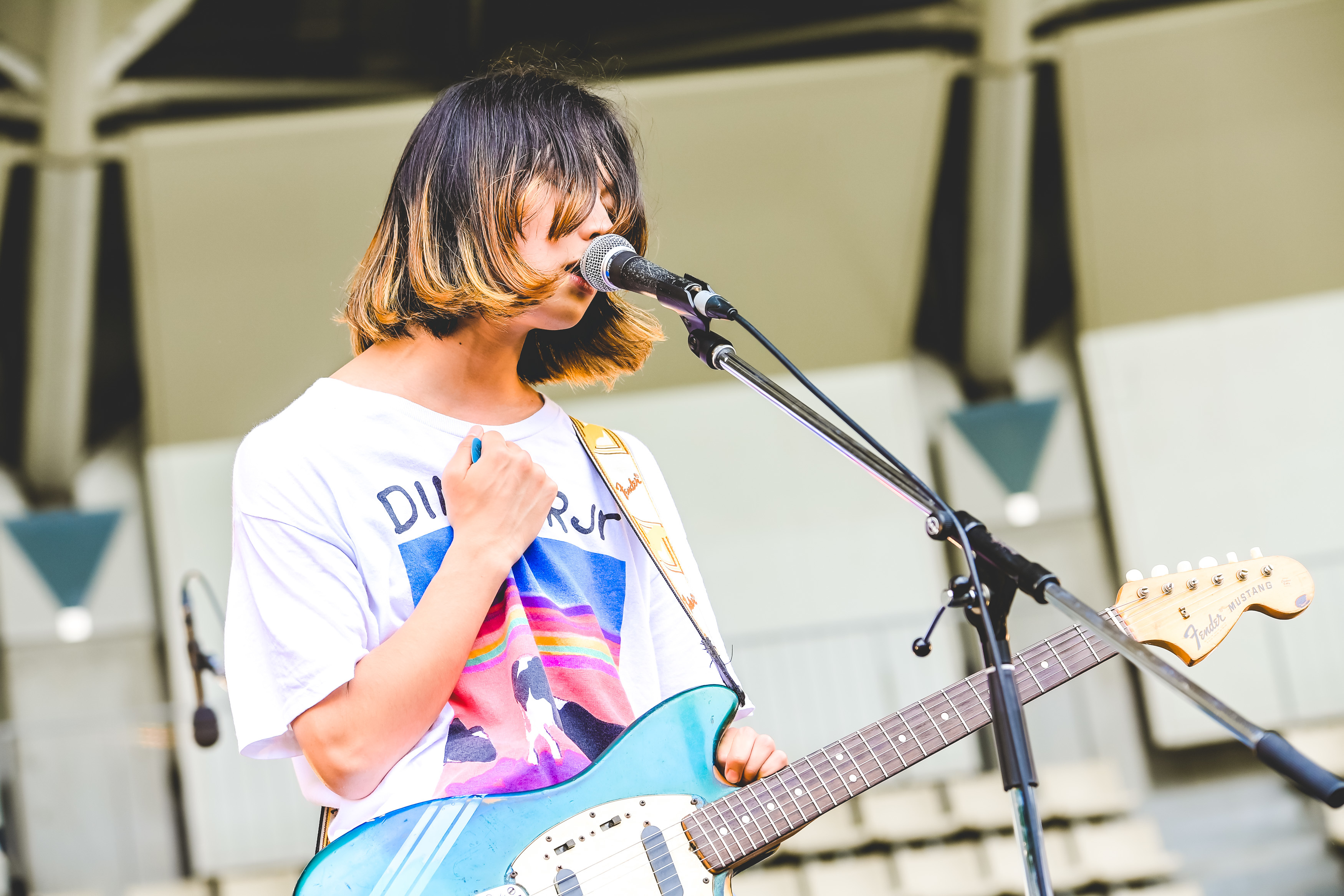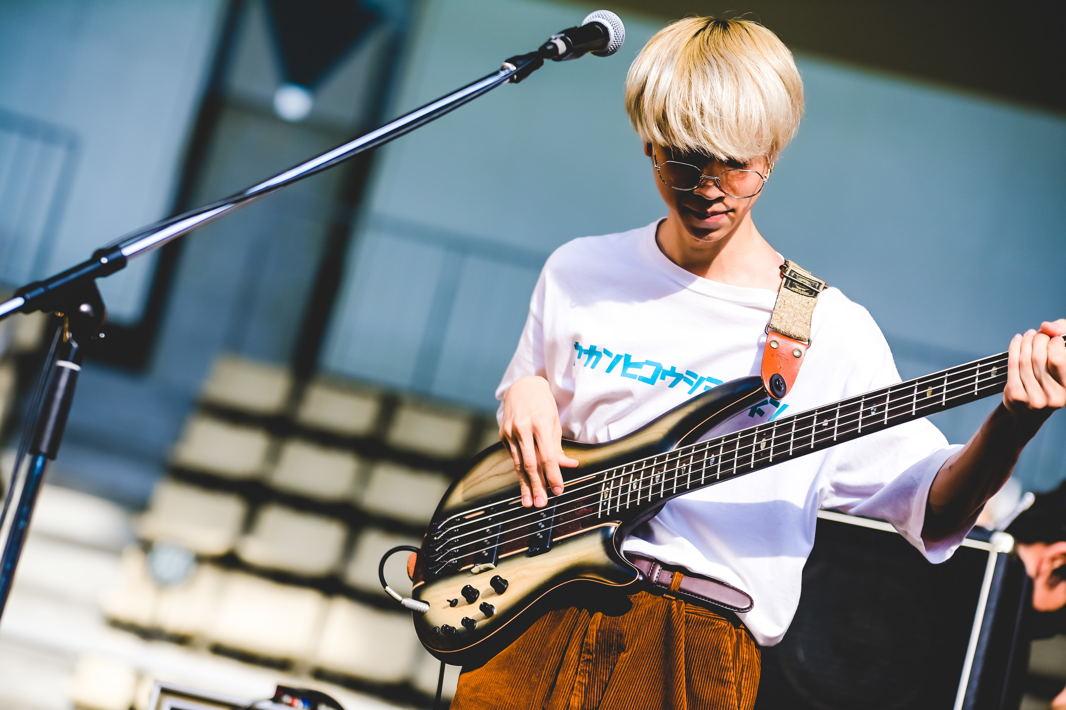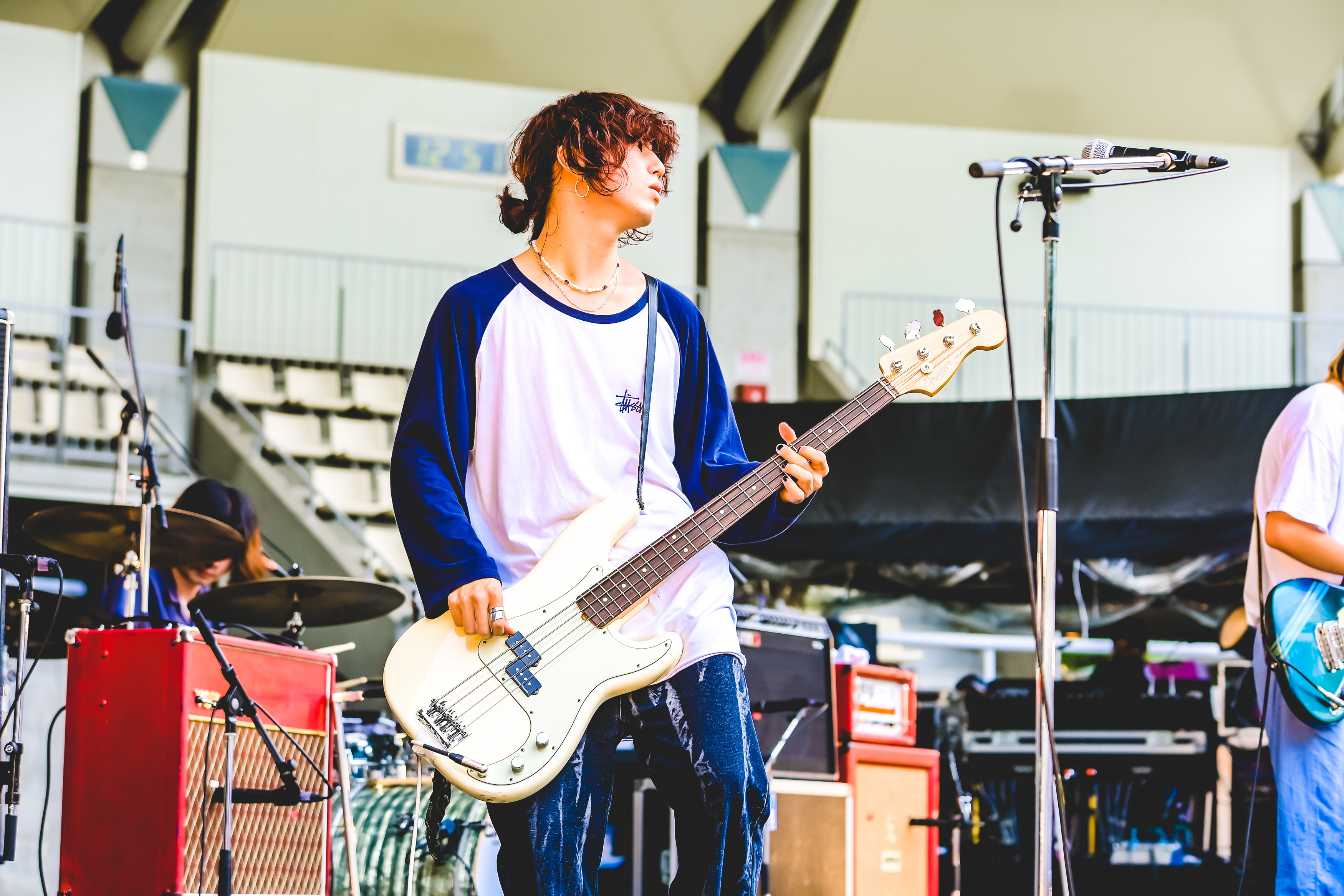 1曲目「貴方日和」と緩やかに始まり、そのままメドレーの様に「心の窓辺」へと繋がれる。よく見るとボーカルの杉浦祐輝(Vo.Gt)は裸足で歌っていた。だから何だという話だが、そんなちょっとした事からも、先程のApes同様、彼からも何事にも動じない慌てない威風堂々さを感じる。去年8月、大学のサークル活動以外での初ライブを経験した杉浦。その初ライブから観ているが、とても舞台度胸があり、何よりも声が伸びやかに響きまくる。青空に吸い込まれるなんて、よく常套句の様にライブレポートで書かれるが、そんなもんを通り越して、もはや杉浦の歌声は青空に突き刺さっていた。