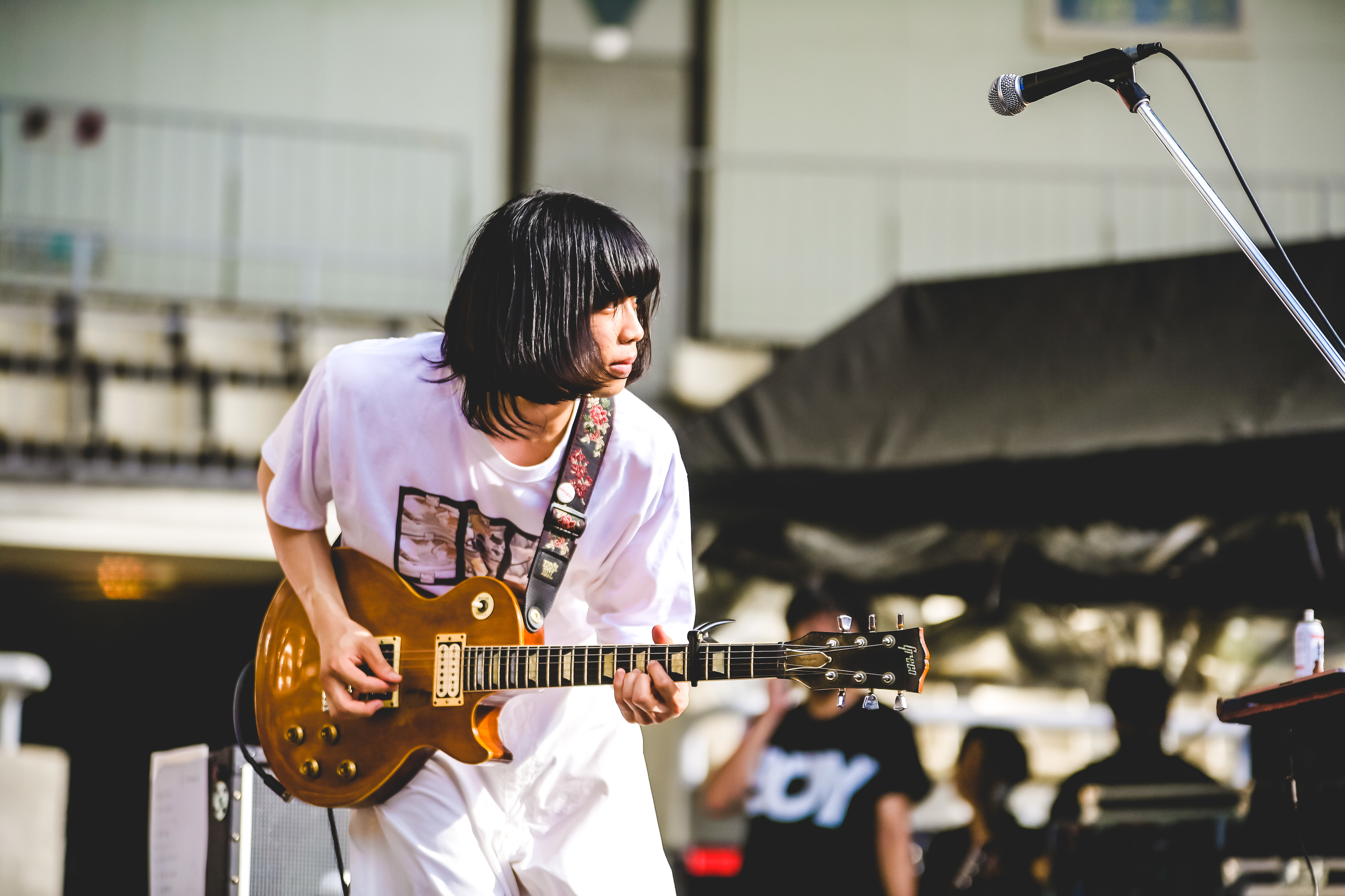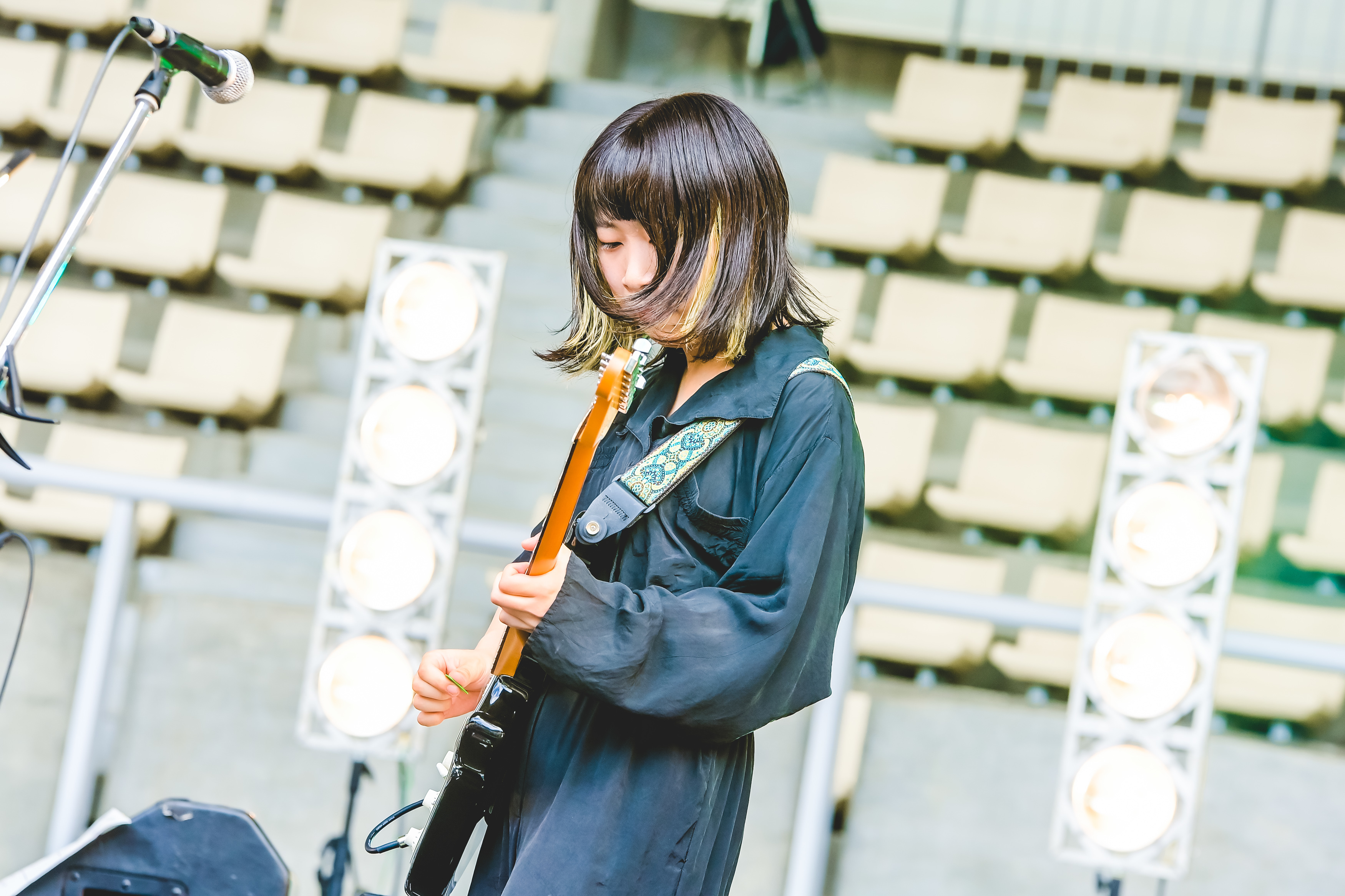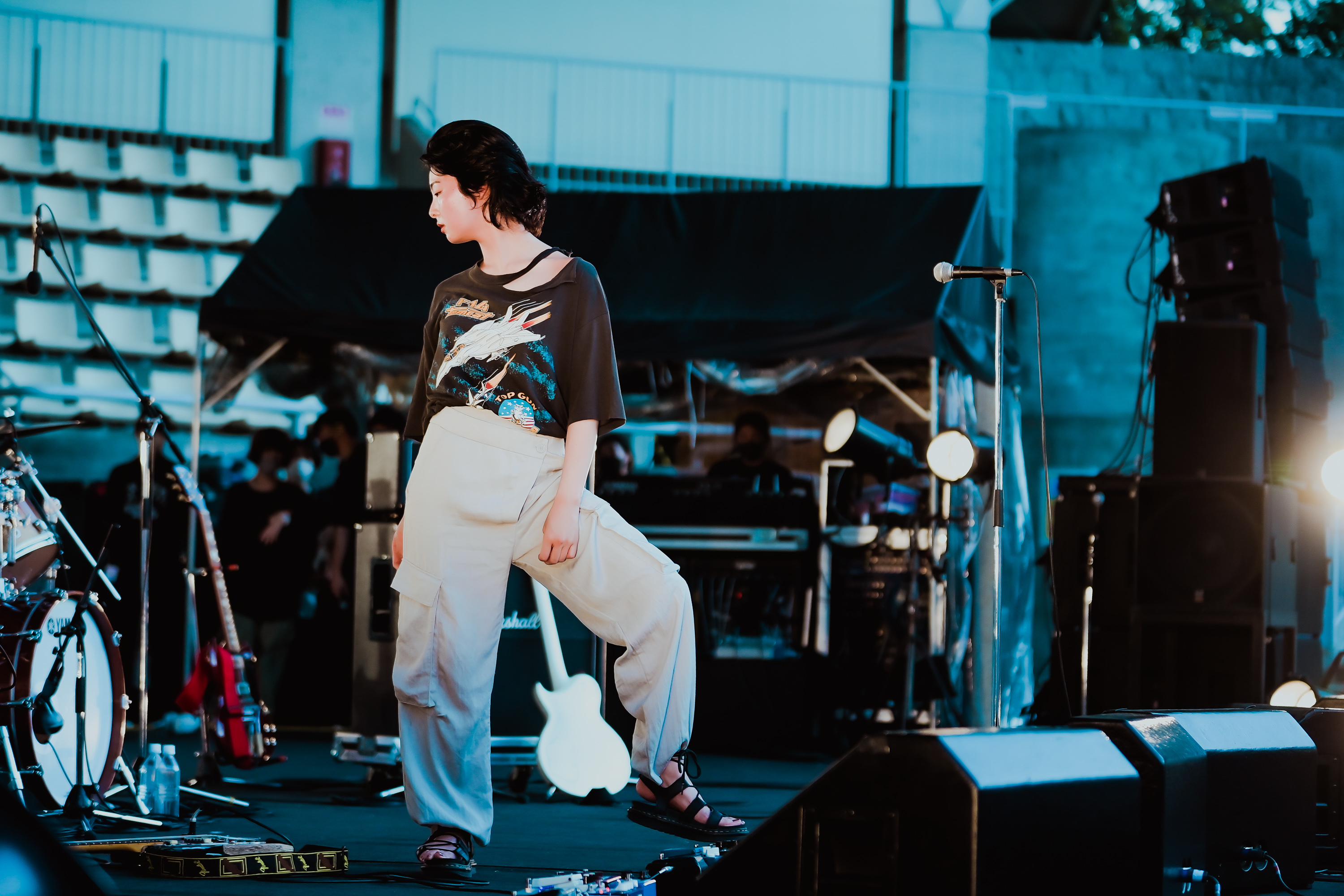 MCでは「(昼間のように)暑かったら、私たちは出られなかったね」(毛利)なんて、ちゃめっ気ものぞかせる彼女たち。続く「スクーター」では、健やかなアンサンブルが日が落ちて過ごしやすい時間となった野音によくフィット。毛利は透明感をたたえつつも凛としたボーカルで場を鼓舞する中、出色は最後を飾った「ランドリー、銀色の日」だった。激しさを増す音がじわじわと高みへといざない、一人ずつメンバーが退場。残ったChamicotがギターを歪ませ、底抜けにエモーショナルなエンディングに。始終規格外の音像で、揺らし踊らせ魅了したステレオガールで、宴は幕を降ろした。