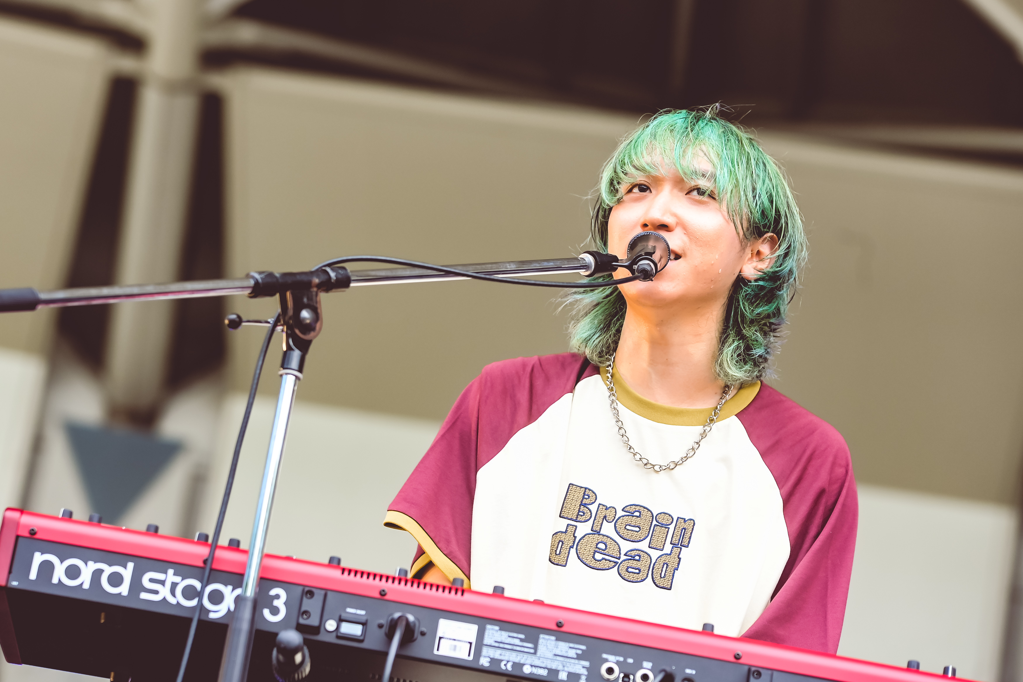 MCでは、「音出しの時点で汗まみれで。こうなったらステージをビチョビチョにして帰ります!」(スズキユウスケ、以下同)とはにかむ。「タルパ」でも熱量たっぷりに全身で体現しつつ、芝生エリアに視線を移せば、ゆらゆらとオーディエンスが踊る、何とも多幸感に満ちた光景が広がる。そのマジカルな空気を増幅させるように、「キンモクセイ」では極上のポップネス&センチメンタルな表情を見せつけていく彼ら。