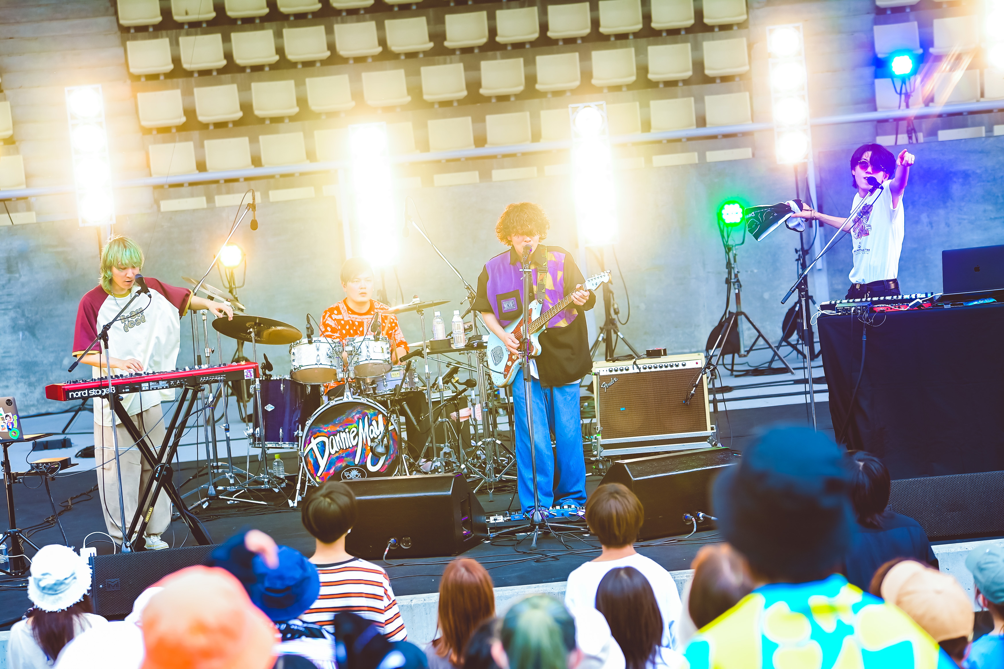 4番手はDannie May。マサ(Vo.Gt)、田中タリラ(Vo.Key)、Yuno(Vo.Kantoku)と3人共にボーカルであり、同期サウンドも操りながら、サポートドラムと音を鳴らしていく。1曲目「灰々」から一聴して、お洒落なサウンドであり、見た目も素晴らしくポップであり、これまでの3バンドのスタイルとは、同じバンドでありながら全然違う。だからこそ、絶対的に視界に入ってくる。