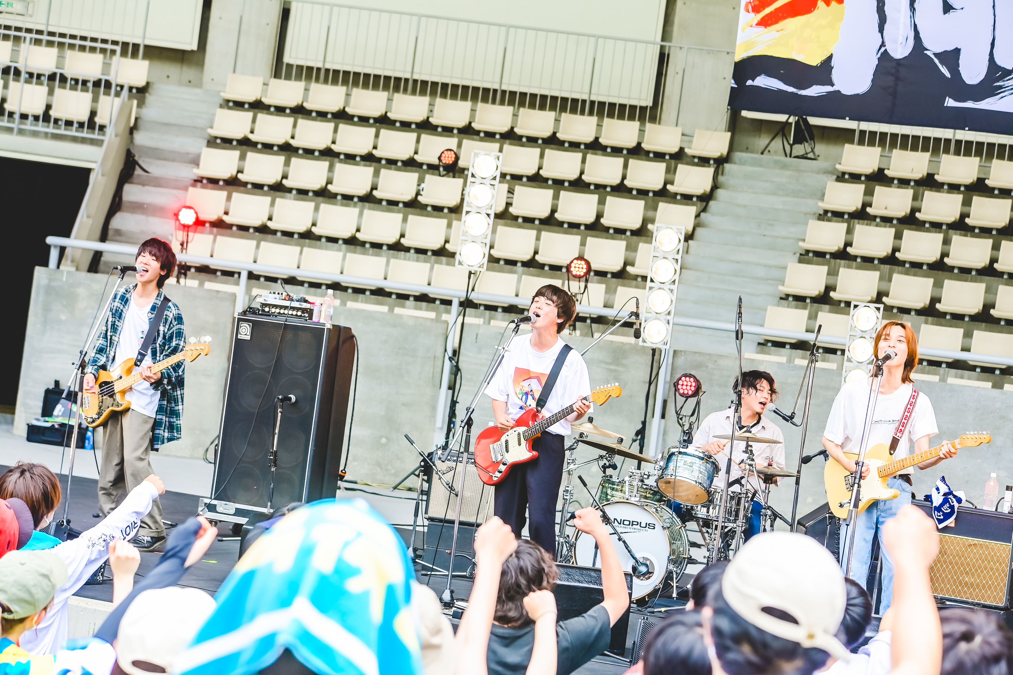 ミドルテンポながら厚みある音が疾走感を生む「どことなく君は誰かに似ている」を経て、「久々に北摂に帰ってこられたので、ぴったりな曲をやろうかなと」(四方颯人・Vo)という「ただいま」へ。シンプルなビートと共に、アコギの温かな音色が何とも心に染み入る。さらにギアを上げていくように「Airride」では言葉のリフレインに心地よく脳内を占拠され、ラスト「Life Goes On」では幾重にも重なる音と声のレイヤーで大きな一体感を生み出した彼ら。ポップな包装紙を破れば、その実像は美しくナイーブな心象風景が広がっていた……そんなYAJICO GIRLのステージだった。