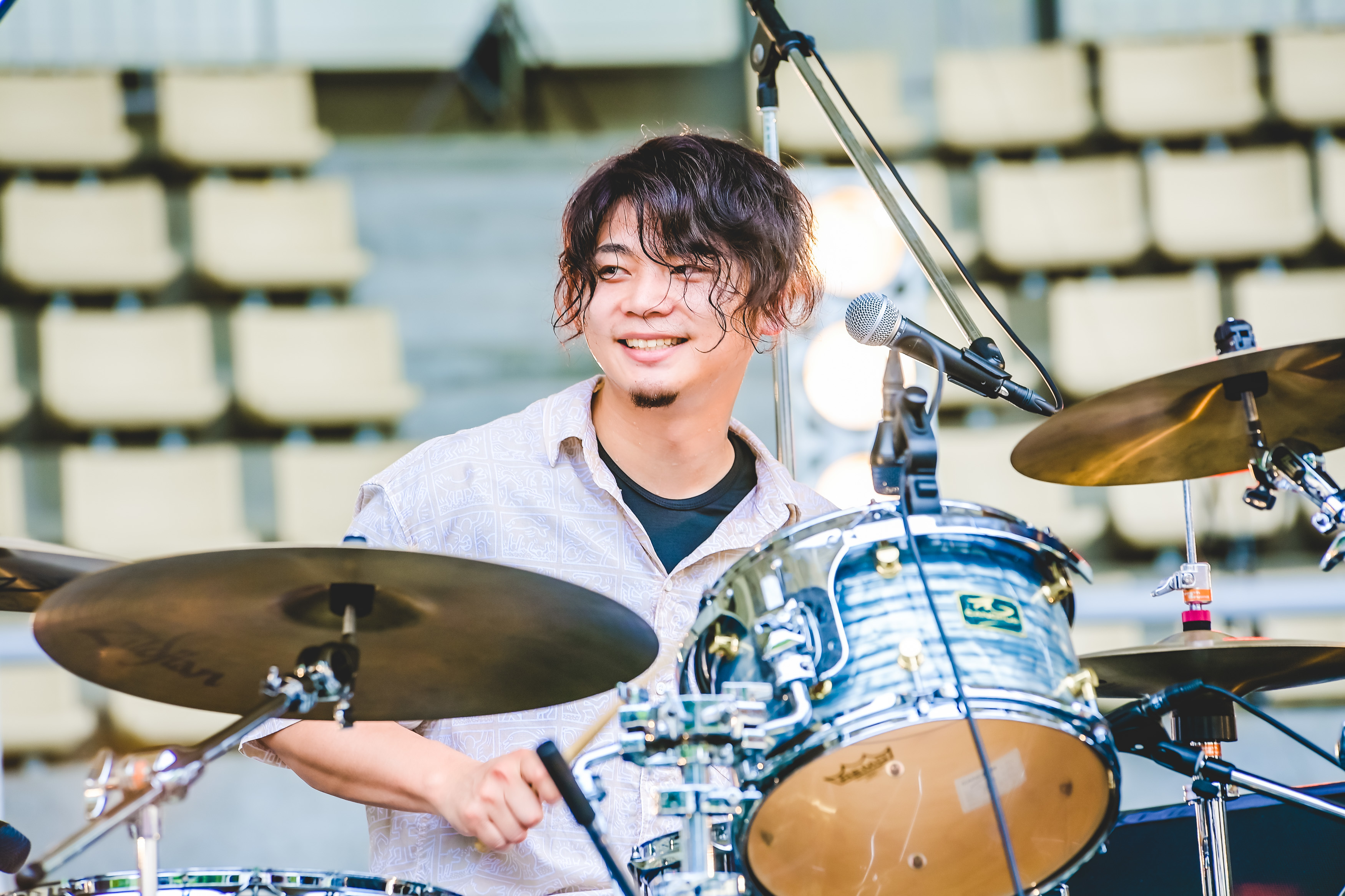 初野外の彼らだが、4人全員で大声で歌ったりと、とにかく伸び伸びしている。「暮らすこと」では演奏に合わせて、観客に指パッチンを促す。依然としてコロナ禍の中とはいえ、ここ2年と比べると状況はかなり良くなってきているが、まだまだ大きな声を観客は出せない。