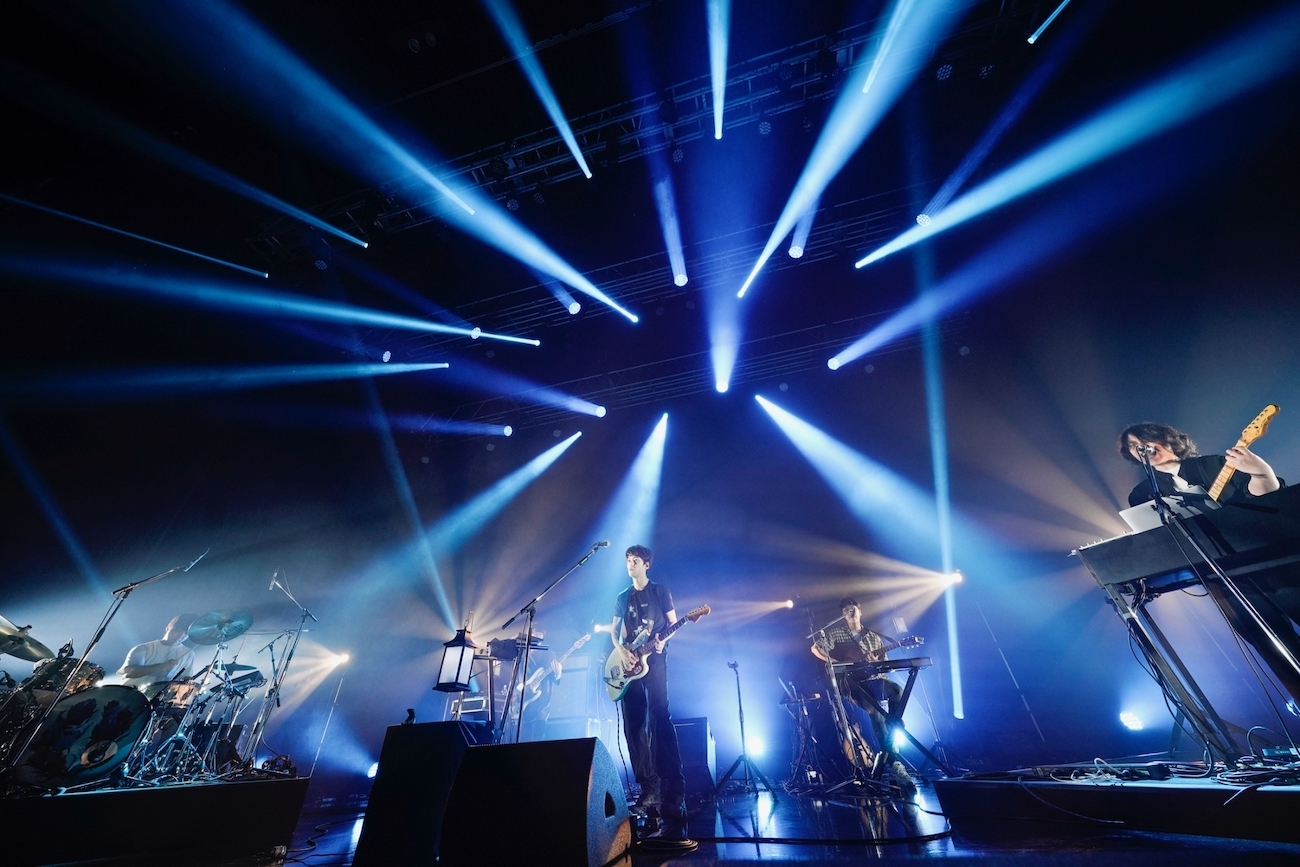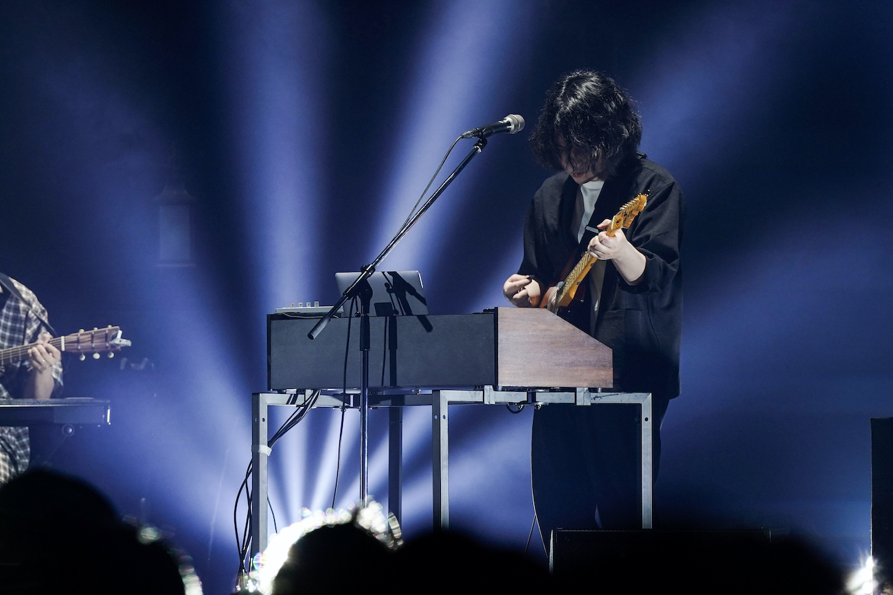 開演と同時に漆黒に近い暗闇に飲み込まれる。虚空にいるような気分から、雄貴の鍵盤の弾き語りから始めた「月の靴」でライブハウスにいる現実に戻された。グッとフィジカル強めのライブアレンジに変更されたアンサンブルは海のうねりにも似た「流氷」へ。客席から見て右から雄貴、岩井郁人(Gt/Key)、DAIKI(Gt)、岡崎真輝(Ba)、尾崎和樹(Dr)の横一列のセッティングはすっかり定着したようだ。トリプルギターでありつつ、ギターだけが前面に出ることなく、繊細な抜き差しを聴かせる。新曲である「サラブレッド」はひときわオーセンティックなギターバンドの逞しさを体現していて、〈生きる理由を言葉にはしない方がいい それは姿を変えて 死神となり追いかけてくるから〉という予言めいた歌詞にも力強さと洞察を与えていた。