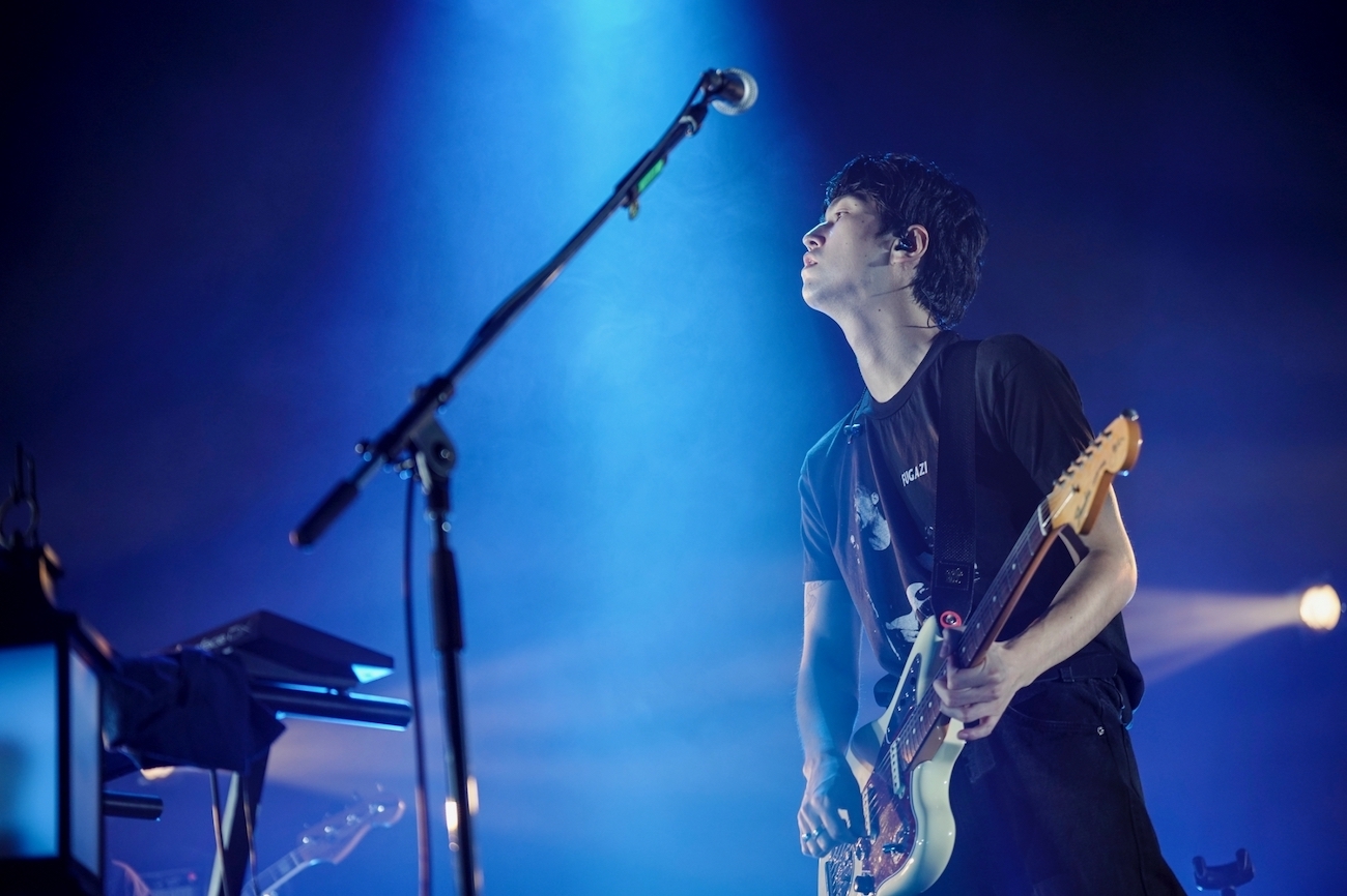 ラテンのようなリズムに乗り全ての音が輝く「花のように」で命の輝きそのものを鳴らし、「死神」では〈誰かのために真っ赤なマタドールのように感情に向き合〉っている。死神をなんとかいなすマタドールというわけだ。異なる時期に書かれた曲が響き合うように聴こえる。さらに『BBHF1 -南下する青年- 』の中でもタフな旅の途中を思わせる「N30E17」の誰もいない広い空間に向けて、自分自身を確認するためにロングトーンを発するような雄貴の声は圧巻だったし、冷たい空気のようなDAIKIのギターサウンドは他の何物にも替え難かった。それだけに、続く楽曲がグッとフィジカルの強さで押すアレンジで更新された「なにもしらない」だったことが胸を打つ。強力な白いバックライトがフロアを照らし、一編の映画を見るような心地に浸っていたオーディエンスを今ここに肉体とともに呼び戻された感じだ。この演出も見事だった。