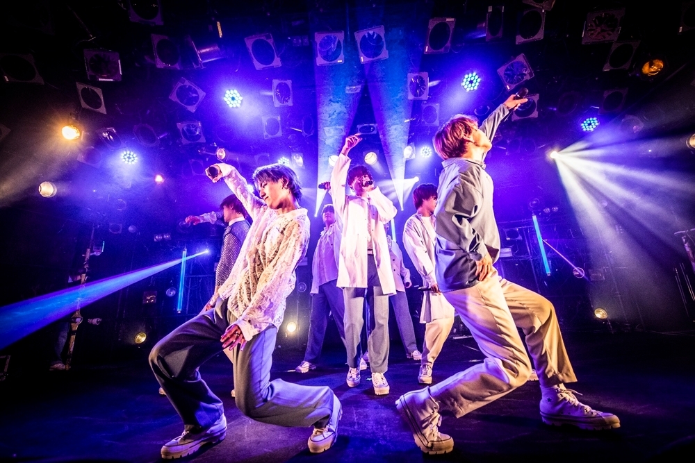 そうして、SEに導かれ、照明でブルーに染まったステージに「BLUE DAISY」の衣装を着た7人がオンステージ。「AWAKE」で幕開けしたライブ。まずフロアとメンバー、その近さに驚かされる。7人の誰かと目が合いそうな至近距離だからこそ、新メンバー、従来のメンバーの“個”がはっきりと浮き彫りになっていく。7人になったことで、これまではみんなでドライブダンスを楽しむパーティーチューンだった「We Like Party」は、曲中HIROTOとMASAKIがKEYをリフトしてフロントに出てくるというダイナミックな振り付けが加わり、新たな見せ場が誕生。「Pain」や「Mirage」もラップパートが倍増するなど、既存曲のほとんどは振り付け、ラップが7人ver.にリアレンジされていて、曲が始まるたびにハッとさせられるほど新生IVVYは新しく生まれ変わり、進化したグループになっていた。
