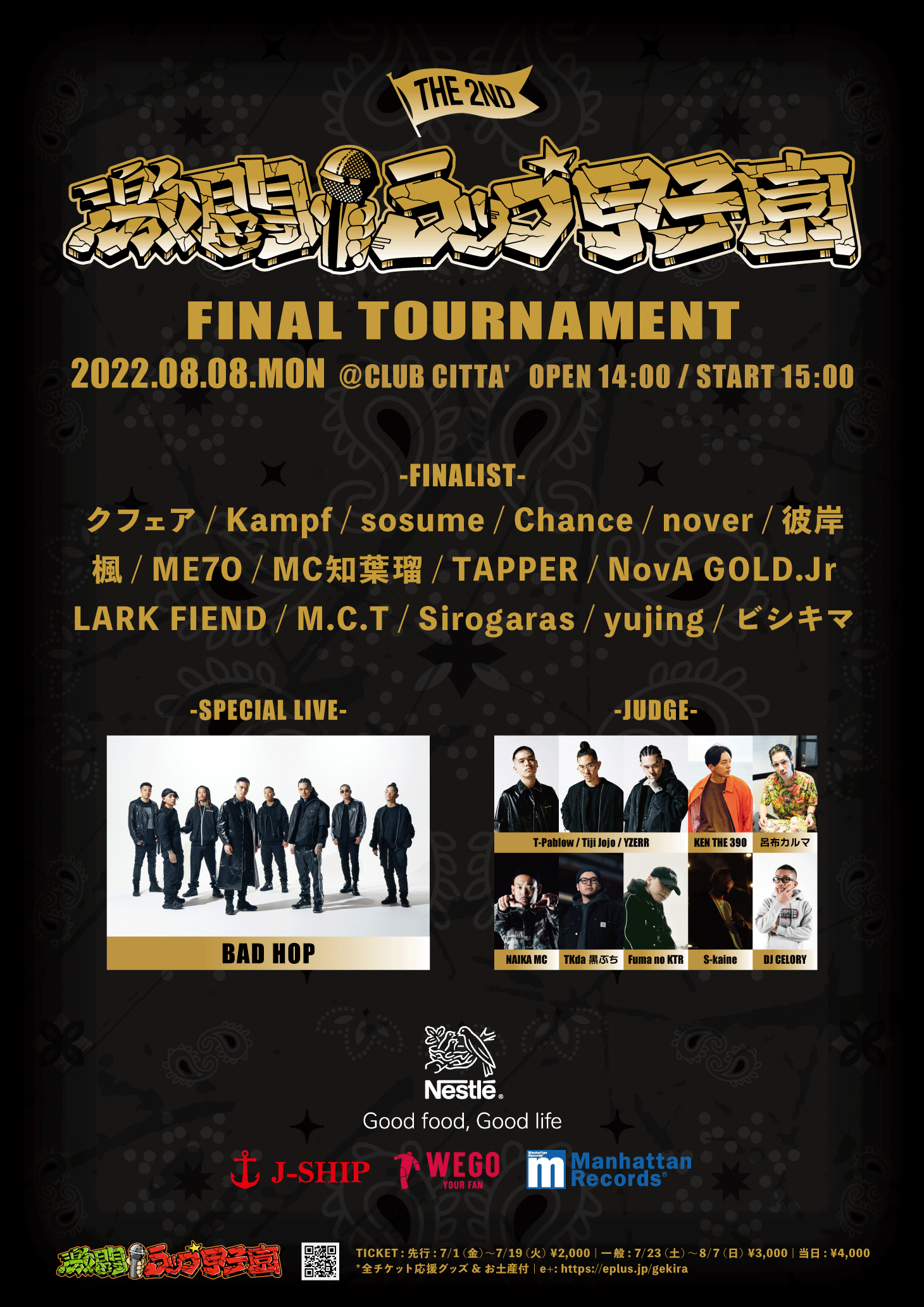 8月8日(月)に開催する、フリースタイルバトルの甲子園『第2回 激闘!ラップ甲子園 -FINAL TOURNAMENT-』のSPECIAL LIVE GUESTにBAD HOPの出演が決定した。