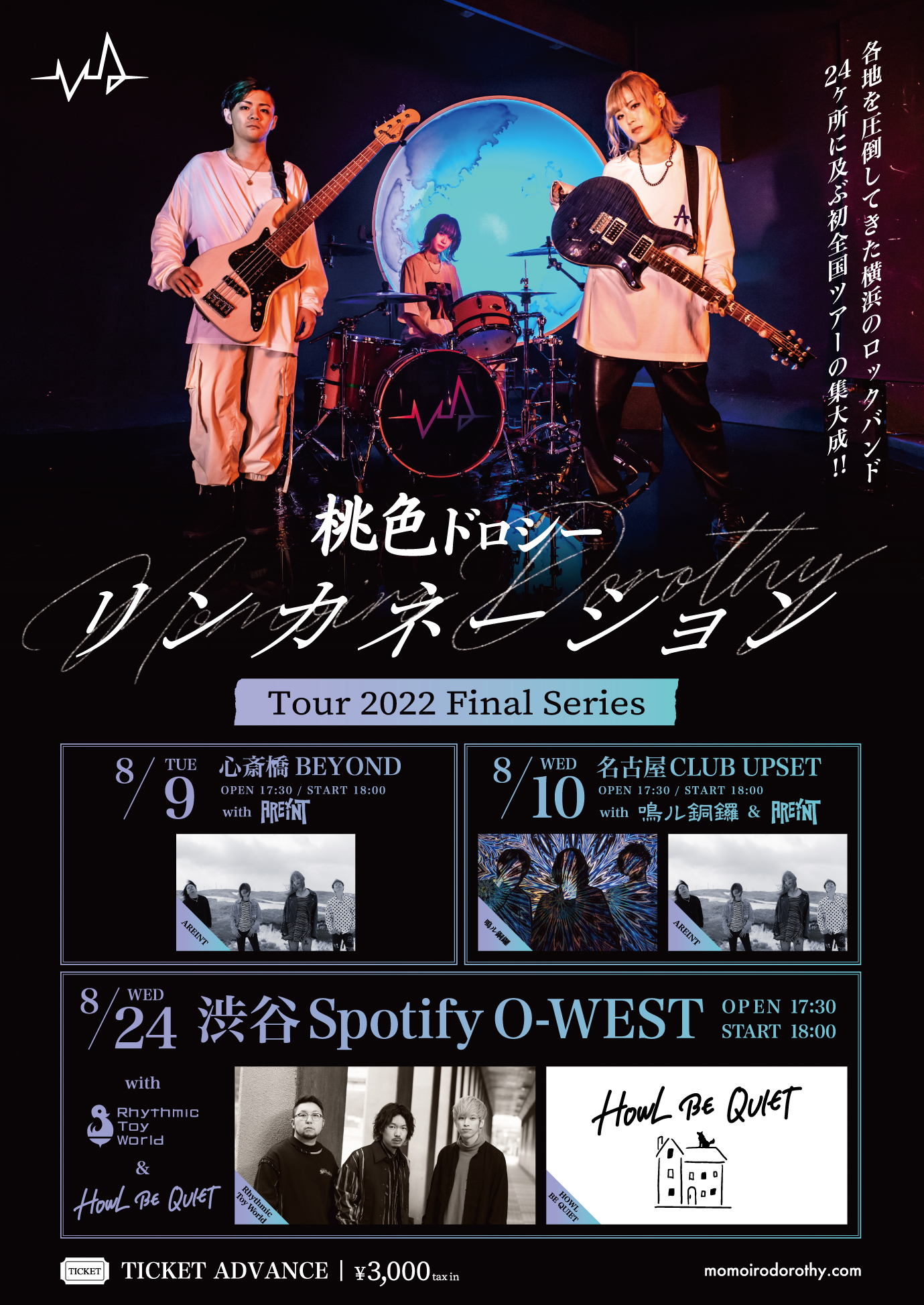 横浜のロックバンド「桃色ドロシー」全国ツアーの最終章、桃色ドロシー“リンカネーション”Tour 2022のファイナルシリーズとなる、東名阪公演のゲストアクトが発表された。