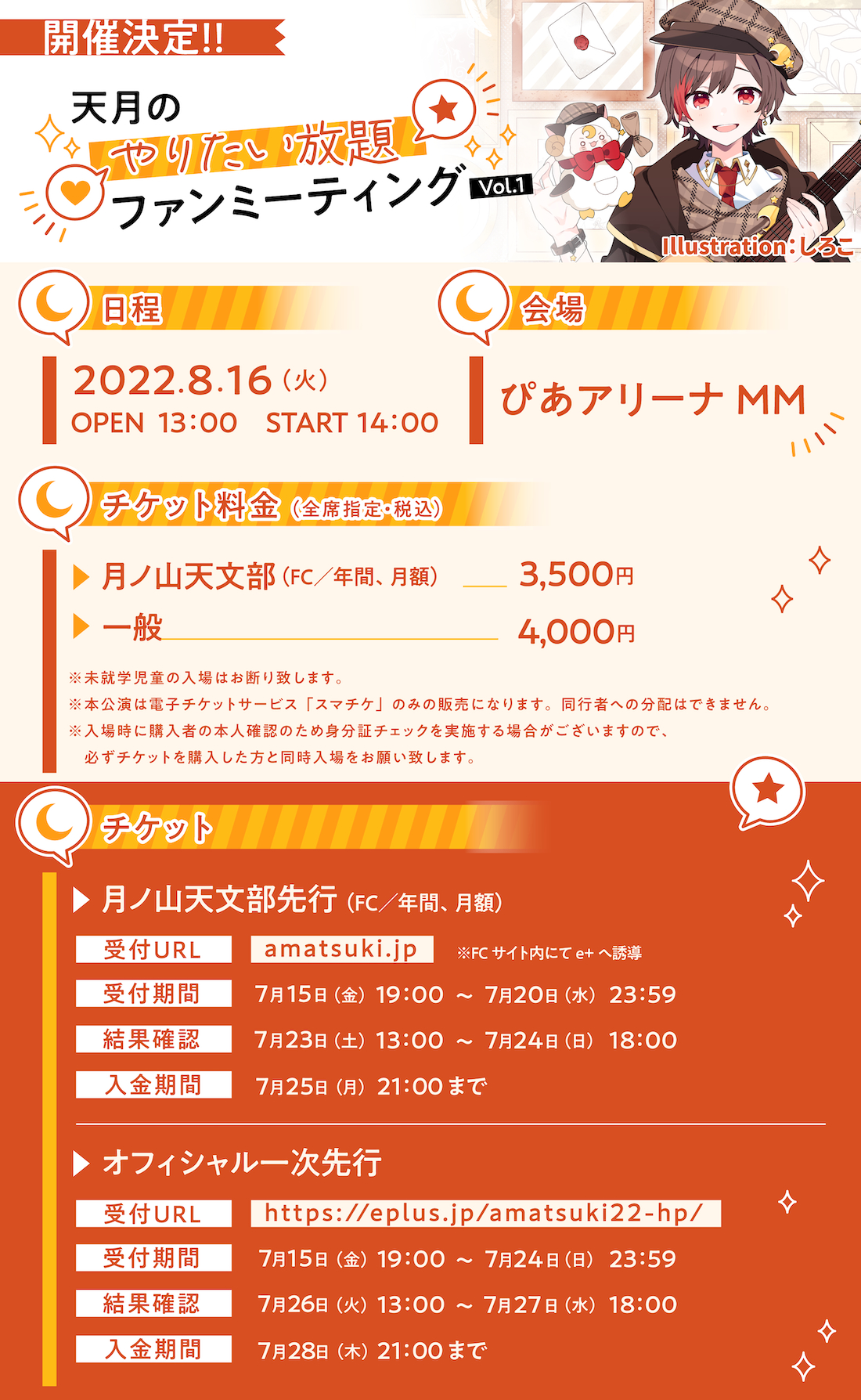 アリーナツアーに続き初の試みとなるファンミーティングでは、天月が普段ネット上で行っている配信をステージより生配信する。チケットは7月15日(金)からファンクラブ&オフィシャル1次先行の受付が開始されている。