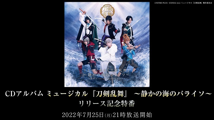 2022年7月27日(水)に発売されるCDアルバム、ミュージカル『刀剣乱舞』 ~静かの海のパライソ~のリリースを記念した生放送番組が、7月25日(月)21時ニコニコ生放送で放送が決定した。