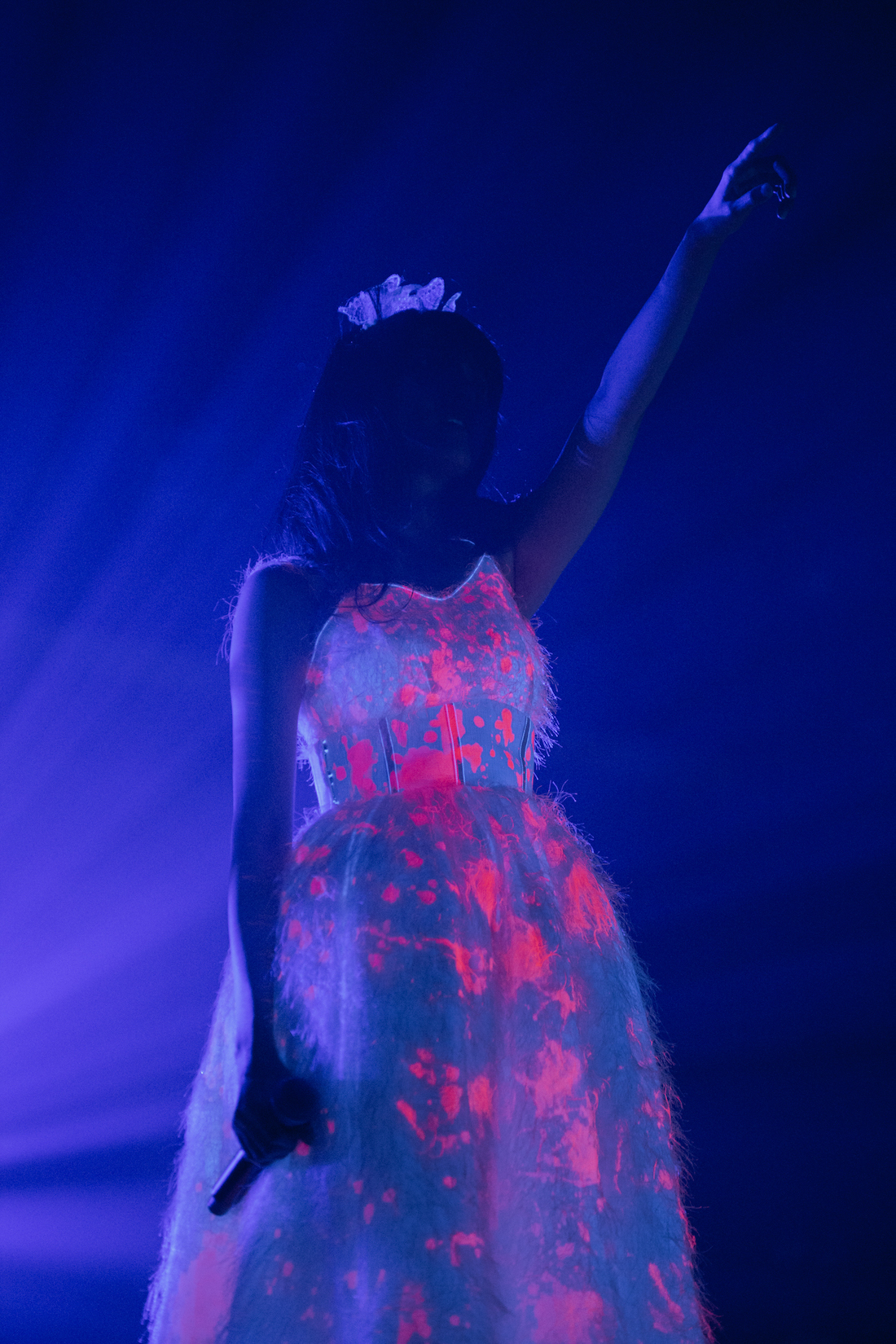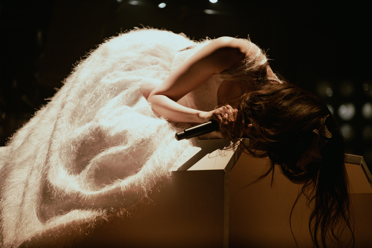 演説台を横に倒したその上で、「檸檬の棘」を伸びやかに歌いあげると、そのアウトロから途切れなく未発表曲の「ポニーテール」が始まったのだが、ここで会場の空気が一変。サイケデリックな照明と、ボコーダーを通した機械的な歌声と、黒木の肉声が入り混じった静謐なサウンドからこぼれ落ちてくる孤独が、客席を一気に侵食していく。続けて披露されたのは、美しくも儚いアンビエントR&B風にアレンジされた「灯台」。スポットライトが水平に回り、まさに灯台が真っ暗な海を照らす光のように見える。黒木は台の上で横たわりながら、いまにも消え入りそうな声で歌うと、スポットライトが生み出した一縷の光の中で歌い始めたのは「さかさまの雨」。ぐちゃぐちゃな感情を表すかのように、静と動を行き来する激情的な演奏が繰り広げられた。
