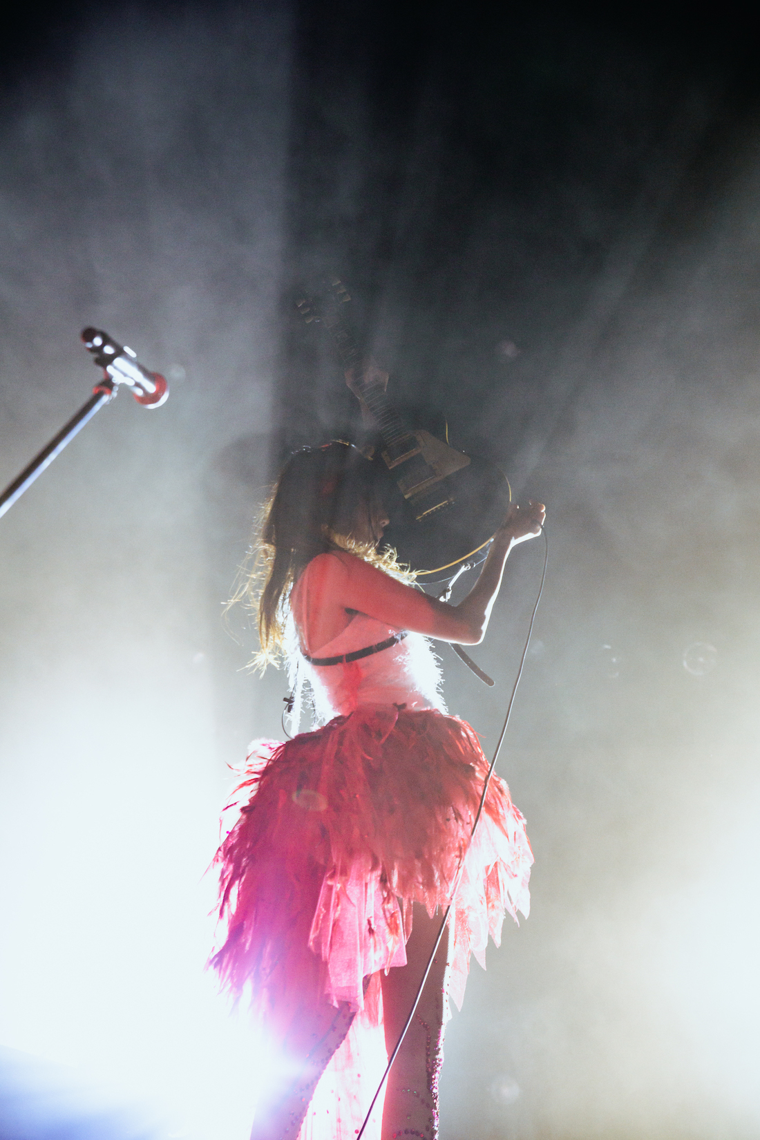 そして、「これまでの10年と、これからの10年を込めて歌います」と、届けられたのは「予測不能の1秒先も濁流みたいに愛してる」。まさに予測できない濁流のような10年を過ごしてきた黒木渚。力強く跳ね上がるバンドサウンドを背中に受け、取り戻した大きな光と、目の前で輝くたくさんの光たちに向けてギターをかき鳴らしながら力強く歌うと、「この先、何度も濁流がやってきても、それを乗りこなして私達は出会おう! そしたらもう一度、ひとつの音楽になろう!」と叫び、そのまま「革命」へ。ここからはメドレー形式で、まさに濁流のような勢いで曲が繋げられていった。「どんどん濁流がくるよ!」とクラップを求めながら、そのままテンポを上げて繋いだのは「虎視眈々と淡々と」。客席からシンガロングが起こるパートは、感染対策で歌えないために「念じて!」と激を飛ばす。そこからリズムが躍動的になる「カルデラ」の後半部分を繰り広げると、フィードバックノイズが響き渡る中、「私の心臓が止まっても、どうか、私の音楽だけは鳴り続いていますように」と、彼女のデビュー曲である「あたしの心臓あげる」になだれ込んでいった。ときに叫ぶように歌い、演説台の上でギターをかき鳴らす黒木。凄まじい轟音に包み込まれる中、スポットライトを浴びながらギターを高く掲げるラストシーンは、ただひたすらにかっこよかった。