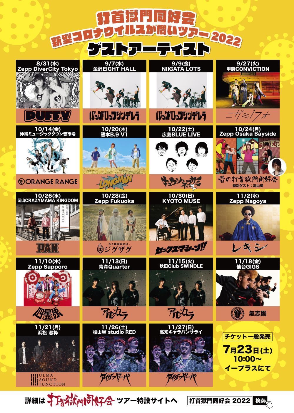 打首獄門同好会が8月31日(水)より開催する『新型コロナウイルスが憎いツアー2022』19公演のゲストアーティストが発表された。