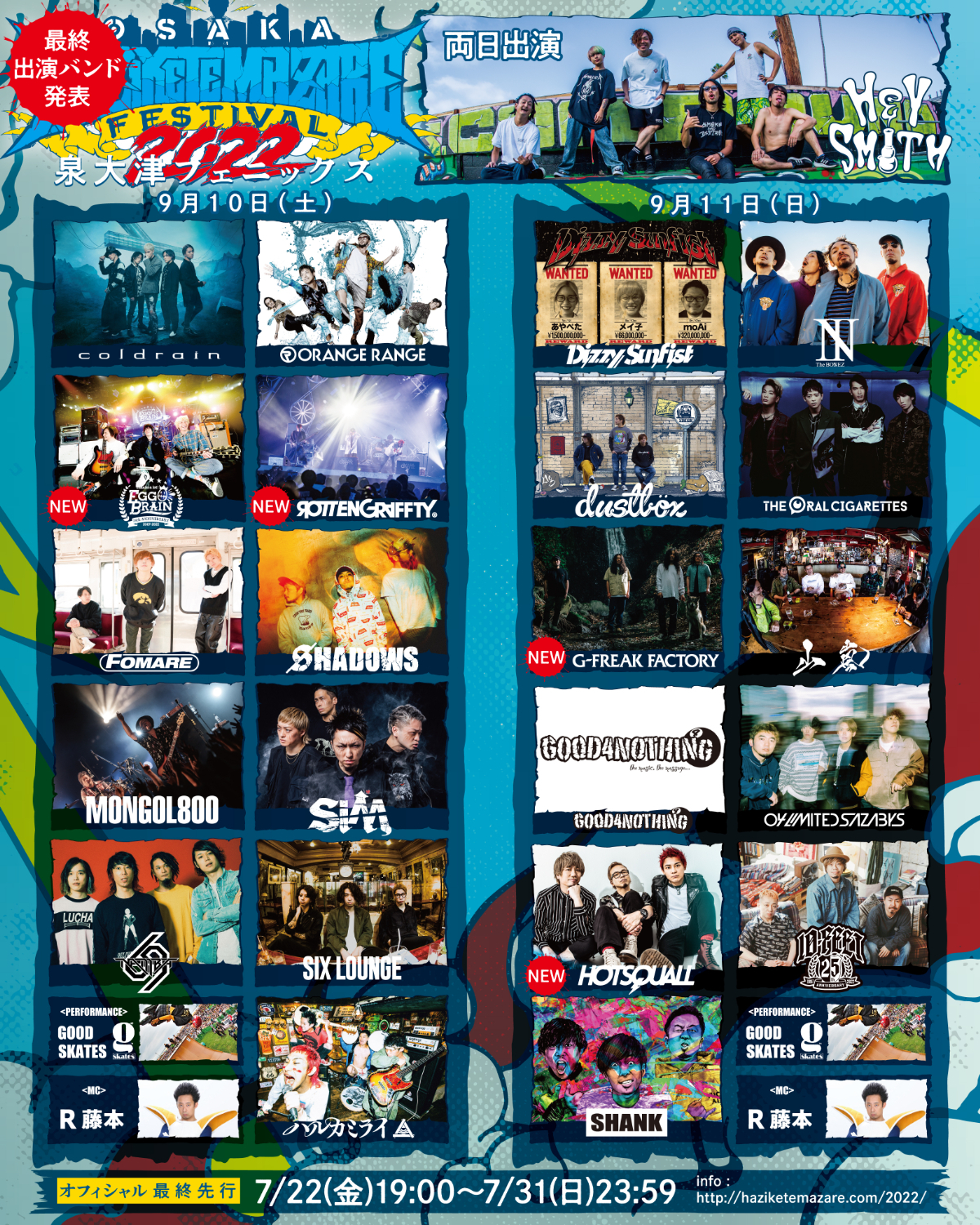 9月10日と11日に大阪・泉大津フェニックスで行われるHEY-SMITH主催のライブイベント『OSAKA HAZIKETEMAZARE FESTIVAL 2022』の最終追加アーティストが発表された。