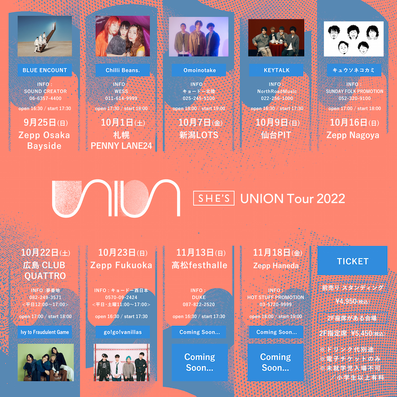 SHE’Sが9月より開催する全国対バンツアー『SHE’S UNION Tour 2022』のゲストアーティストが発表された。