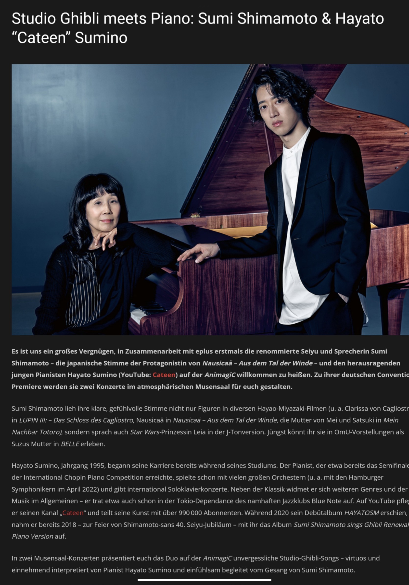 25日(月)のツアー終了後、島本と角野の2人はドイツ・マンハイムにわたり、8月5日(金)~7日(日)と欧州最大級のアニメイベント『AnimagiC』に出演予定。この公演のエッセンスをドイツ、ヨーロッパのファンに届けにいく。