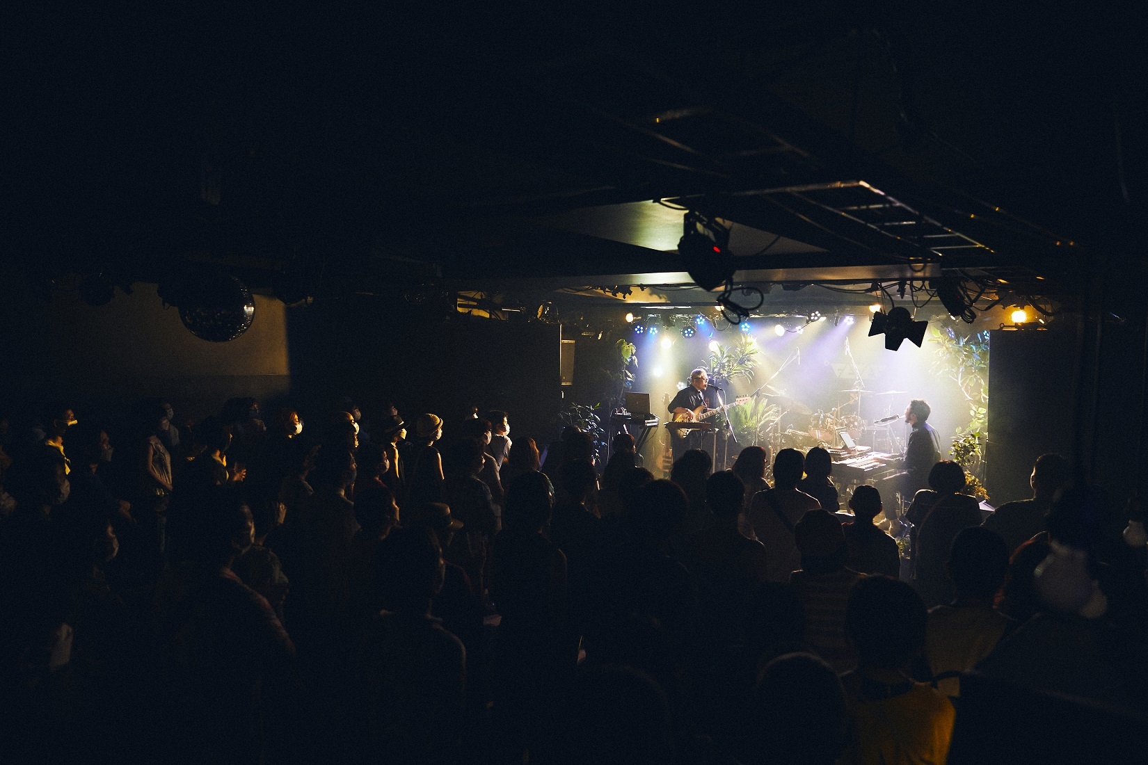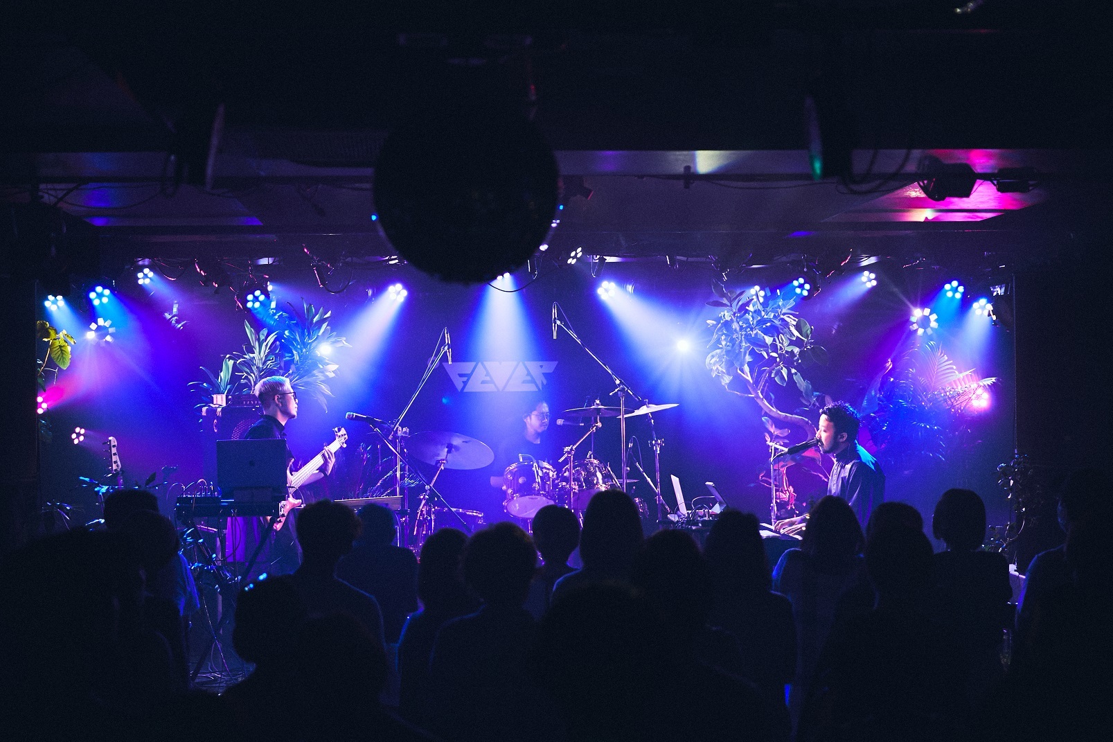思わぬアクシデントを受け、予定変更を余儀なくされたRyu Matsuyama。しかしそれでも、彼らのホームグラウンドであるFEVERにはたくさんのお客さんが集まり、開演前から温かな空気感で満ちていたのがグッときた。ドラマ『オールドファッションカップケーキ』の主題歌「blue blur feat. mabanua」でリュウマツの存在を知って、初めて観に来た人も多いのかもしれない。3連休の最終日、海の日。過去2回に続き、今回も外は好天に恵まれ、会場内はMOND And PLANTSによる植物の装飾で素敵に彩られている。