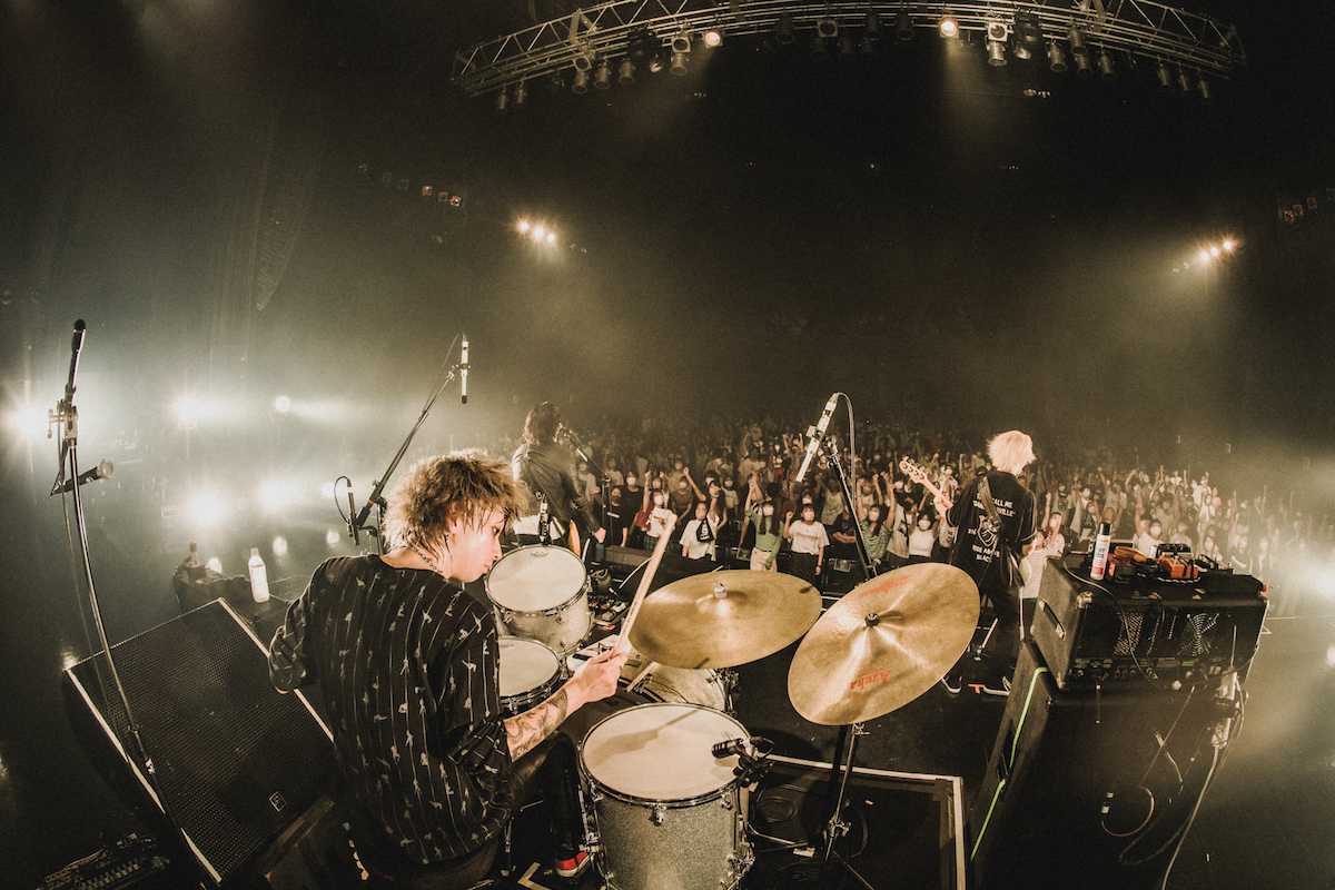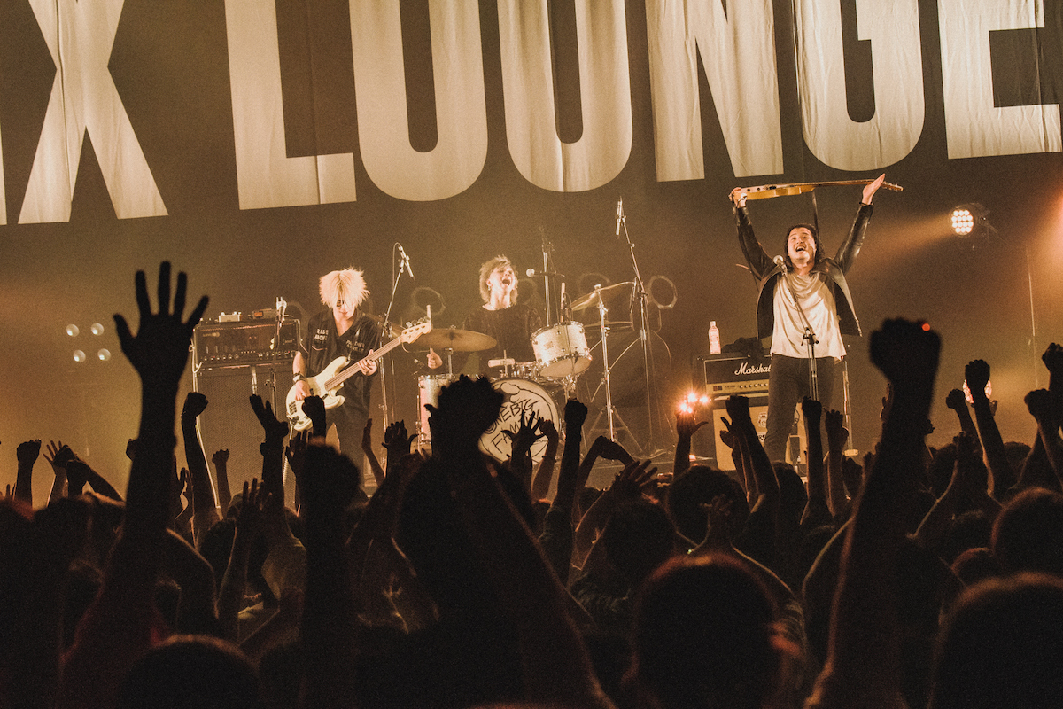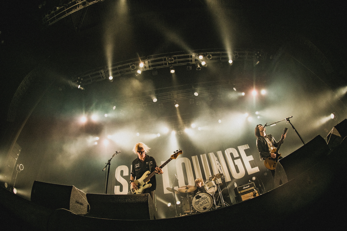 そして、出演3組のアンカーを務めるのは、「雨にぬれても」をSEに姿を見せたSIX LOUNGEである。ヤマグチユウモリ(Gt/Vo)、ナガマツシンタロウ(Dr)、イワオリク(Ba)のトリオが位置につくや否や、勿体ぶることもなくアクセルを踏み込み、「ナイトタイマー」を皮切りにタイトで鋭いロックンロールの時間が始まる。開演からものの数秒、ヤマグチの狂おしい節回しは早くもフルスロットルだ。間髪入れず、湧き上がるフロアに挑発的なナンバー「DO DO IN THE BOOM BOOM」を畳み掛け、イワオもぐいぐいとスウィングするベースラインで追い込みをかけるのだが、ヤマグチはまだまだ満足できないといった様子で「おいZepp!! 目ぇ覚ませよ!!」と煽り立てるのだった。