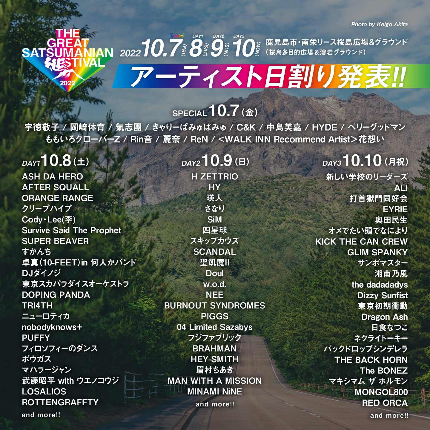10月8日(土)、9日(日)、10日(月・祝)に鹿児島・南栄リース桜島広場&グラウンドで開催される『THE GREAT SATSUMANIAN HESTIVAL 2022』のアーティスト日割りが発表された。
