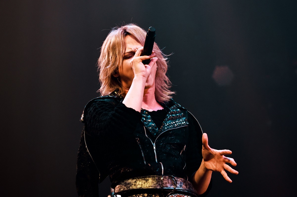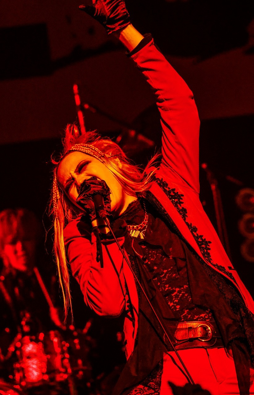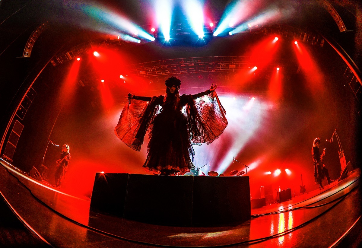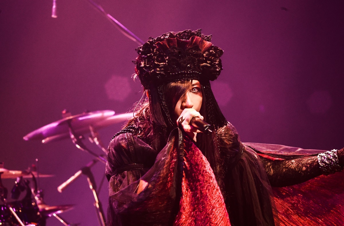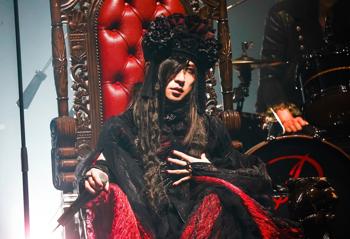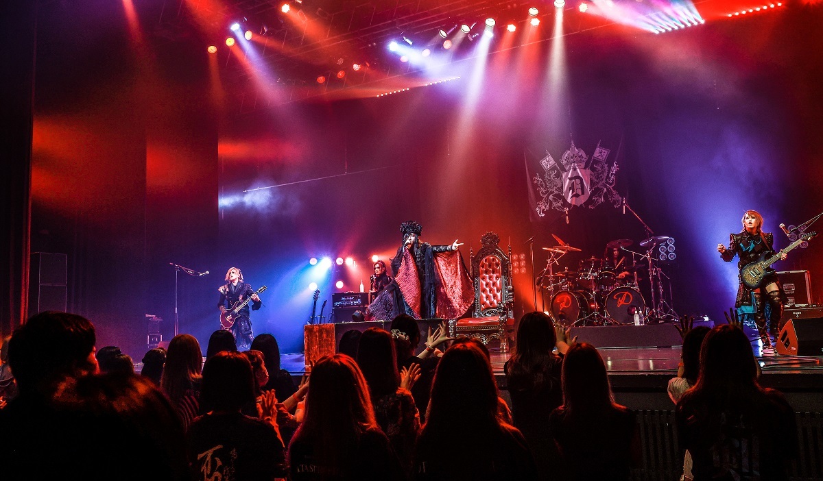 そして予想外のセットリストで独特すぎる世界観を創り上げ、観る者をあっと言わせたのがD。場内に流れる「組曲『狂王』」という低音ボイスから静かに幕が開くと、スポットライトのなか豪奢な革張りの玉座に座り、朗々と「組曲『狂王』第一番 ~灯火(とうか)の雄馬~」を歌い上げるASAGI(Vo)の姿が目に飛び込んでくる。曲がクライマックスに至ると真っ赤な光が舞台を包み、楽器隊が重厚なリズムを奏でたところで、彼が翻したマントを合図に始まったのは「組曲『狂王』第二番 ~死の影を運ぶ鳥~」。以降、D史上初となる組曲全5曲を立て続けに披露し、約20分にわたり彼らにしか為しえない濃密な神話世界を紡ぎ上げていったのだ。ドラマティックなバンドサウンドと鳴り響く男声合唱が荘厳な空気を作り上げる「第二番」に続き、「組曲『狂王』第三番 ~美醜なる不死の獣~」では「頭振れ!」というASAGIの号令で、フロアは一面ヘッドバンギングの海となる。それをコンダクトするかのような彼の滑らかな身振りは、まさしく狂王・ドライツェンのごとし。バンド黎明期からDが一貫して描き続けているヴァンパイアストーリーの中でも、最重要人物の一人と言えるドライツェンの壮絶な物語を描き出す彼らのパフォーマンスに、客席は魅入られるばかりだ。