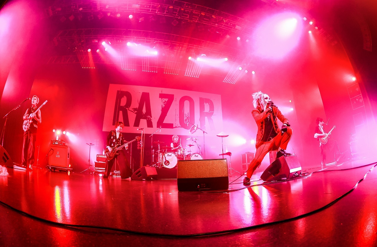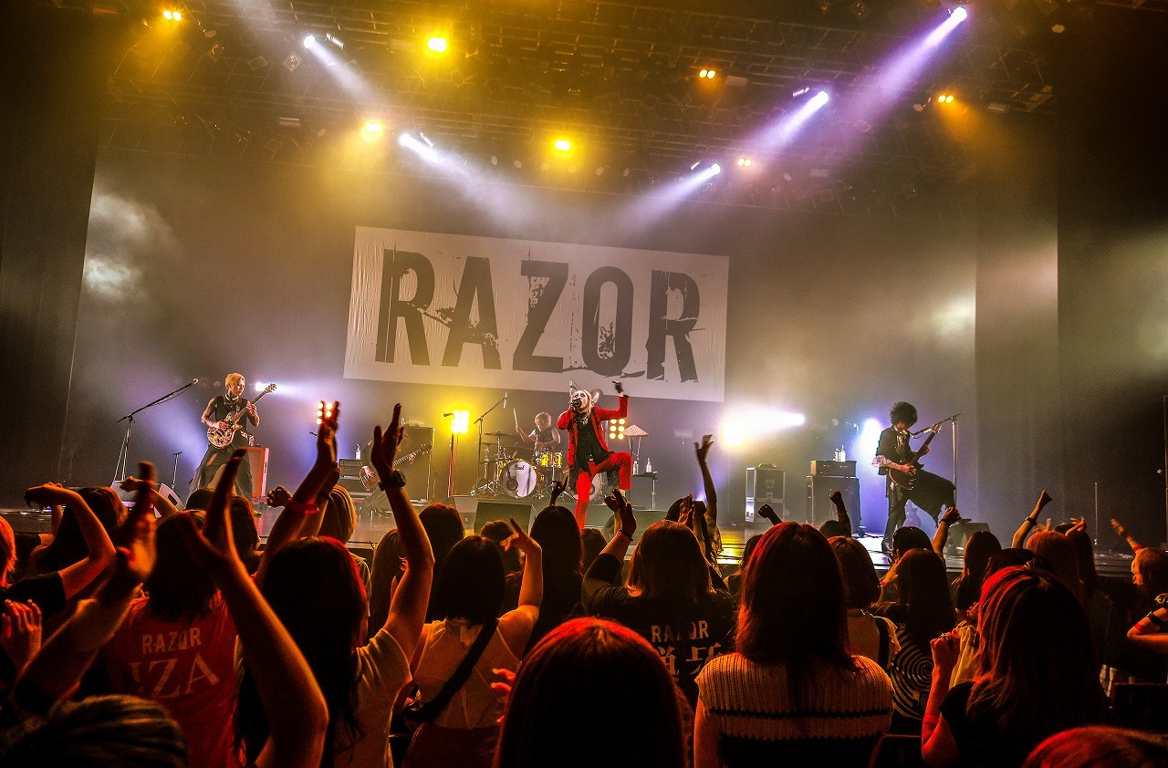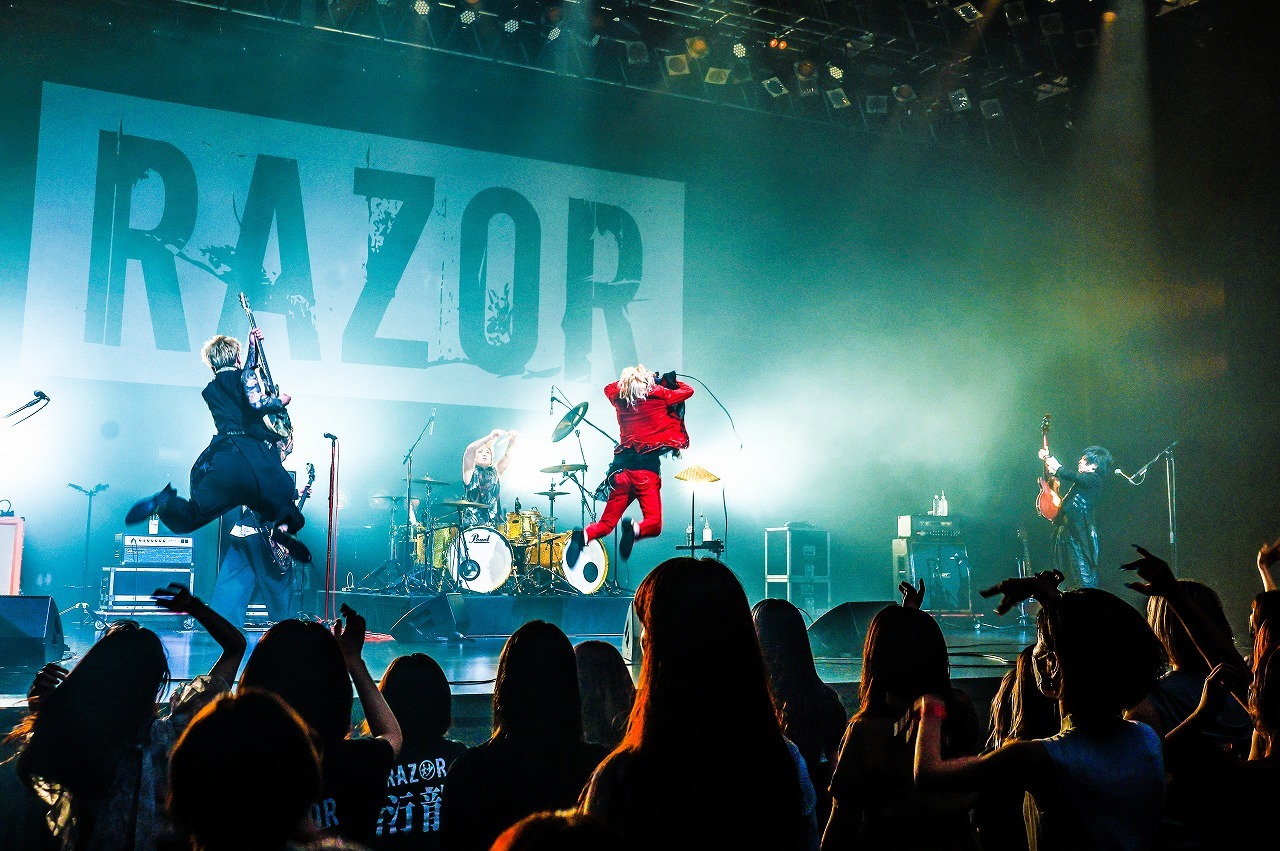 黒地に白字で“RAZOR”と大きく染め抜かれたバックドロップを背に、クラップが湧き起こる中で「Are you ready?」と猟牙(Vo)が吠えた瞬間、オーディエンスは手を止めて頭を振りたくる。おなじみの「KNOT INVISIBLE」で会場を温めると、「お待たせしました六本木! 皆様のことブッタ斬らせてもらいますんでよろしく!」という宣言から、ほら貝と太鼓の音で幕開けたのは最新曲「存在証明」だ。『マガツノート』に登場する織田信長の生き様を、もはやRAZOR節とも言えるメロディックな旋律と満点の疾走感で描くナンバーは観る者を血沸き肉躍らせ、アドレナリンも大放出。前に進み出た剣&衍龍のギター隊によるスリリングなツインリードでも手に汗握らせるが、ここまでフィクションの物語を自分たちのものとして消化し、ここまで《我が第六天魔王》という歌詞をカッコよくキメられるバンドが果たして他にいるだろうか? 序盤から場内のテンションを頂点まで押し上げて、さらに「LIQUID VAIN」でも日本人の情緒を抉るキャッチーなメロディと激しいバンドサウンドの巧みな共存という“RAZORらしさ”を提示していくのだから容赦ない。ジャケットを投げ捨てて「ほら手上げろ!」と鼓舞する猟牙に応え、手拍子を贈るオーディエンスは剣のギターソロで沸騰。その様を見つめていたIZA(Ba)は歌謡調のサビメロに合わせて激しく頭を振り、NIKKYもバチバチのドラミングを轟かせるという循環は、ライブにおける理想的な相乗効果だろう。一方で「RAZOR舐めんなよ、バカ野郎!」と煽っての「DISRESPECT」では、洋楽色の濃いノリを押し出して「Put your Hands up!」と客席と共にグルーヴ。MCでは前方席に陣取る人々に「戦士の皆さん」と敬意を表しながら、後方に向けて「後ろにいる地蔵! 反応しちゃいけないのか。でも、見えてるよ地蔵たち。どうにかこうにか掟を破って、地蔵のことも揺らせるように頑張ります」と決意表明してくれるのが嬉しい。