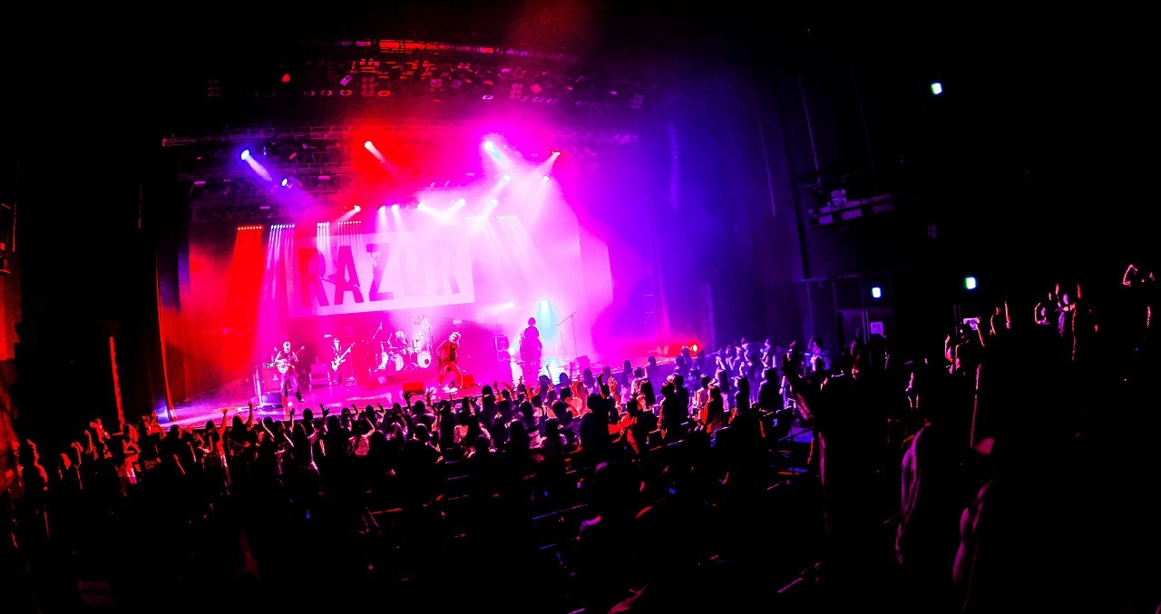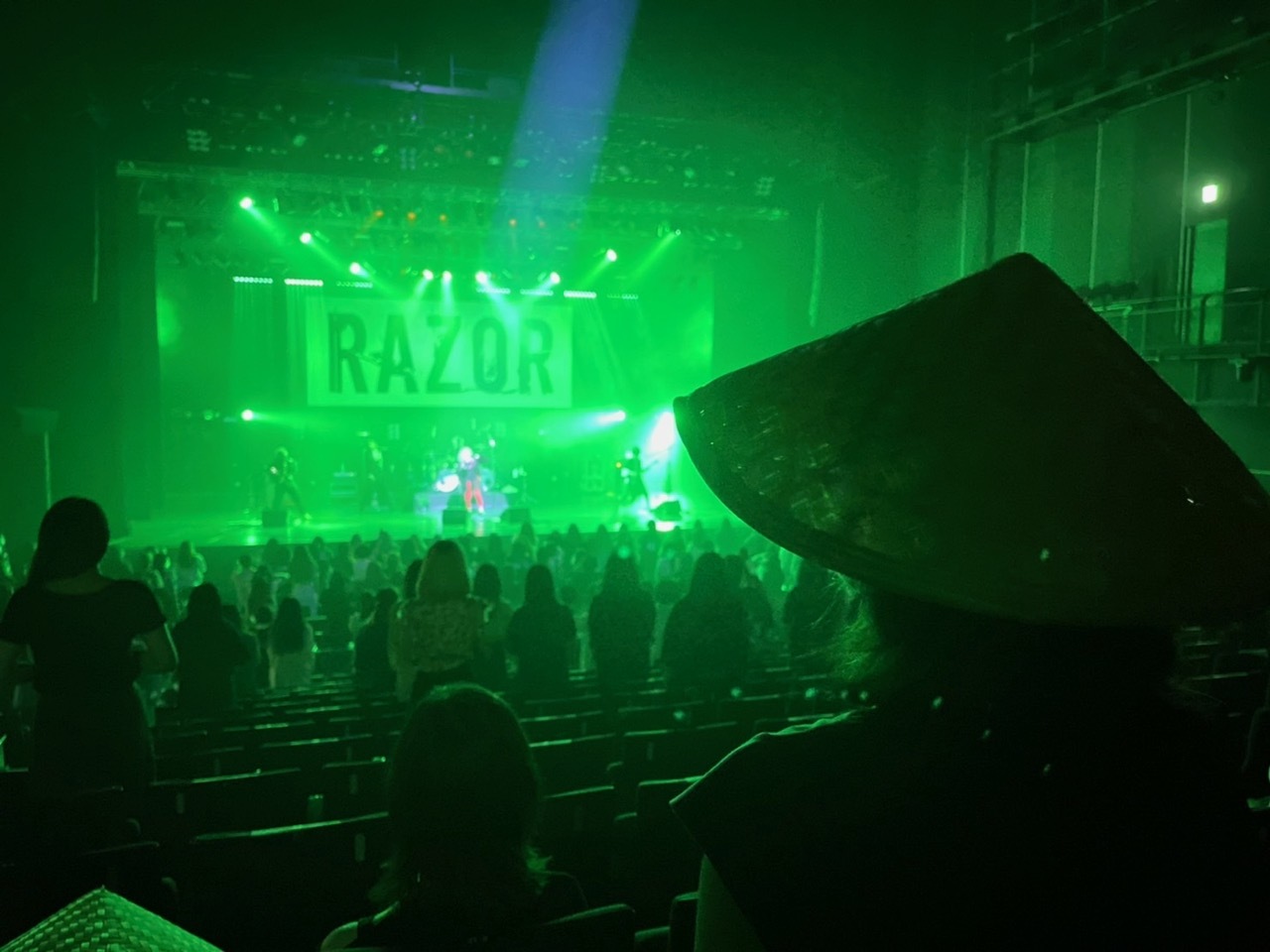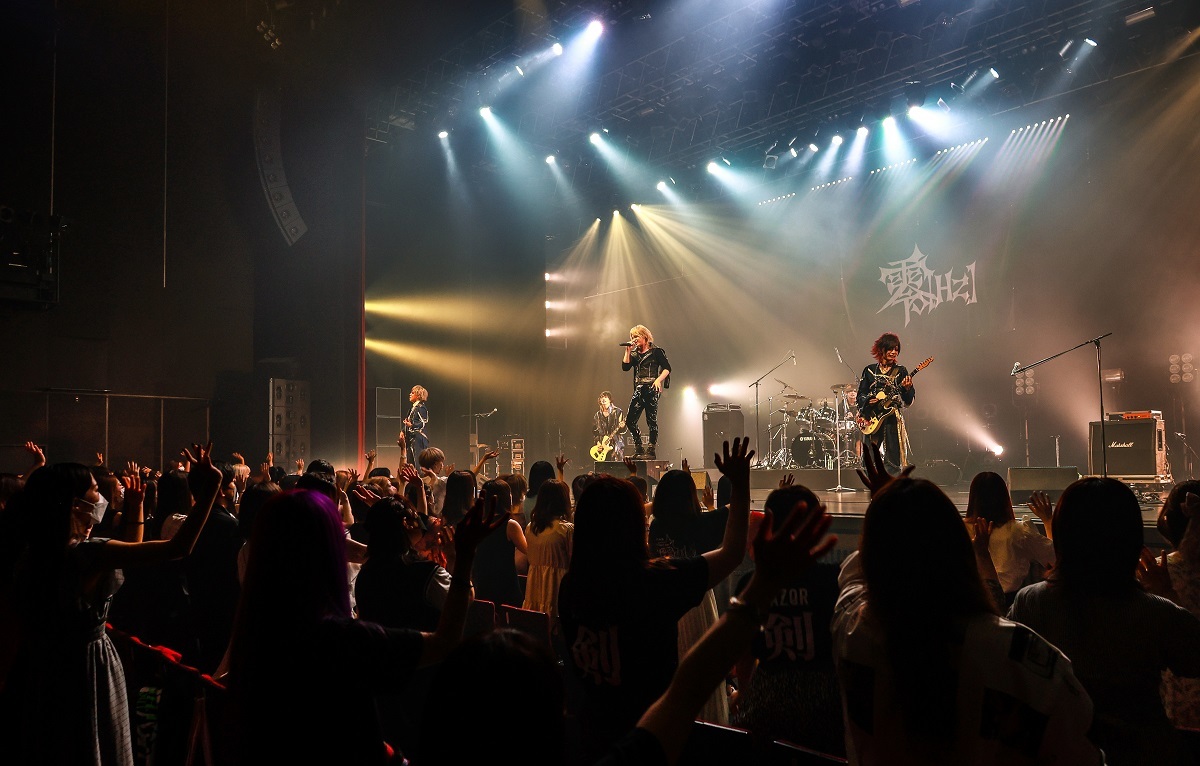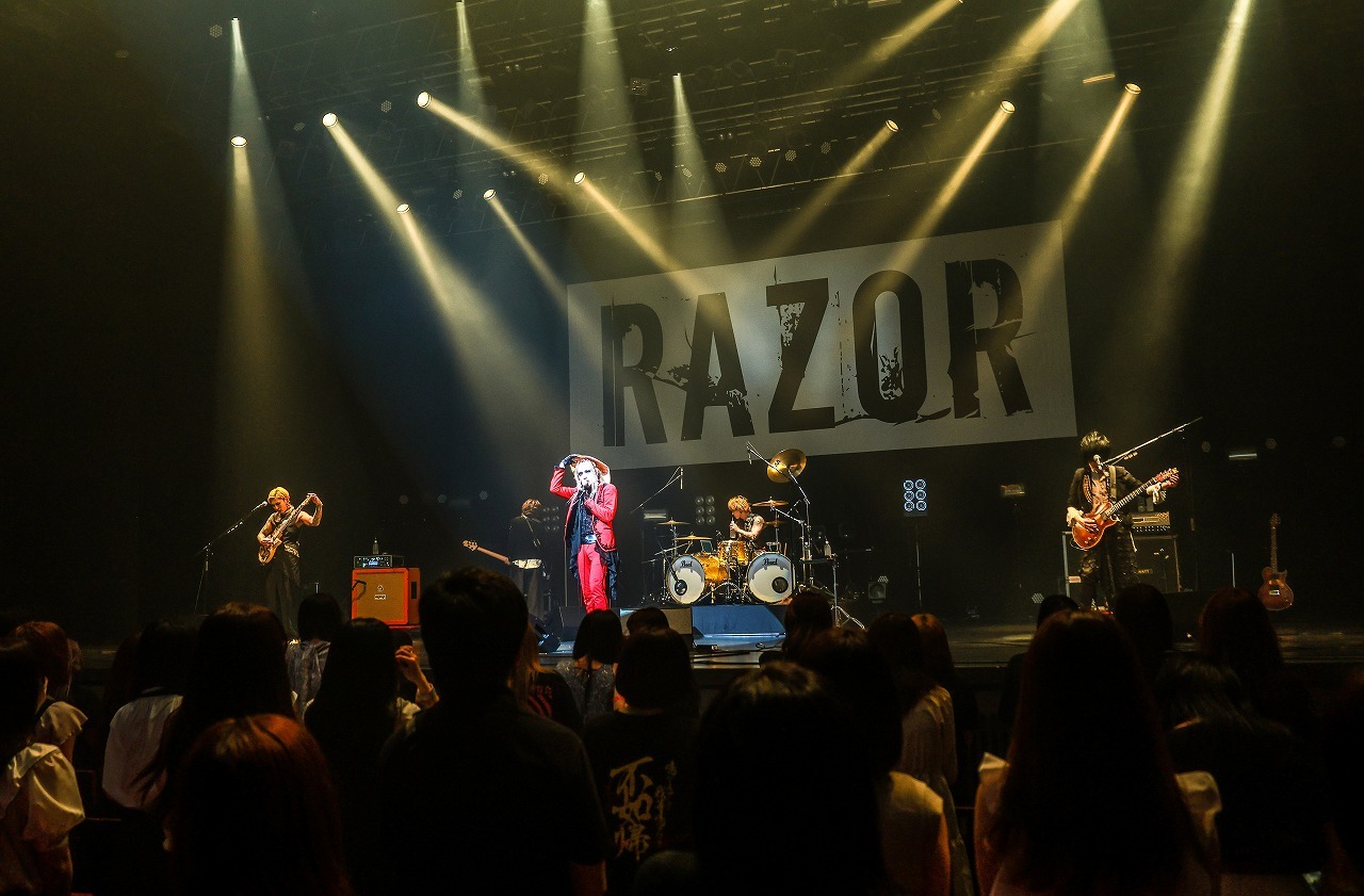 黒地に白字で“RAZOR”と大きく染め抜かれたバックドロップを背に、クラップが湧き起こる中で「Are you ready?」と猟牙(Vo)が吠えた瞬間、オーディエンスは手を止めて頭を振りたくる。おなじみの「KNOT INVISIBLE」で会場を温めると、「お待たせしました六本木! 皆様のことブッタ斬らせてもらいますんでよろしく!」という宣言から、ほら貝と太鼓の音で幕開けたのは最新曲「存在証明」だ。『マガツノート』に登場する織田信長の生き様を、もはやRAZOR節とも言えるメロディックな旋律と満点の疾走感で描くナンバーは観る者を血沸き肉躍らせ、アドレナリンも大放出。前に進み出た剣&衍龍のギター隊によるスリリングなツインリードでも手に汗握らせるが、ここまでフィクションの物語を自分たちのものとして消化し、ここまで《我が第六天魔王》という歌詞をカッコよくキメられるバンドが果たして他にいるだろうか? 序盤から場内のテンションを頂点まで押し上げて、さらに「LIQUID VAIN」でも日本人の情緒を抉るキャッチーなメロディと激しいバンドサウンドの巧みな共存という“RAZORらしさ”を提示していくのだから容赦ない。ジャケットを投げ捨てて「ほら手上げろ!」と鼓舞する猟牙に応え、手拍子を贈るオーディエンスは剣のギターソロで沸騰。その様を見つめていたIZA(Ba)は歌謡調のサビメロに合わせて激しく頭を振り、NIKKYもバチバチのドラミングを轟かせるという循環は、ライブにおける理想的な相乗効果だろう。一方で「RAZOR舐めんなよ、バカ野郎!」と煽っての「DISRESPECT」では、洋楽色の濃いノリを押し出して「Put your Hands up!」と客席と共にグルーヴ。MCでは前方席に陣取る人々に「戦士の皆さん」と敬意を表しながら、後方に向けて「後ろにいる地蔵! 反応しちゃいけないのか。でも、見えてるよ地蔵たち。どうにかこうにか掟を破って、地蔵のことも揺らせるように頑張ります」と決意表明してくれるのが嬉しい。