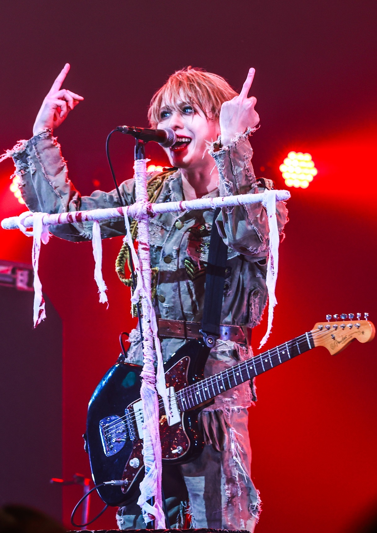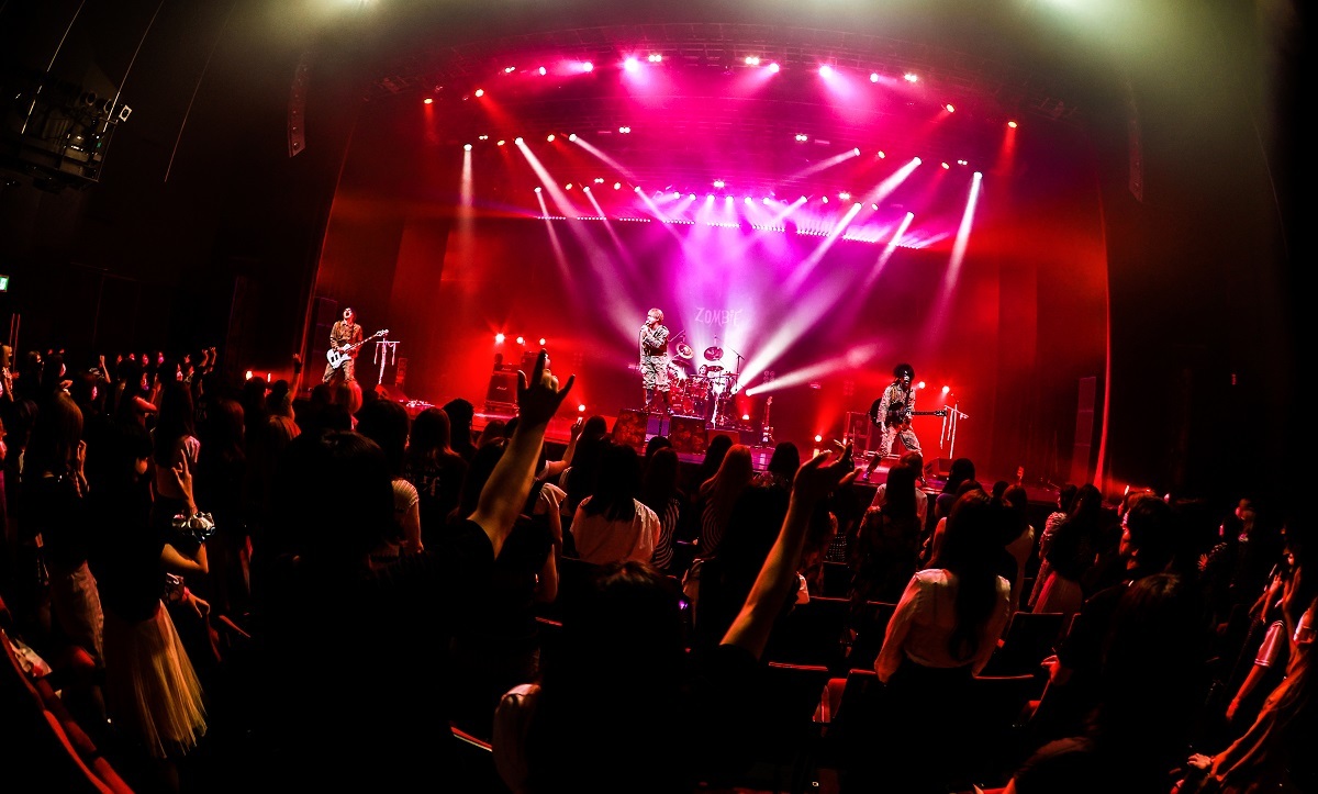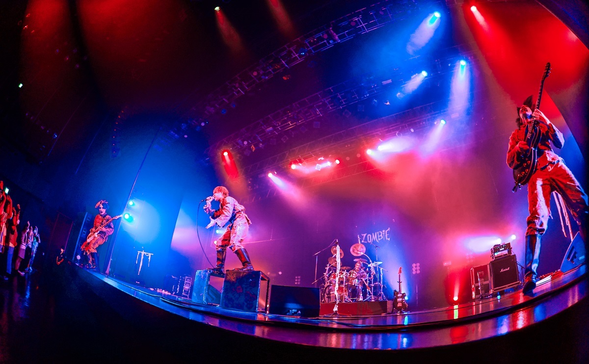 続いて、軋む扉の音からゆっくりと幕が開き、真っ赤に染まったステージに微動だにしない”ゾンビ”が浮かび上がってくるという、実にオカルティックなムードの中で現れたのはZOMBIEの4人だ。「楽しみたいヤツは両手を上に!」という奏多(Vo)の煽りと、お立ち台に立った青井ミドリのベースソロから「腐り姫」が始まるや、一斉に客席が踊り出す様は圧巻。続く「気絶ダンシングガール」でもオーディエンスは奏多と共に振りを繰り出して、観る者を瞬く間にZOMIBIEワールドへと引き込んでいく。メロディアスなサウンドにネガティヴなリリックを乗せた楽曲で、楽しむことに特化したステージを作り上げるというギャップこそ彼らの魅力であり、「暴れる曲、踊れる曲、楽しめる曲たくさん持ってきました。新曲です」と贈られた「ウルトラムシケラボーイ」も、タイトルからして自虐の極み。一気に跳ねる客席に「いいじゃん」と奏多。ステージ上を青井ミドリが縦横無尽に走り回れば、izuna(Gt)も大きく身体を振ってオーディエンスと“楽しさ”を共有する。「EX THEATER ROPPONGIに絶望を!」とドロップされたゴリゴリにアグレッシヴな「午前五時、絶望」も拳からヘドバン、両腕を前に出すゾンビ風ダンスのあげくタオルを振りたくるフルコースぶり。自らギターを抱えた奏多が「自分が生きていく上で邪魔するヤツは全員抹殺せよ!」とシャウトする爆速チューン「抹殺せよ!!」を挟み、ラストの「だいっきらい東京」では歌謡風のメロディでヘッドバンギングが巻き起こるという不思議な光景も。「溜まってるもの吐き出そうぜ!」と曲中で奏多が放った言葉の通り、ネガティヴな動機をポジティヴに昇華するという彼らならではのポリシーを魅せつけられた25分だった。