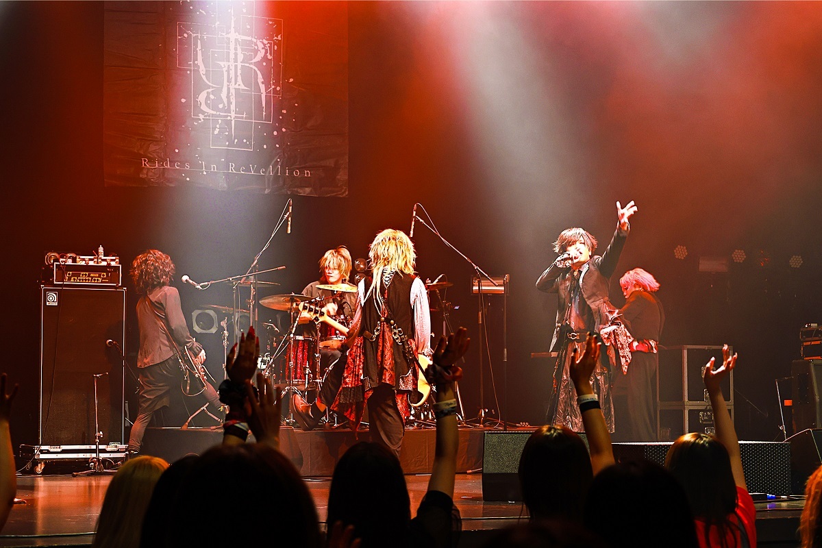 ダンサブルでコズミックなSEからトップバッターを飾ったのは、オープニングアクトのRides In ReVellion。「全員で飛ばしていこうぜ、東京!」と黎(Vo)が一喝すると、吹き荒れるシャウトとヘッドバンギングにツインリードのギターソロがトドメを刺す「MIRAGE」で、ウォーミングアップというには激しすぎる轟音を初っ端から叩きつけていく。なるほど、攻めに振り切るアグレッションが持ち味かと思いきや、一転「Eternal~渇望の空~」でメロウな表情を見せ、最後はアッパーな「カレタソレイユ」で希望にあふれた眩い情景を演出。「たった15分、しかしその15分に命を賭けます!」という呼びかけからは誠実さが、拳を振り上げる客席に「Thank you Tokyo!」と繰り返す様からは関西を拠点に活動する彼ららしさも覗き、幕開きに相応しい爽やかな印象を残した。