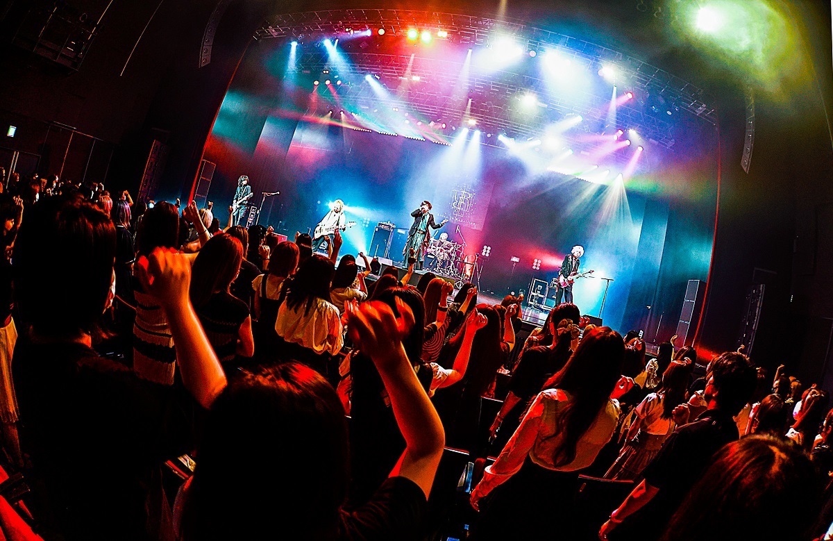 2番手の零[Hz]は“東京ミクスチャー・ロック”というコンセプトの通り、とにかく洗練された音世界が魅力の5人組。まずはキャッチーな旋律と疾走するデジタルサウンドが巧みに融合した「DISTURBO」、メディアミックスプロジェクト『マガツノート』とのコラボ曲で、武将・秀吉の不遜な生き様を不穏に落とし込んだ「惡鬼招雷」と色の違う、かつクオリティの高いパフォーマンスで客席を沸騰させる。「枠に囚われず、さまざまないジャンルを歌で、曲で表現する」とバンドコンセプトを説明するROYのボーカルも終始パンチの利いたもので、「今日はたくさんの人の心に刺さる曲を用意してきた」と伝えたあとは高速ドラムが牽引するハードな「BAKEMONO carnival」、オーディエンスのクラップが迎える全英詞のグルーヴィーな「DarthHerz」を立て続けに投下。中でも、お立ち台に立ったTEIKAの極低音ベースから、エモーショナルなRio&テクニカルなLeoとタイプの違うツインギターが弾き継ぎ、最後はRYOGAのドラムが弾けるというソロ繋ぎで、一人ひとりの高い力量を存分に見せつけた「DarthHerz」は見応え満点だった。ラストは人気曲「VENOM」で爆発力の高さを証明し、歌詞にもある“まだ見ぬ明日”への輝かしいヴィジョンを体現してみせる。