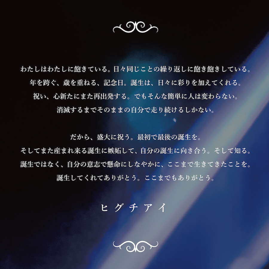 11月22日(火)の新潟を皮切りに、翌日のデビュー記念日には地元・長野へ、その後福岡、名古屋、大阪を廻り、12月24日(土)のクリスマスイブに東京・品川クラブ eXでファイナルを迎える。2021年11月に東阪2箇所で開催した『ヒグチアイ 5TH ANIV 独演会 [ 真 感 覚 ]』以来、1年ぶりの独演会となる。