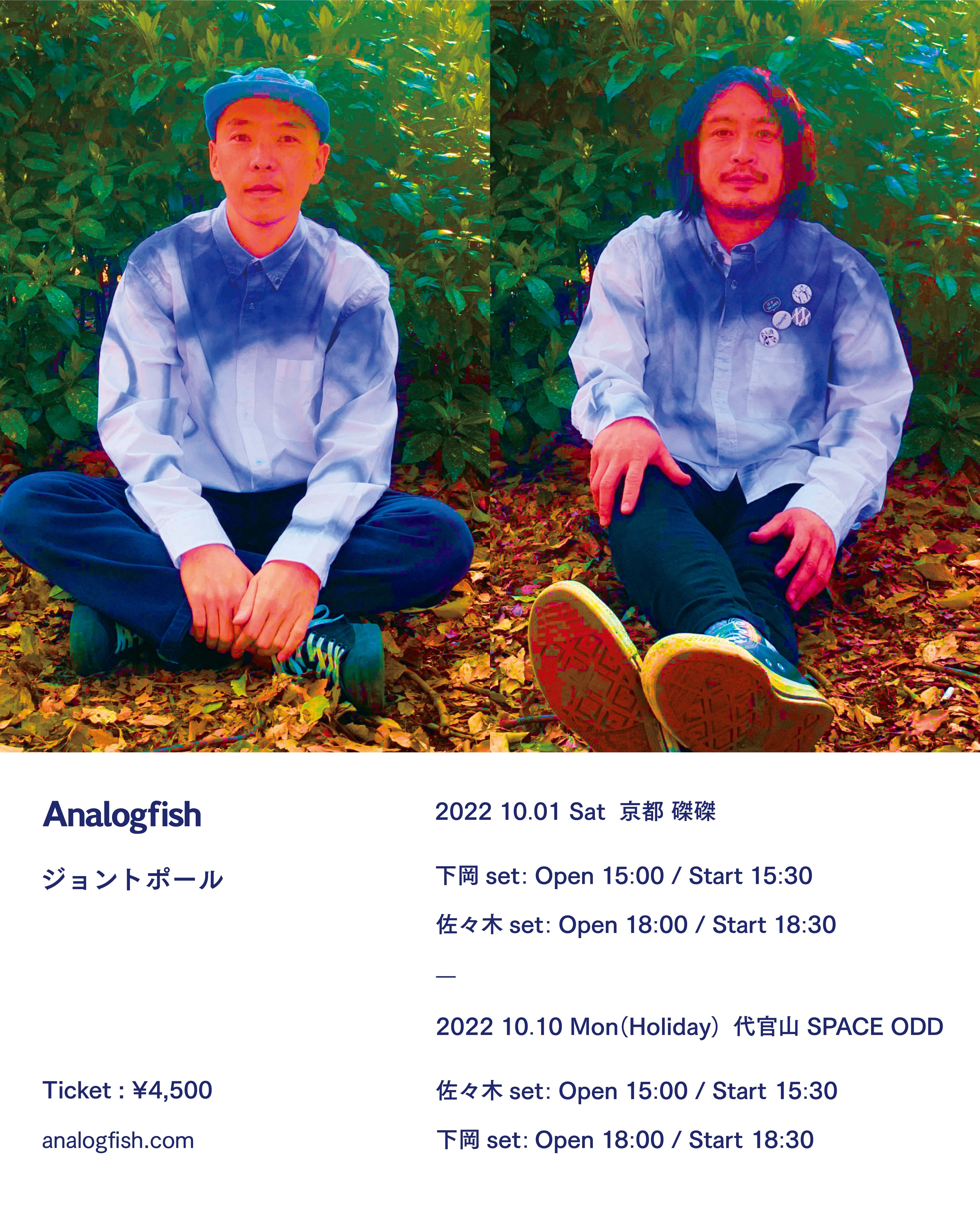 ドラムの斉藤州一郎のボーカル曲もそれぞれのセットで1曲ずつ披露される予定。Analogfishのファンクラブ「RECEIVERS」では8月14日(日)までチケットの先着先行を受け付けており、こちらの受付でのみ各日通し券の販売も行う。