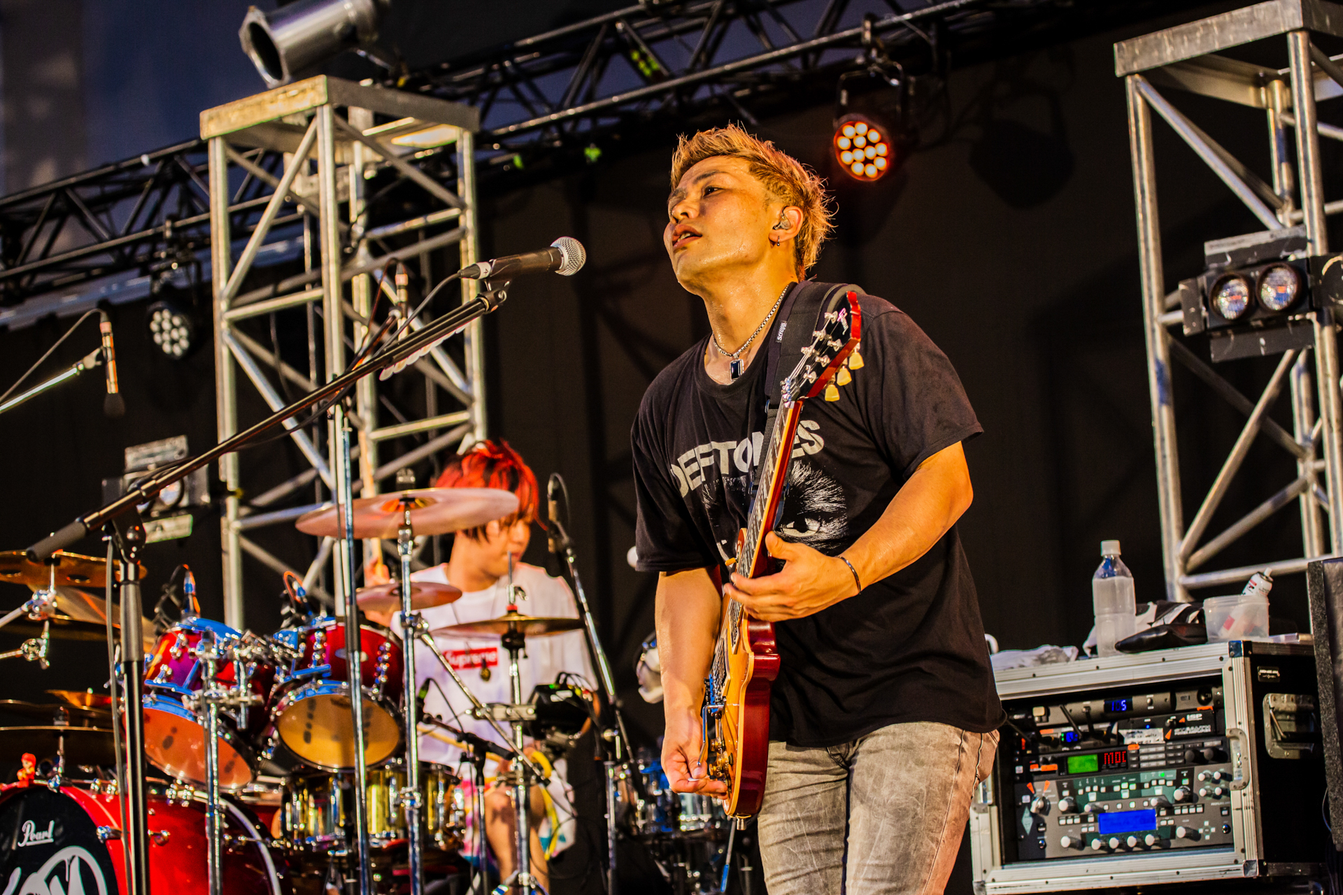 中盤、現状やリアルを噛みしめるような、たっぷり気持ちを込めた歌と演奏で聴かせたバラードソング「realize」で魅了すると、「俺が「今日、一番楽しかった」と胸張って帰るつもりです。一対一で勝負したいと思ってるんで、ついて来て下さい!」と告げたw-shun。ラウドなイントロで始まる「Black or White」に、会場中が両手を上げて応え、再び客席が燃え上がる。「Paint it Out!!!」では「結局、フェスなんてもんは来たヤツが楽しいのが一番で、わがまま勝手やらせてもらって『猿爆祭』終える事ができるのでホントにみなさまに感謝」とアドリブで感謝の気持ちを歌い、会場中がクラップを合わせて心の大合唱。「遊ぼうぜ!」と始まった「Flight」では、手拍子を合わせたり拳を上げたり踊ったりジャンプしたりと、みんながそれぞれのスタイルで楽しみ、楽しすぎた夏祭りがクライマックスを迎える。