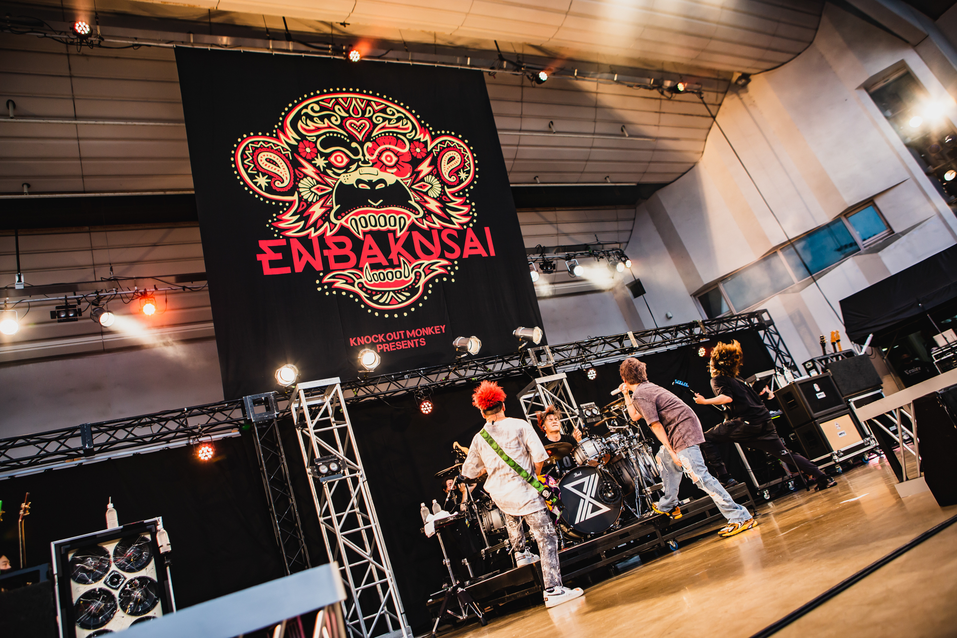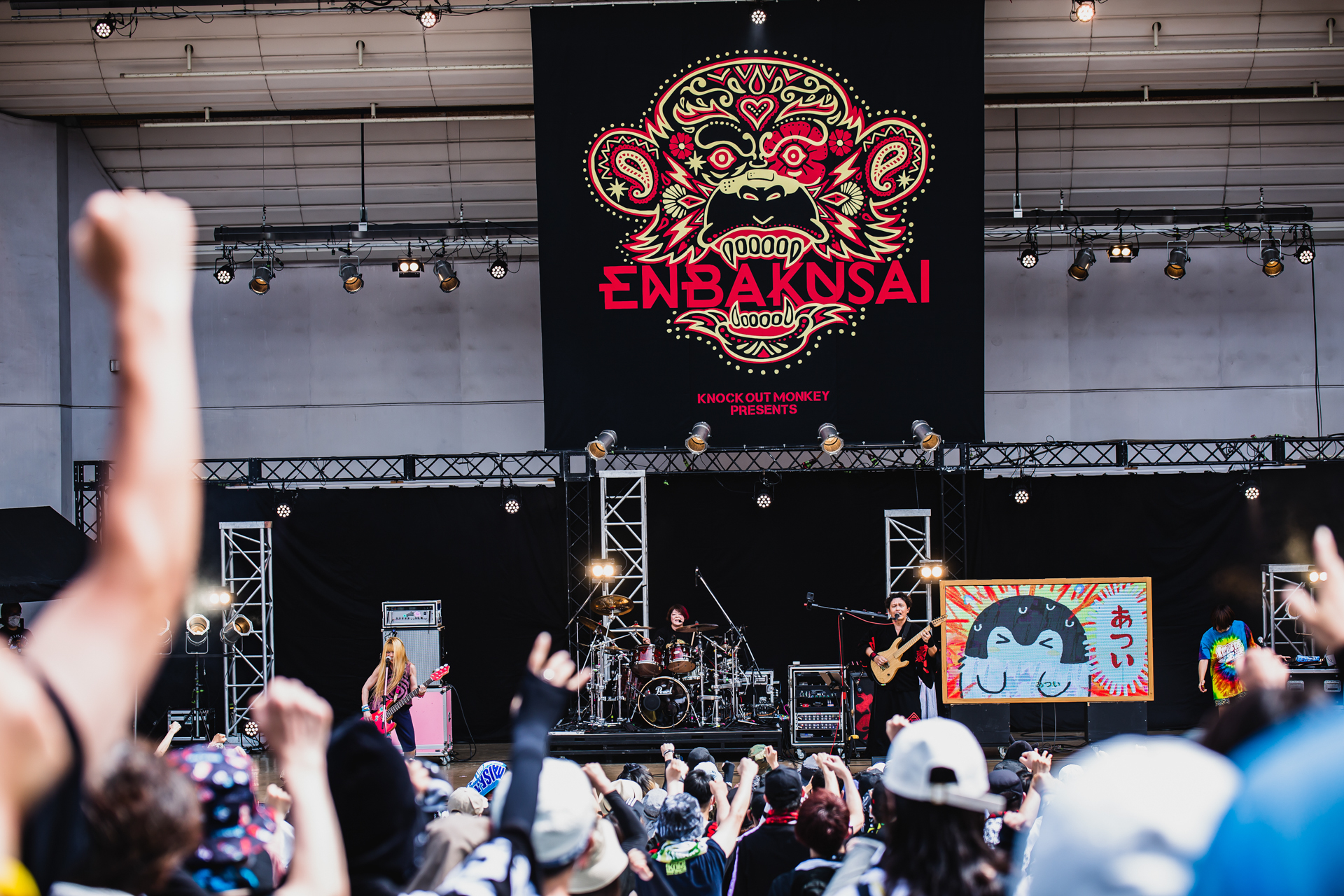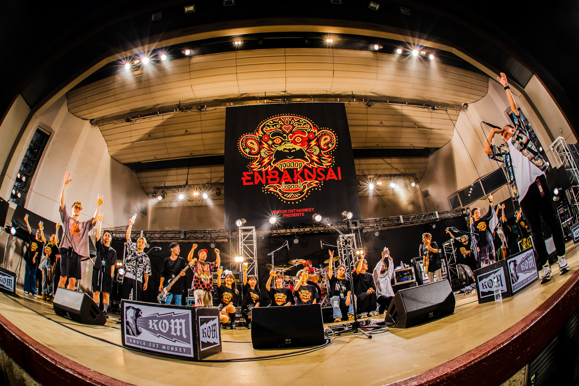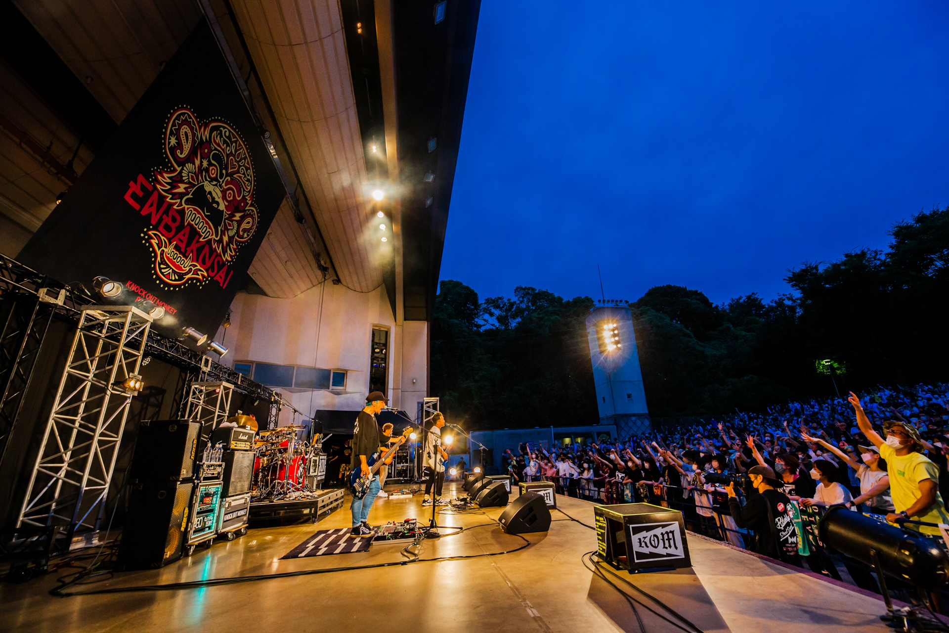 神戸の暴れ猿、KNOCK OUT MONKEY(以下、KOM)が、2004年より地元・神戸のライブハウスでスタートしたイベント『猿爆祭』(ヨミ:エンバクサイ)が、コロナ禍で開催出来ない年月を経て、7月18日(月・祝)大阪城音楽堂にて3年ぶりに開催! イベントの開催をおてんとさまも祝福してるのか、はたまたメンバーの普段の行いが良いのか、「一日雨が降る」という天気予報はざまぁみろの大ハズレ。開演時間を目前に雨が降る様子は全くなく、じんわり汗がにじむくらいの暑さに時々涼しい風が吹き、木々からはミンミンとセミの鳴き声が聞こえる大阪城音楽堂は、むしろ絶好の夏フェス日和! 2,000人の観客が会場を埋め尽くす中、ロックンロールな夏祭りの開幕です!!
