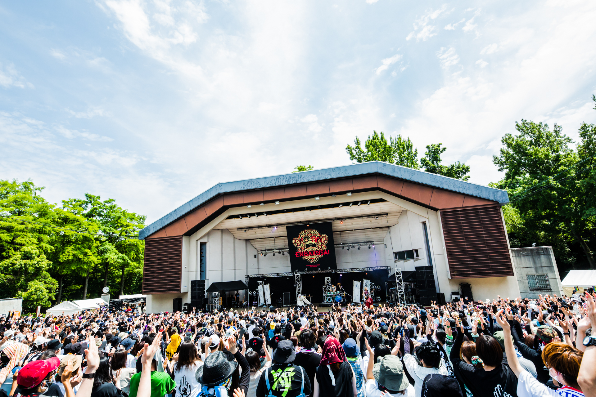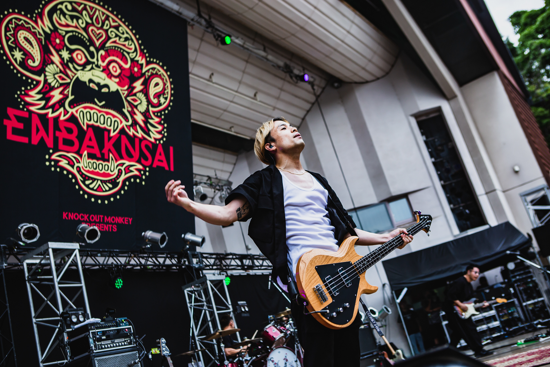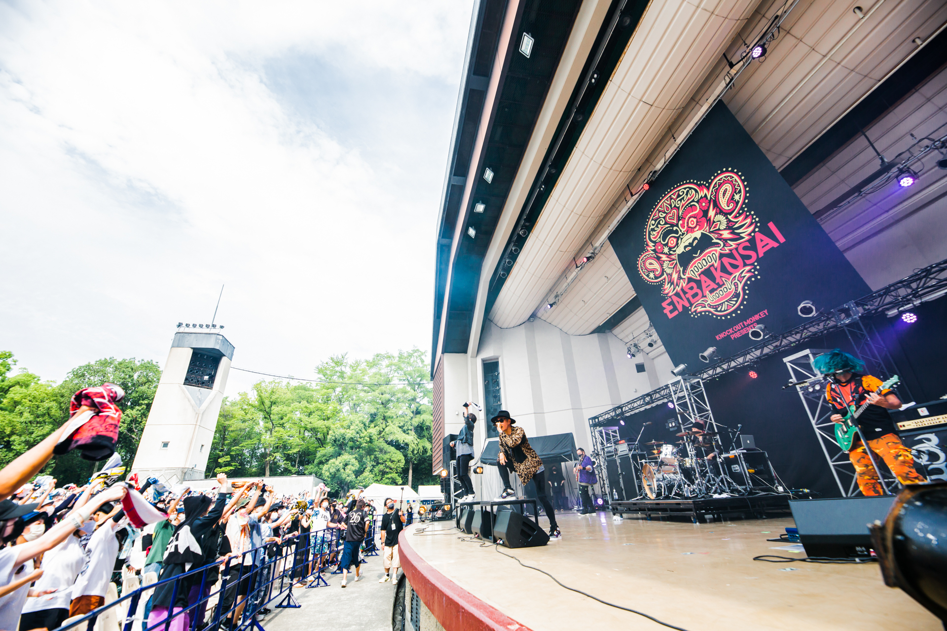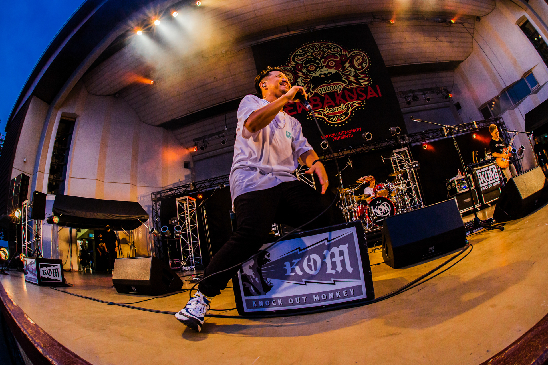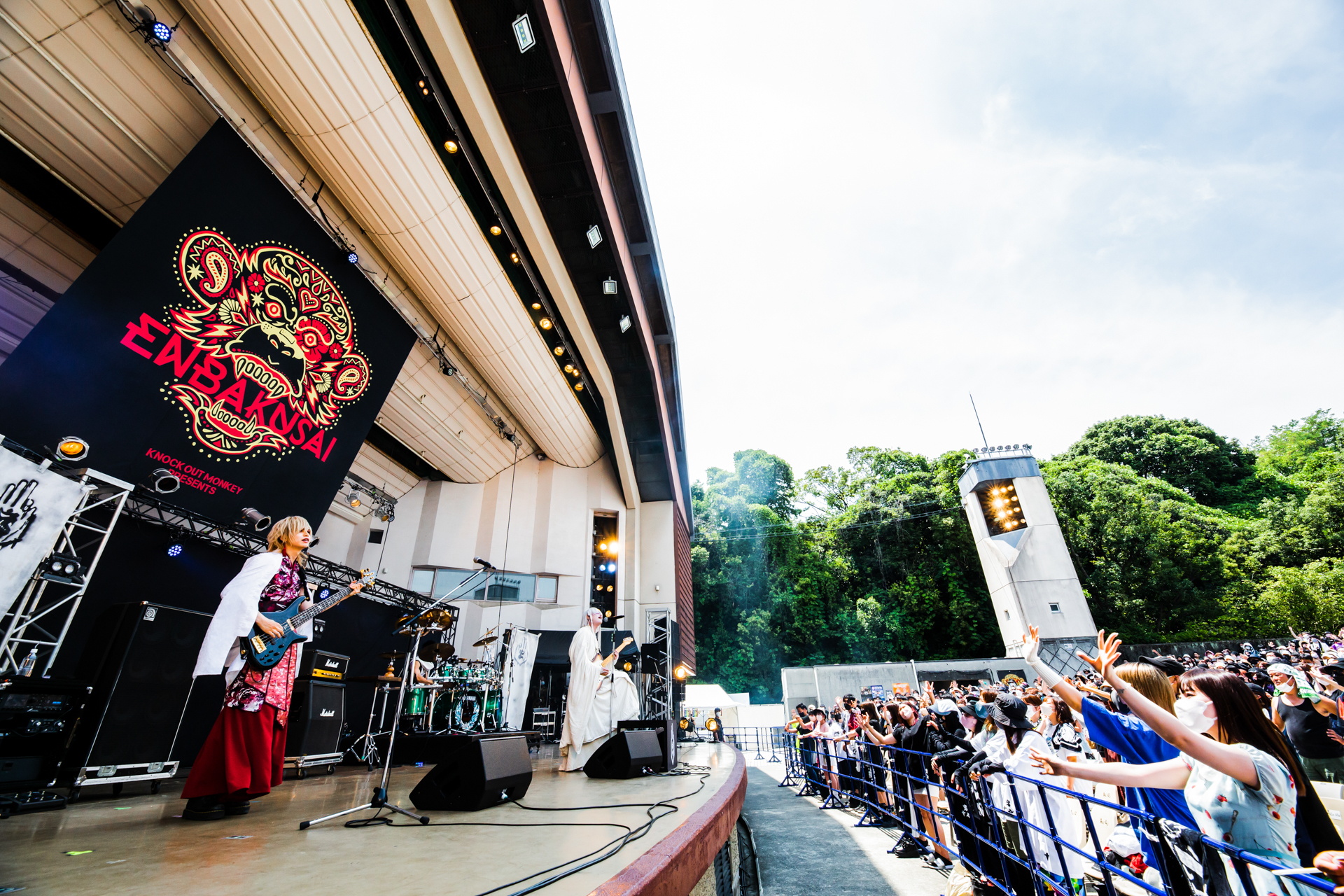 神戸の暴れ猿、KNOCK OUT MONKEY(以下、KOM)が、2004年より地元・神戸のライブハウスでスタートしたイベント『猿爆祭』(ヨミ:エンバクサイ)が、コロナ禍で開催出来ない年月を経て、7月18日(月・祝)大阪城音楽堂にて3年ぶりに開催! イベントの開催をおてんとさまも祝福してるのか、はたまたメンバーの普段の行いが良いのか、「一日雨が降る」という天気予報はざまぁみろの大ハズレ。開演時間を目前に雨が降る様子は全くなく、じんわり汗がにじむくらいの暑さに時々涼しい風が吹き、木々からはミンミンとセミの鳴き声が聞こえる大阪城音楽堂は、むしろ絶好の夏フェス日和! 2,000人の観客が会場を埋め尽くす中、ロックンロールな夏祭りの開幕です!!