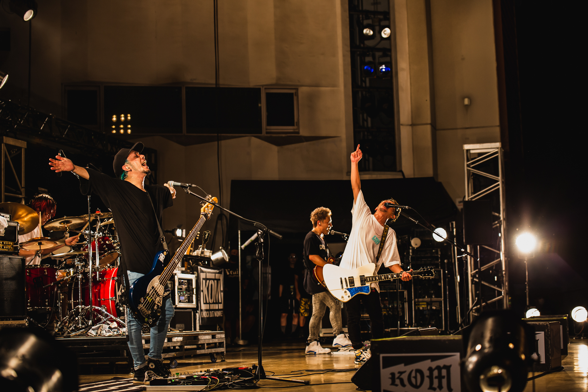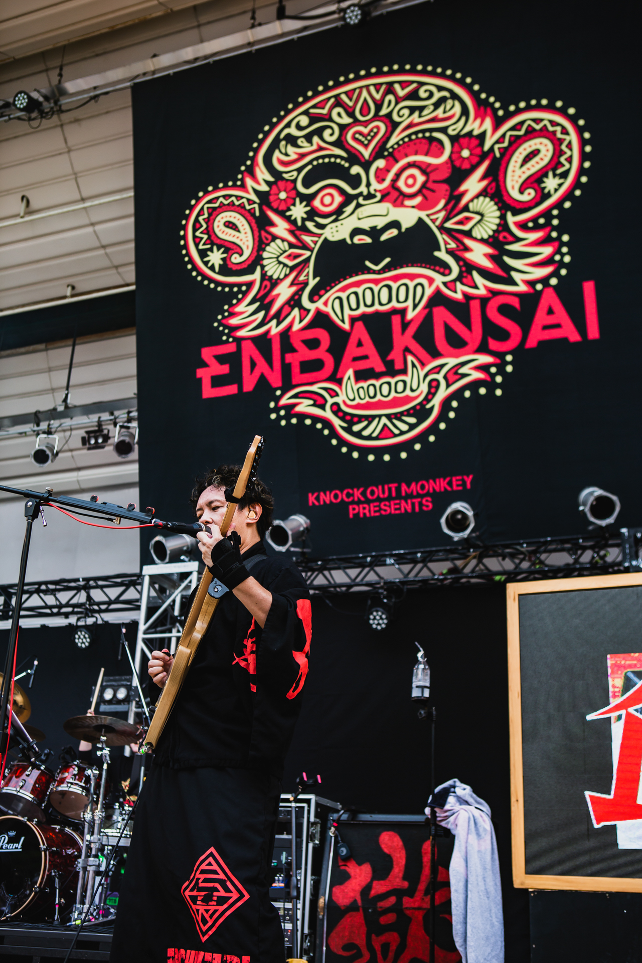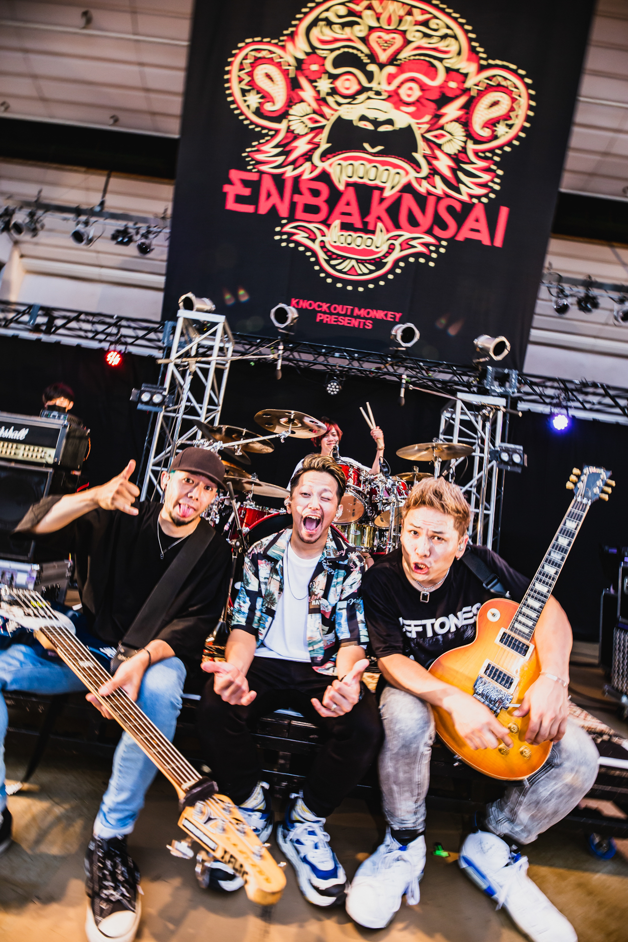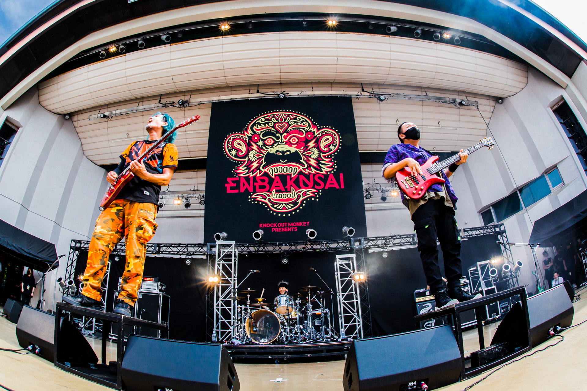 神戸の暴れ猿、KNOCK OUT MONKEY(以下、KOM)が、2004年より地元・神戸のライブハウスでスタートしたイベント『猿爆祭』(ヨミ:エンバクサイ)が、コロナ禍で開催出来ない年月を経て、7月18日(月・祝)大阪城音楽堂にて3年ぶりに開催! イベントの開催をおてんとさまも祝福してるのか、はたまたメンバーの普段の行いが良いのか、「一日雨が降る」という天気予報はざまぁみろの大ハズレ。開演時間を目前に雨が降る様子は全くなく、じんわり汗がにじむくらいの暑さに時々涼しい風が吹き、木々からはミンミンとセミの鳴き声が聞こえる大阪城音楽堂は、むしろ絶好の夏フェス日和! 2,000人の観客が会場を埋め尽くす中、ロックンロールな夏祭りの開幕です!!