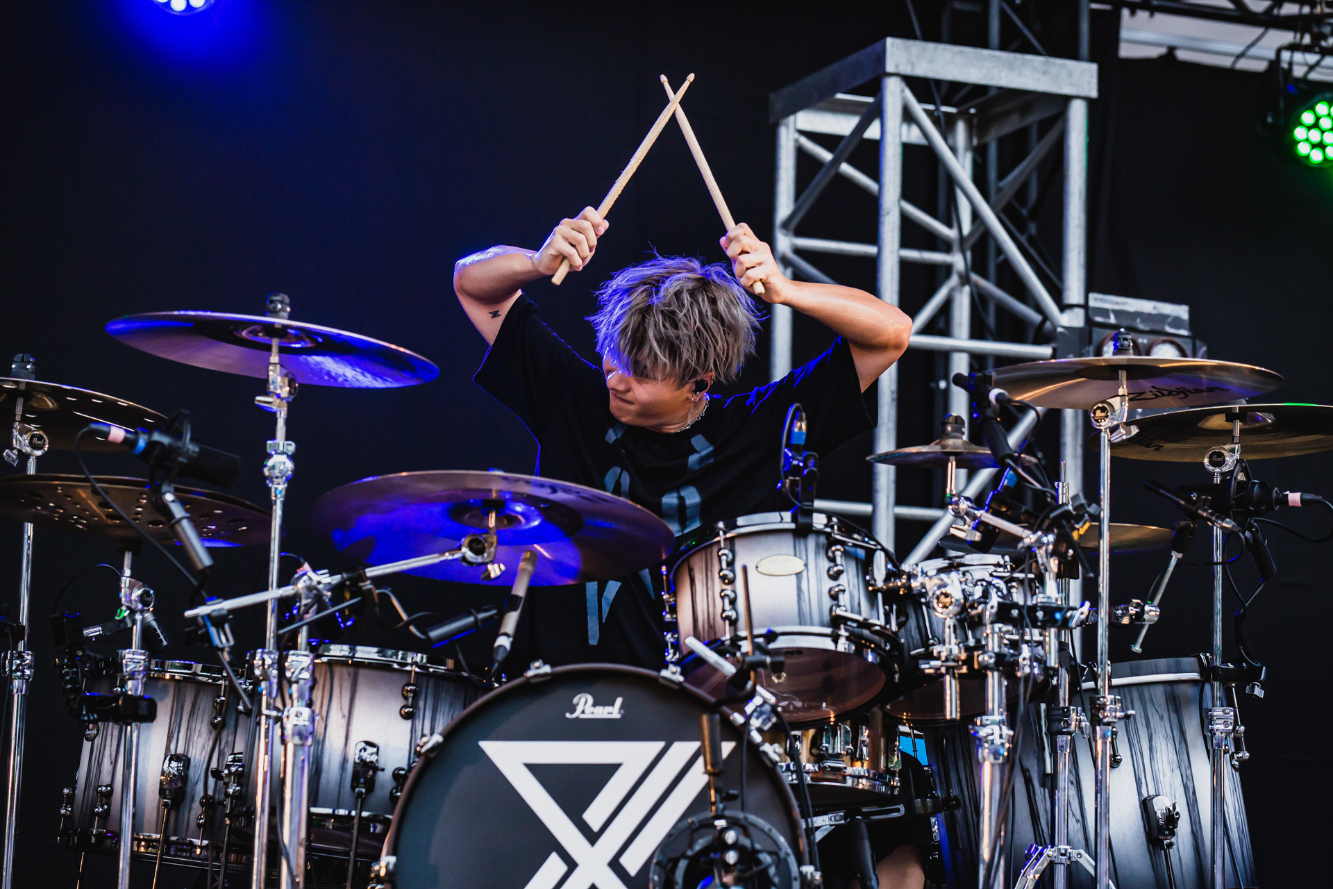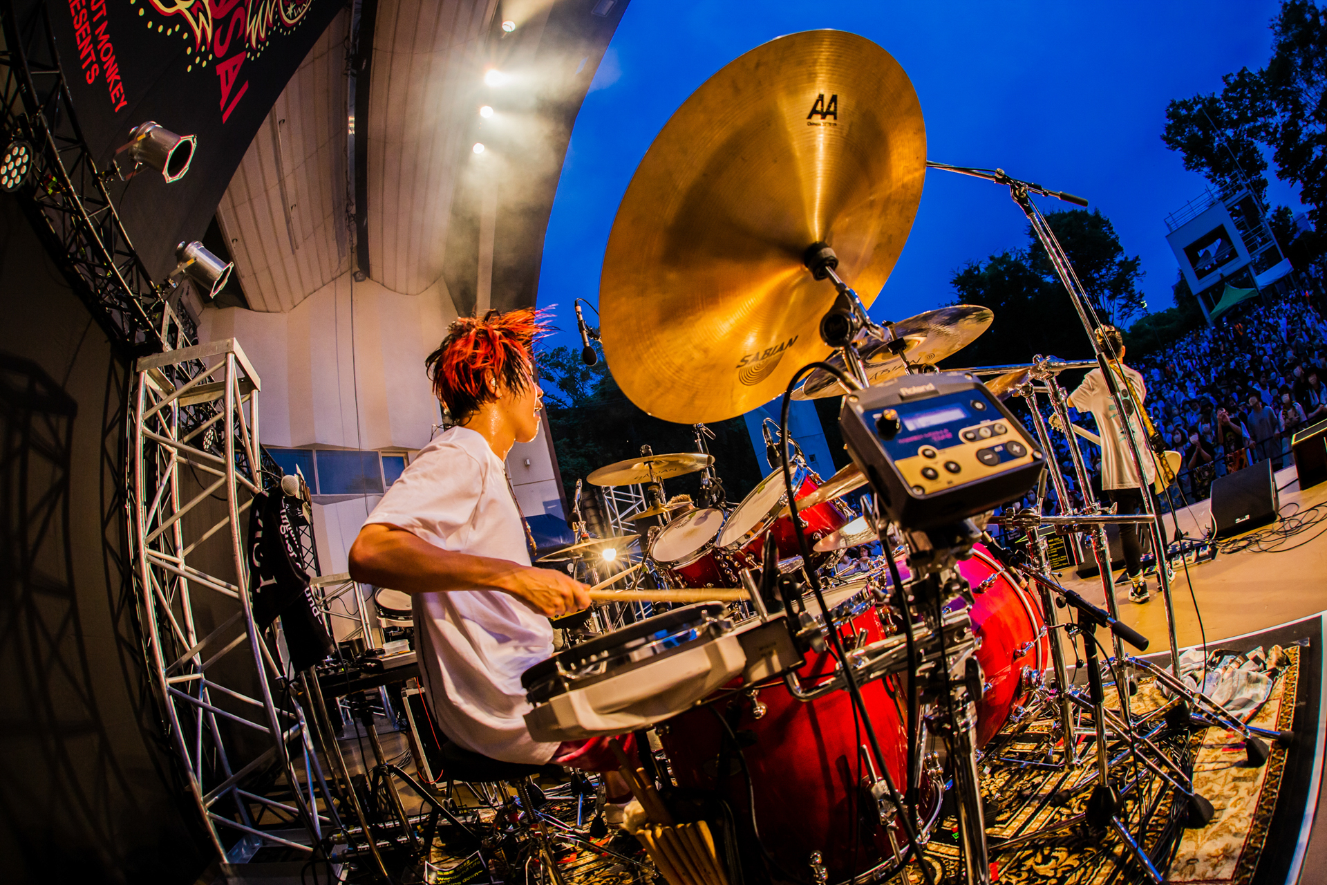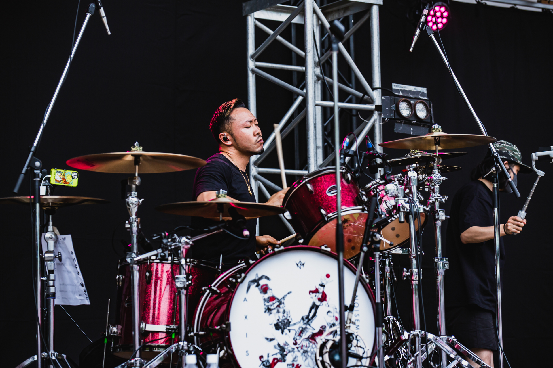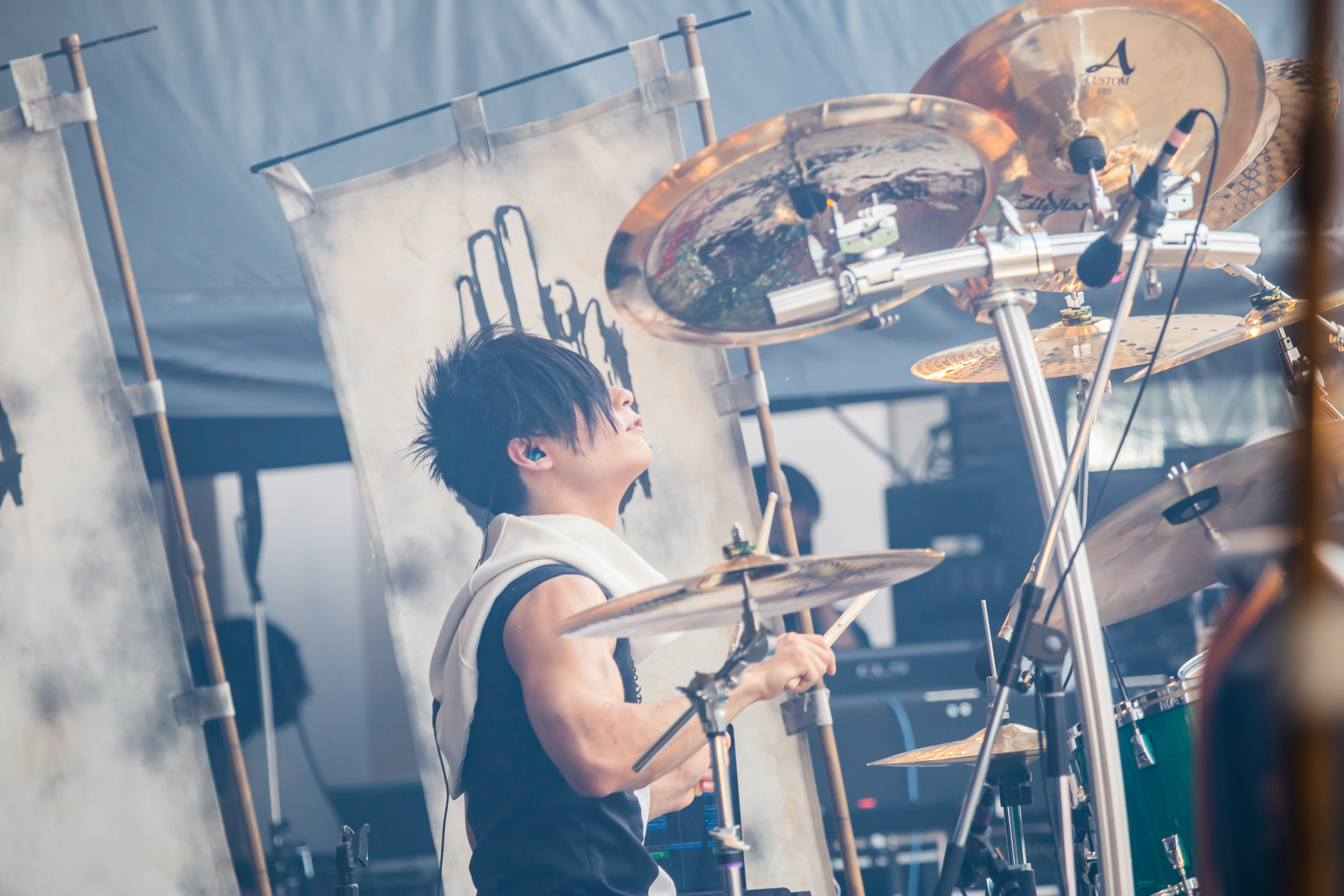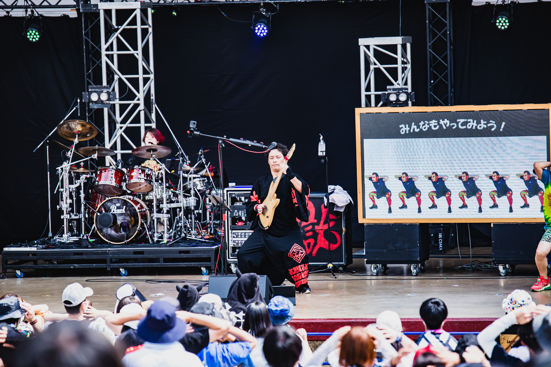 龍矢(低音弦)と影丸(太鼓)の掲げるのぼりの奥から、白髪に白塗り、白装束姿の命(唄)がゆっくり登場。夏の野外ステージには不釣り合いだなと思ったのも束の間、1曲目「僕ノ旋律」でライブが始まると、優しく美しい唄と旋律が会場を包み込み、オーディエンスを圧倒した、-真天地開闢集団-ジグザグ。「大変な世の中だけど、燦然とした未来を作りましょうよ!」と前向きなメッセージで始まった「燦然世界」では、「お手を拝借」と手拍子を煽り、「立ち上がれ!」の歌詞に会場中がジャンプを合わせ、「ゴミはゴミ箱へ」では軽快なビートにオーディエンスが体を揺らし、会場中が手振りを合わせて大盛りあがり。