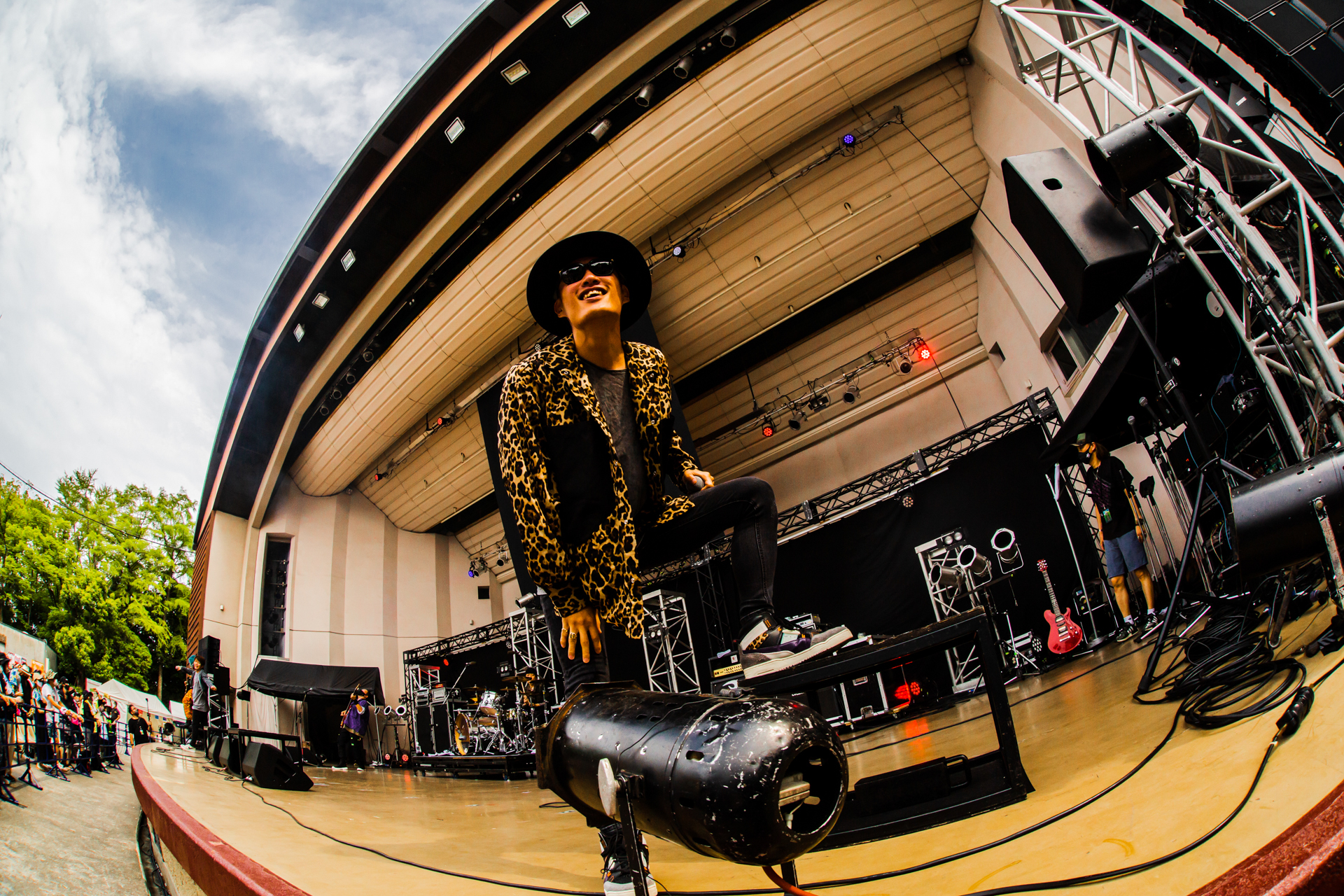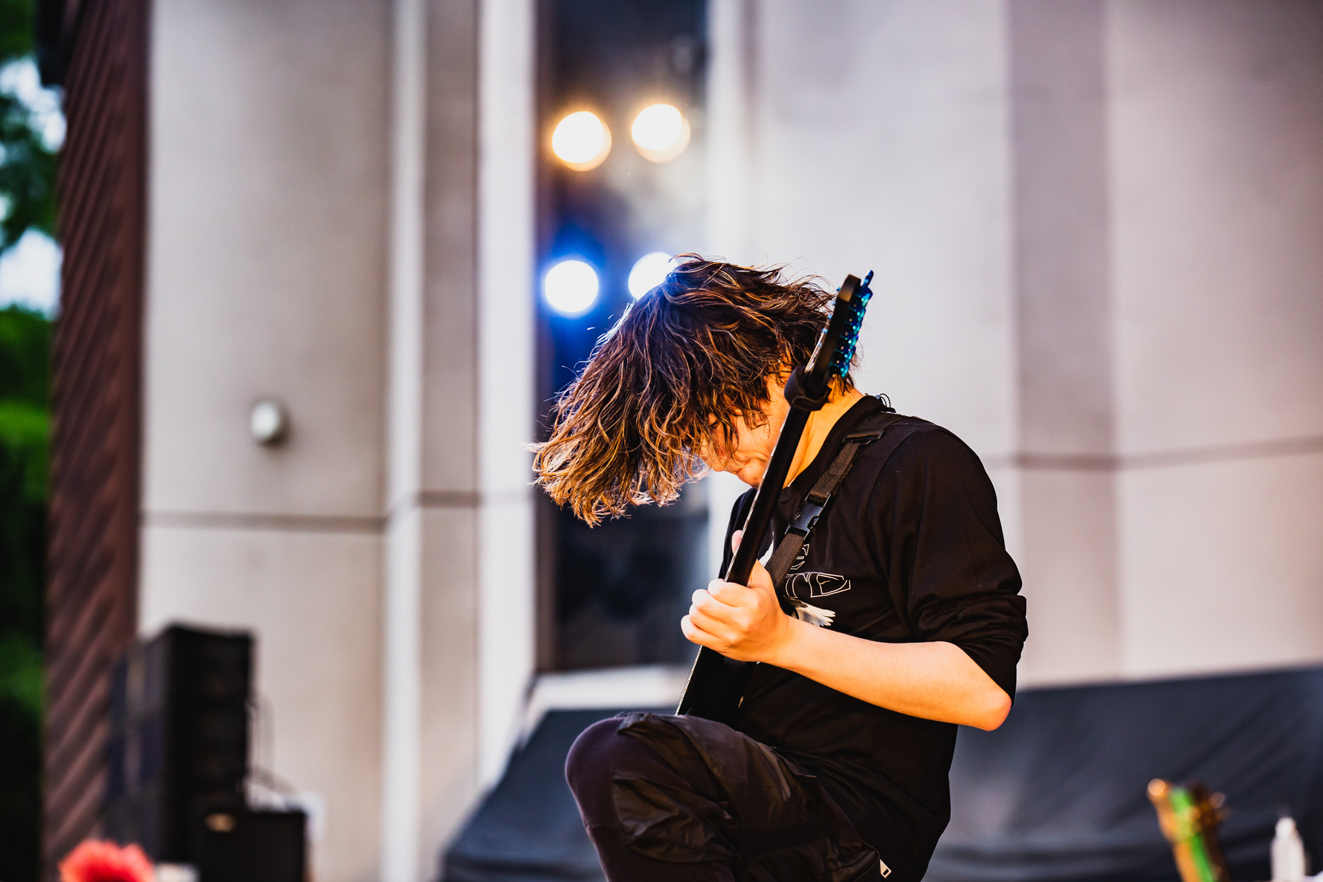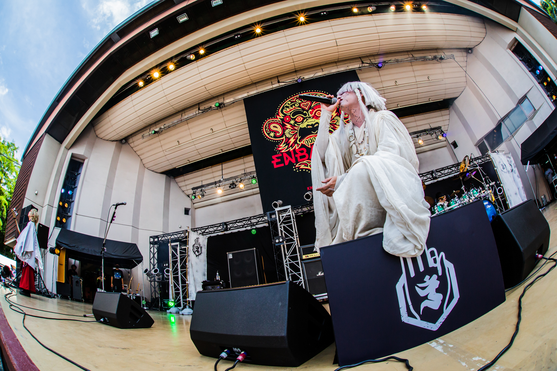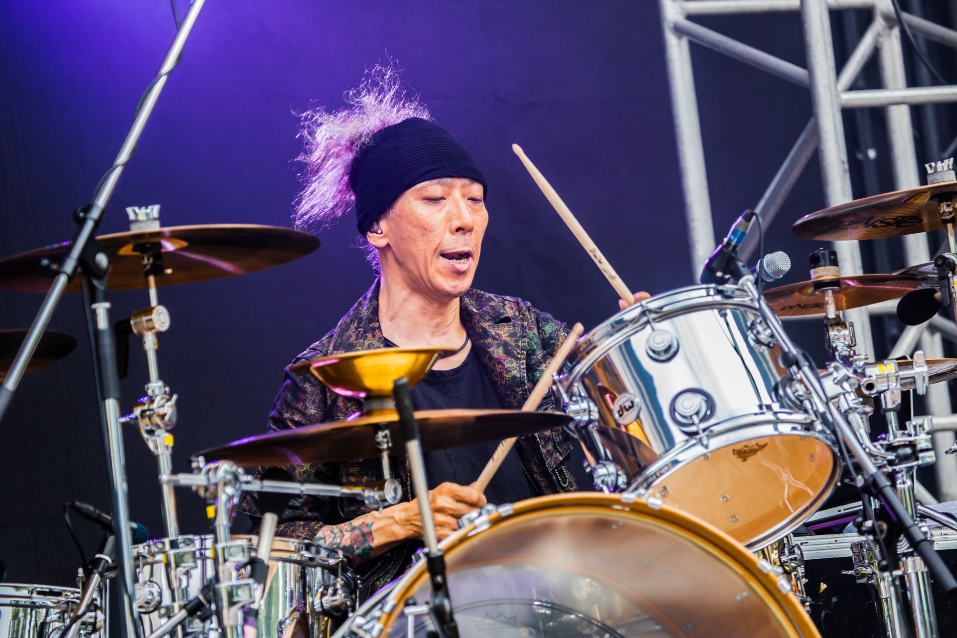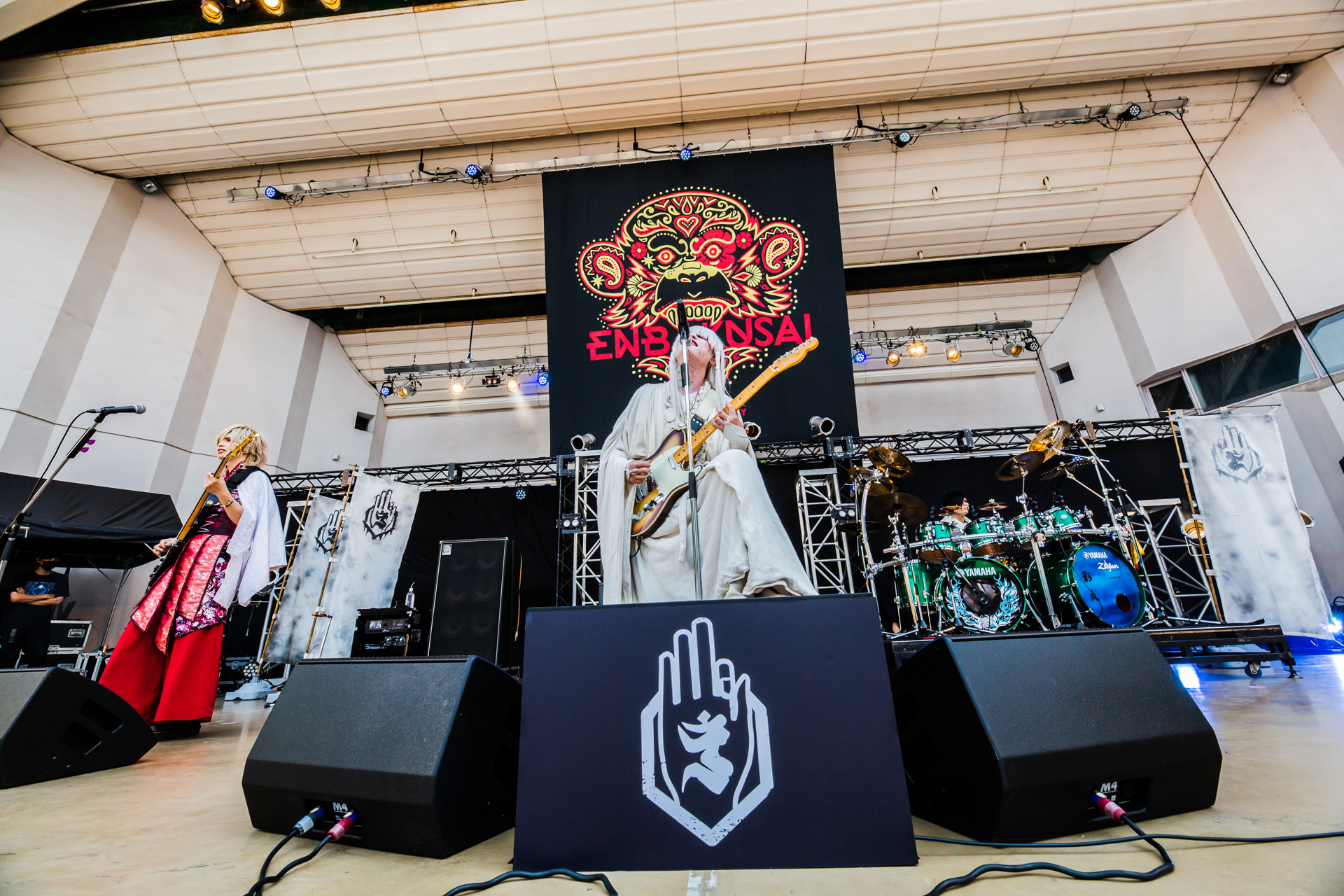 龍矢(低音弦)と影丸(太鼓)の掲げるのぼりの奥から、白髪に白塗り、白装束姿の命(唄)がゆっくり登場。夏の野外ステージには不釣り合いだなと思ったのも束の間、1曲目「僕ノ旋律」でライブが始まると、優しく美しい唄と旋律が会場を包み込み、オーディエンスを圧倒した、-真天地開闢集団-ジグザグ。「大変な世の中だけど、燦然とした未来を作りましょうよ!」と前向きなメッセージで始まった「燦然世界」では、「お手を拝借」と手拍子を煽り、「立ち上がれ!」の歌詞に会場中がジャンプを合わせ、「ゴミはゴミ箱へ」では軽快なビートにオーディエンスが体を揺らし、会場中が手振りを合わせて大盛りあがり。
