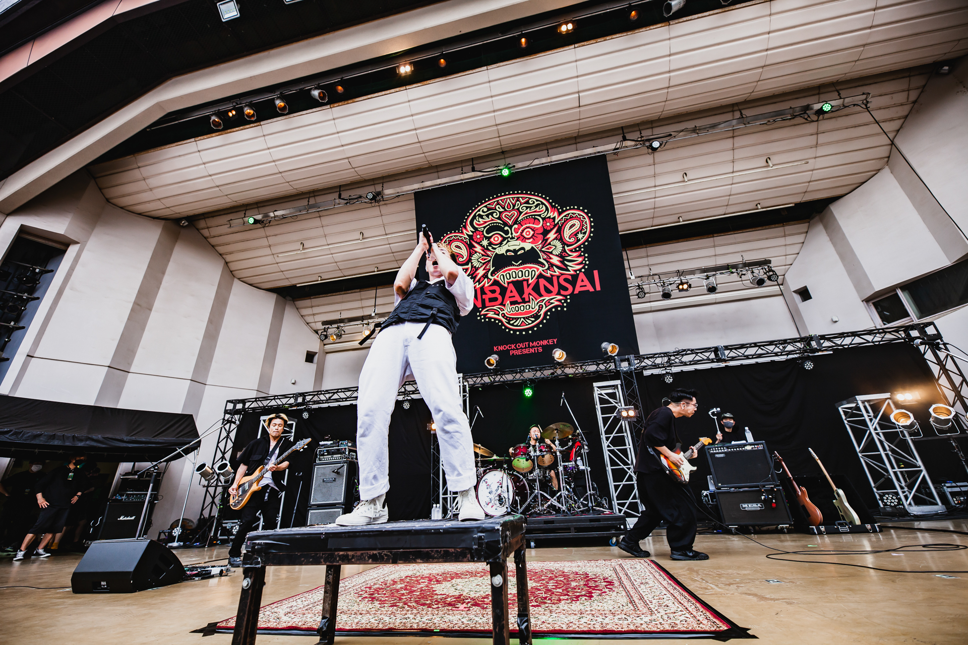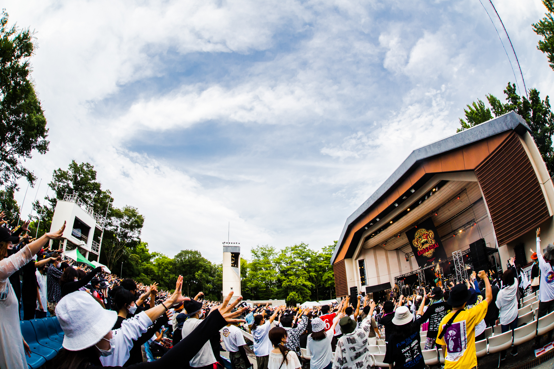 『猿爆祭』仕様に歌詞を変えた、OPナンバー「新型コロナウイルスが憎い」のたくましく堂々とした演奏に会場中から拳が上がり、ど頭から会場中の気持ちをひとつにしたのは、打首獄門同好会。「ウォーミングアップを兼ねて、スクワットをしましょう!」と全員でスクワットを合わせるバカバカしい風景を生んだ「筋肉マイフレンド」、コロナ禍で地味な生活を強いられる全ての人を応援する「地味な生活」と続き、オーディエンスの笑顔と共感と生み、会場の一体感をより強固にしていく彼ら。そう、打首獄門同好会はいつだって、僕らの味方なのだ。大澤敦史(Vo&Gt)が「今日、雨だと思ってませんでした? いま、ステージの気温35℃ですよ!?」と語りかけるようにMCをすると、「急遽、セットリストを変えました」と夏の始まりにピッタリな「なつのうた」、3連休明けの出勤を憂慮した「はたらきたくない」を披露。