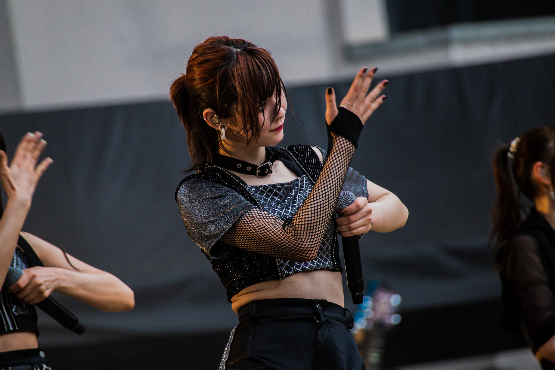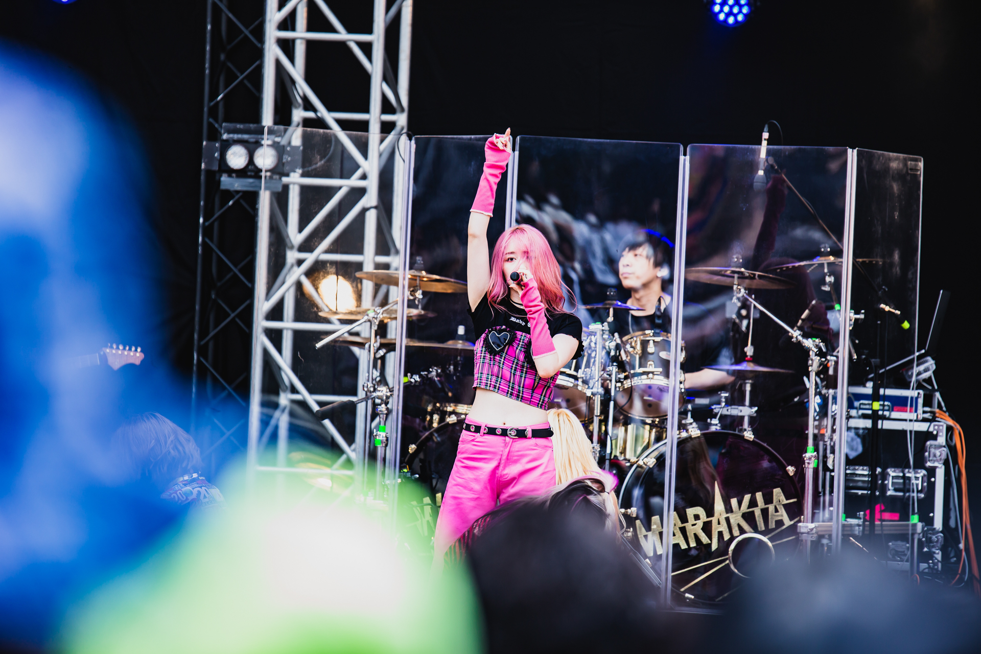 トップバッターは、我儘ラキア。<RAKIA in the house>の掛け声と手拍子に合わせてステージに登場し、客席の熱気をじわじわと上げたクールなOPナンバー「GIRLS」で始まると、「日本で一番攻めてるアイドルです!」と星熊南巫が力強く宣言。たくましいバンドサウンドに乗せた「why?」、「New World」のパワフルなボーカルやラップとキレキレのパフォーマンスで、日本一攻めてるアイドルを体現。初めて観る人の心もガッツリ掴んだところで、「一緒に踊ろうぜ!」と川﨑怜奈が呼びかけて始まった「Leaving」は、会場中が手振りを合わせてオーディエンスのテンションも爆アガリ! さらに「まだライブで一回もやったことない新曲です」と、初披露と思えない息の合ったダンスで魅せた「SWSW」、新たな代表曲と言える「GR4VITY G4ME」と、最新EP『ONYX』収録の新曲で最新型のラキアを見せつけると、「自分たちを信じ続けてやってきて、こんな素敵なバンドとこんな素敵なイベントに出れた。