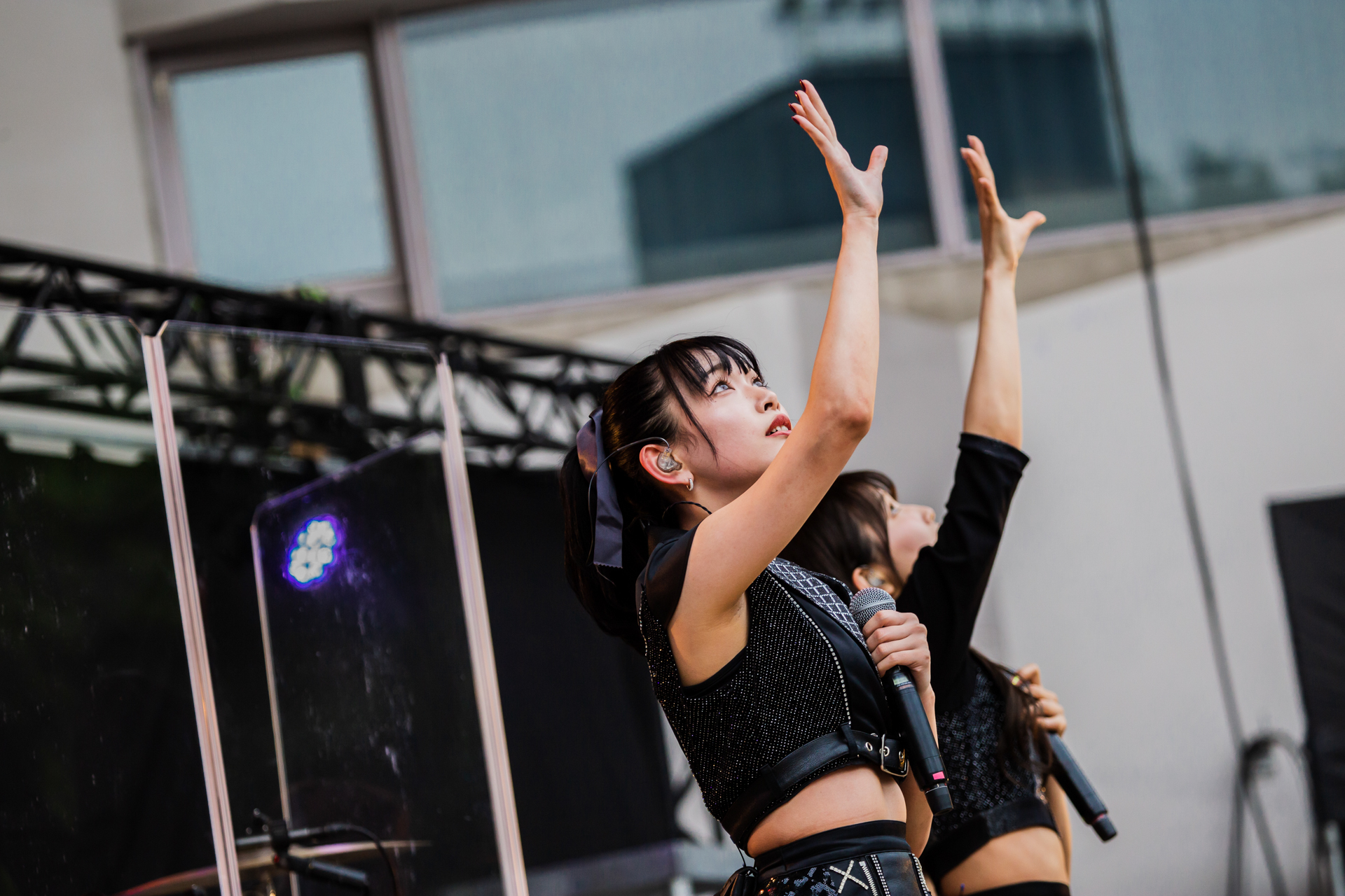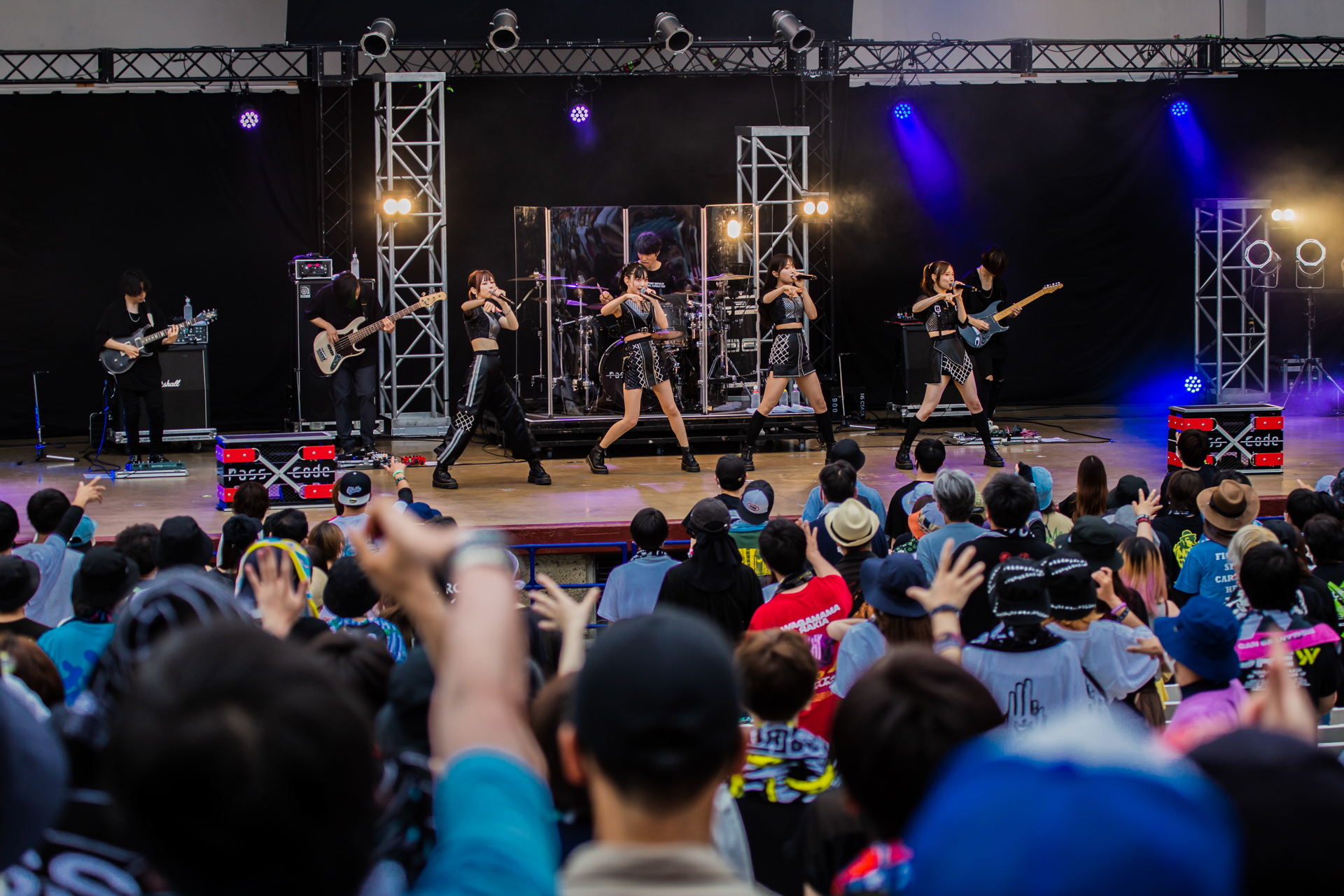 SEと手拍子に迎えられ、ステージに凛とした姿と表情で、堂々と登場したPassCode。「PassCode、はじめます」とクールに言い放ち、「ATLAS」でライブがスタート。ポップで軽快な曲調、キュートで透明感あるボーカルに笑顔のオーディエンスから手拍子が起きる中、有馬えみりのシャウトが平穏な空気を一変。さらにヘヴィで攻撃的なバンドサウンドと有馬の邪悪なシャウトで始まる「Taking you out」は予測不能な展開が、PassCodeを初めて観る人の興味を煽る。続く「Seize Approaching BRAND NEW ERA」では、曲中にKOMの亜太がステージに乱入。ただの冷やかしかと思いきや、お立ち台に立って完璧なダンスを披露。PassCodeへの愛を感じる完コピぶりに、ファンから大きな拍手が起きる!