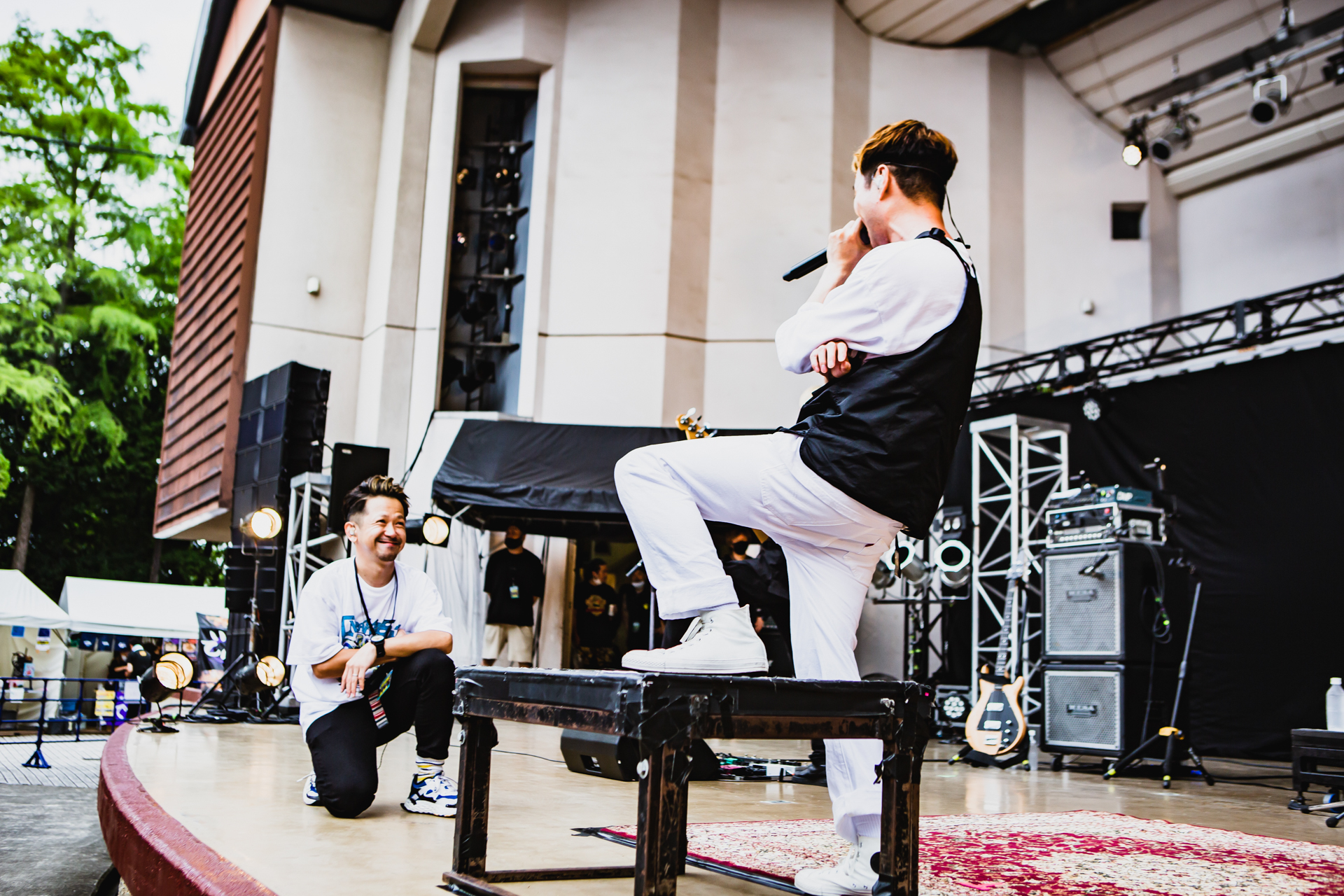 最高潮の盛り上がりを見せる会場に、これで終わりかと思いきや。「わがまま言っていい?」と、この日の出演者をステージに呼び込んだw-shun。「乾杯~~!」の合図で始まったのは、この日のために作った新曲「Summer Days」。軽快で痛快なサマーソングに体を揺らし、クラップを合わせる出演者とオーディエンス。会場を包み込む最高にハッピーでピースフルな空気に、みんなが晴天のサマーデイズの終わりを名残惜しむ中、『猿爆祭』は大団円で終演した。