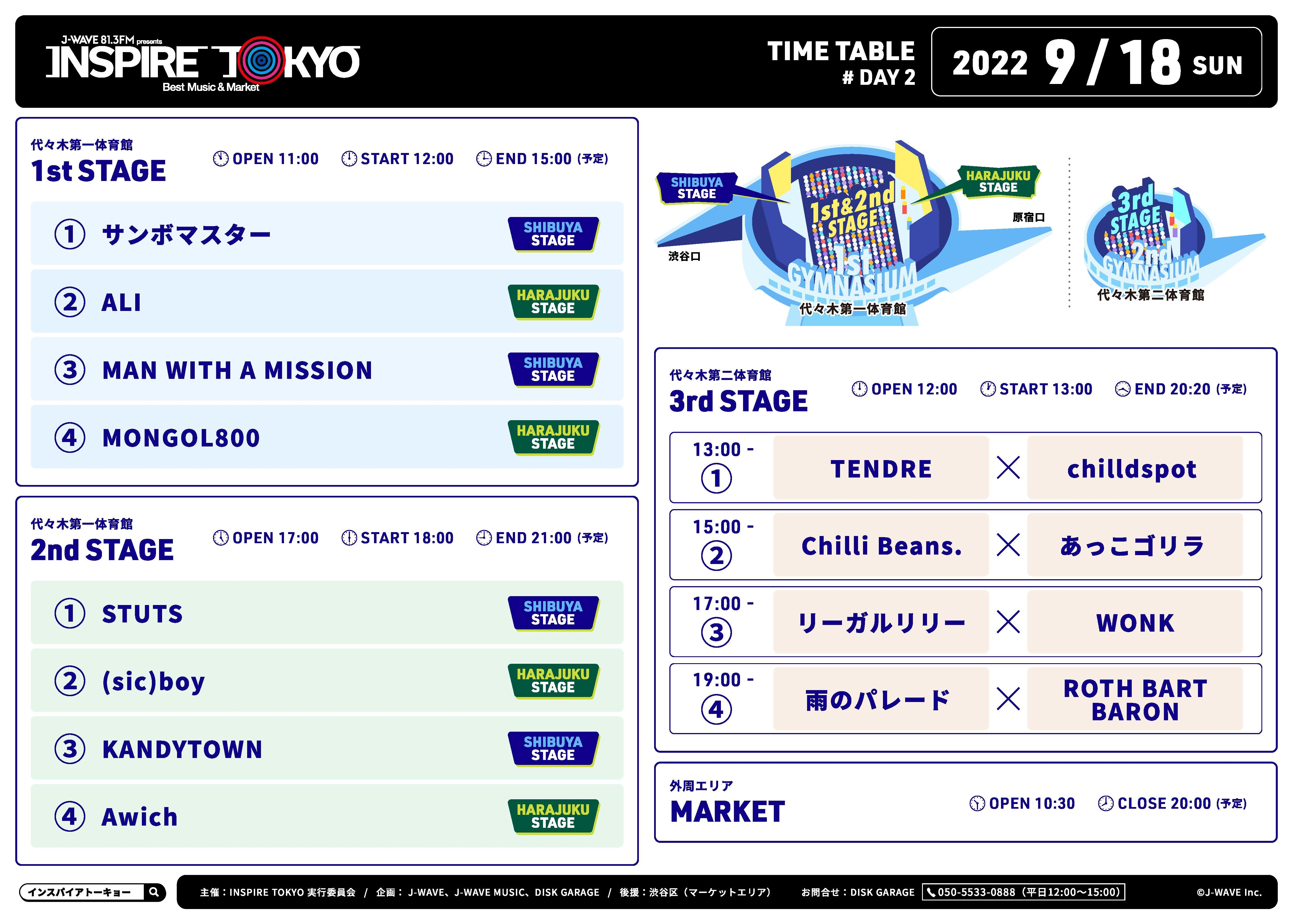 東京のど真ん中で、音楽・マーケット・食が楽しめる都市フェス『J-WAVE presents INSPIRE TOKYO ~Best Music & Market』が、9月17日(土)、18日(日)、19日(月・祝)の3日間、国立代々木競技場(第一体育館、第二体育館、外周エリア)で初開催となる。今回、最終追加アーティストとタイムテーブルが発表された。