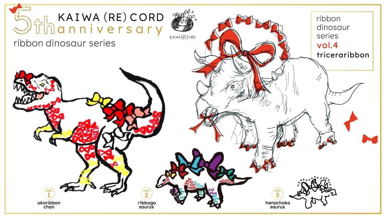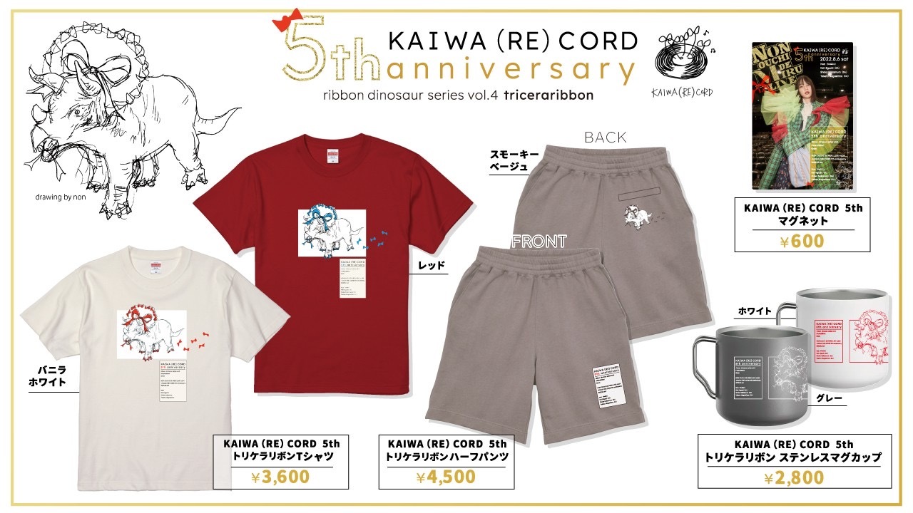 また、8月6日(土)の、“おうちで観る”ライブリハ現場より届いた、撮って出しの5周年お祝い写真も初公開。さらに、non ribbon dinosour seriesの第4弾となるのんオリジナル恐竜キャラクター「トリケラリボン」が公開された。KAIWA(RE)CORD5周年を記念した今回の「のんおうちで観るライブ」のグッズも公開。