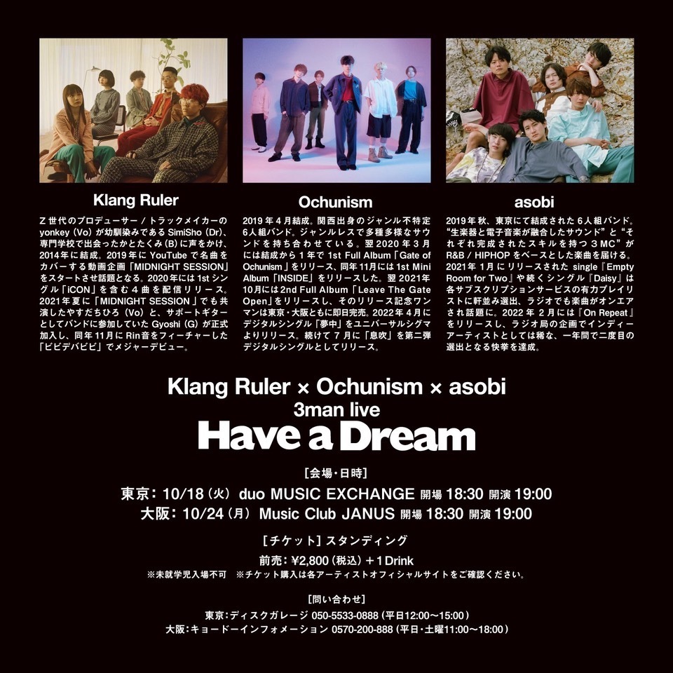 Klang Ruler、Ochunism、asobiの新世代バンドグループ3組が、10月に東京・大阪でスリーマンライブを開催する。