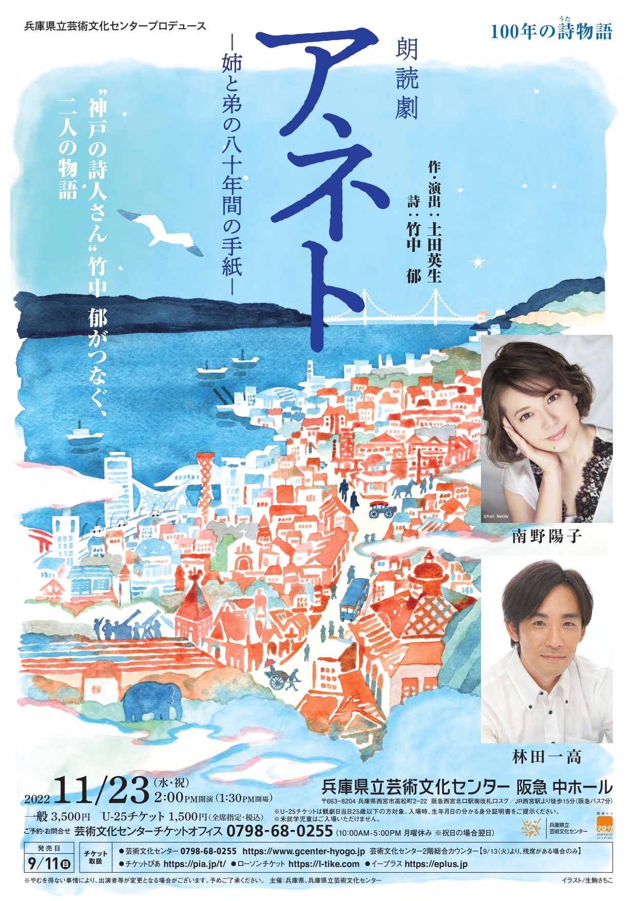 兵庫県立芸術文化センターが、詩をモチーフにした作品を生み出す企画「100年の詩物語」を始動させ、その第1回として11月23日(水・祝)に、竹中郁の作品からインスパイアされた朗読劇『アネト~姉と弟の八十年間の手紙~』を開催すると発表した。作、演出は土田英生が務め、南野陽子と林田一高が出演する。