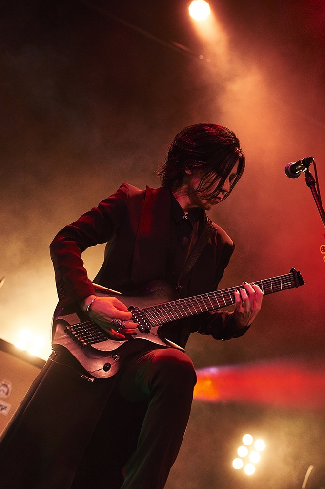 葵(Gt)のアルペジオから静かに開幕を告げたのは、初日と同じく「BLINDING HOPE」。レーザー光線が飛び交う刺激的な演出もヘッドバンギングを繰り出すフロアの熱狂も初日と同じであるにもかかわらず、どことなく温かな安心感があるのは、12公演で5人とファンが培ってきた“信頼”のなせるわざなのだろう。そのままシームレスで続いた「ROLLIN'」で湧き起こるクラップもウェルカム感たっぷりで、初っ端から高まる一体感にRUKIも「Oh Yeah Tokyo!」と歓喜。そんな一種和やかな空気の中で、今年20周年を迎えたthe GazettEというバンドの真髄を見せられたのが3曲目の「GUSH」だ。冒頭で麗(Gt)が鳴らすはずのギターの音が出ないというレアなシーンに拍手が湧き、RUKIも「おい、(機材)トラブルじゃねぇよな?」と疑問顏。「やっちゃって!」と再開を促すものの、今度は上手くタイミングが合わず「3曲目なんだけど、まだカッコつけてるんだけど……どうした、大丈夫か? カウント聞いてから入らなきゃ、戒(Dr)くんは(音を)止めなきゃ」と注意するRUKIの顏には、怒りも焦りもなかった。場内は笑いに包まれ、申し訳なさそうにする麗に「可愛い!」の声まで飛ぶが、RUKIの「お前らの記憶、消します」という宣言から完璧な激アツ空間を展開するあたり、まさしく三度目の正直といったところ。最後に“借りは返す!”とばかりに、エフェクティブなプレイで曲を締めくくる麗にも大きな拍手が贈られ、ハプニングを見事に切り返してみせた。裏を返せば、その自信があるからこそ不測の事態にも動じずにいられるのだろう。20年のキャリアの中であらゆる経験を重ねて、トラブルや“可愛い”を許容できる姿こそ、真の意味での“カッコよさ”なのだ。
