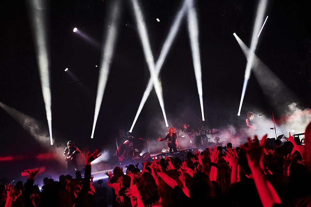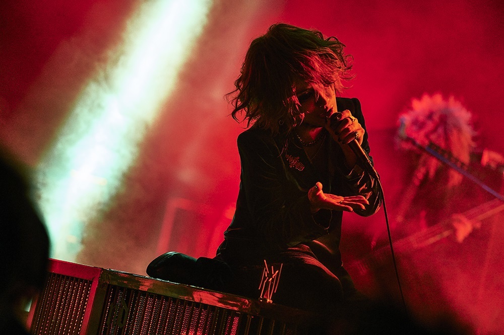 そんなポジティヴなMC以降、アルバム曲を軸に既存曲を効果的に織り込みながら、時に力強く、時に繊細な感情の発露で場内を魅了していく5人。公演ごとに微妙な曲順変更を加えながらも、基本的には同じ流れで練り込んできたセットリストだけに、それぞれの楽曲がより大きなスケールと高い浸透力で沁みわたってきたのも印象的だった。不穏さがどんどん折り重なっていく「裏切る舌」で、めいめい自由に暴れて身体を温めたオーディエンスは、続く「NOX」でRUKIと共に拳を振り上げて最高のグルーヴを実現。また、シャウトを封印しての低音ボーカルが妖艶な「Bath Room」では5人の紡ぐ音の緻密な構成が際立ち、「濁」では楽曲の壮大感と緩急の利いたプレイがスペクタキュラーな照明効果と呼応して、ドラマティックな曲世界を創り上げていく。5人の歌と演奏のみならず音響、照明、演出すべてを駆使して繋ぐ物語は美しく、ホールツアーのアドバンテージを活かし切ったステージングからも、20年選手の底力を感じさせられた。